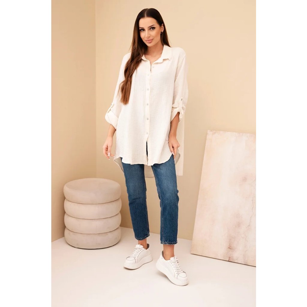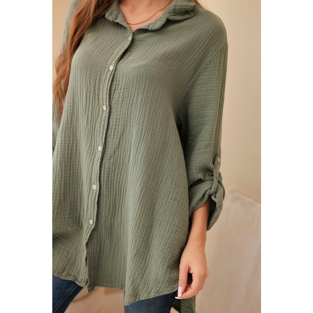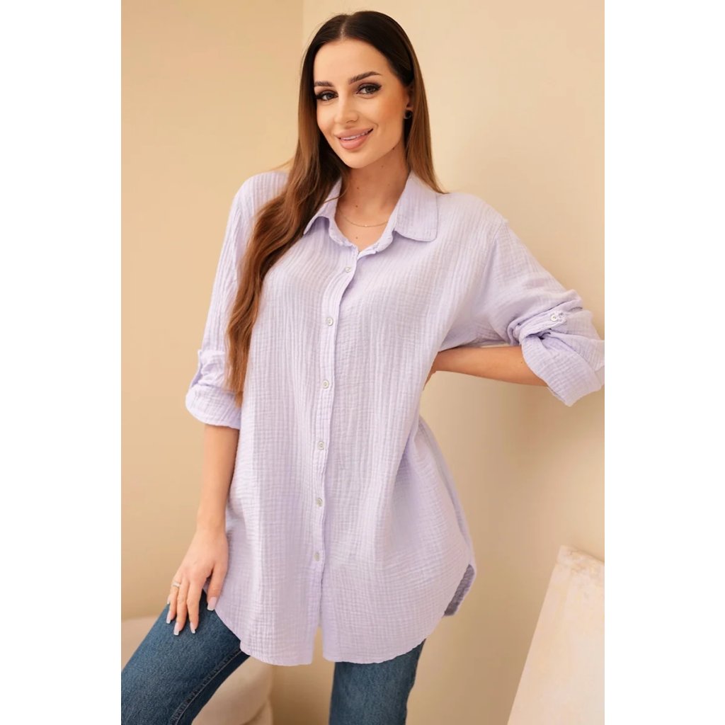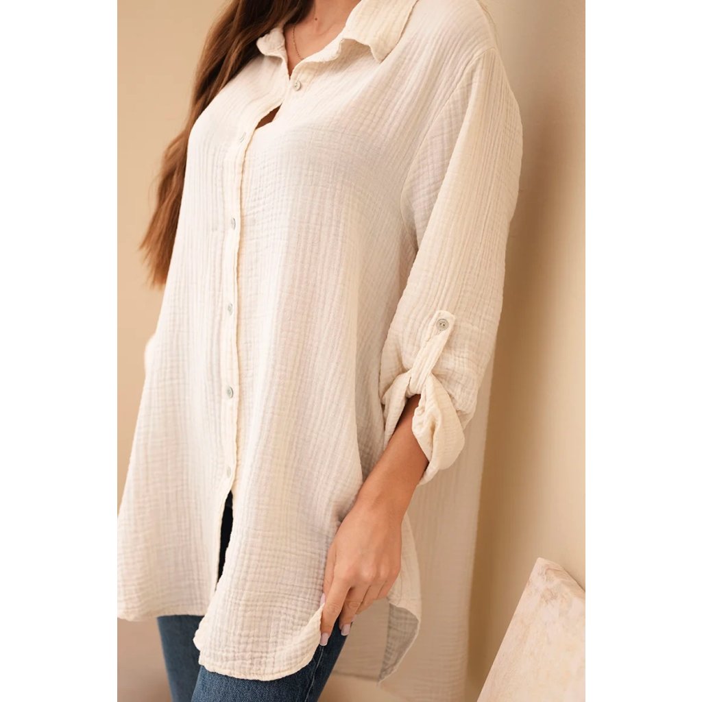 Mušelínová košeľa je esencia pohodlia a nadčasovej elegancie. Vyrobená z ľahkého, priedušného mušelínu, je ideálna na každé ročné obdobie, poskytujúc pohodlie nosenia a voľnosť pohybu. Jej univerzálny strih spôsobuje, že sa skvelo uplatní ako v ležérnych štýloch, tak aj vo formálnejších kombináciách. Jemná štruktúra materiálu dodáva subtílny šarm a starostlivé dokončenie zvýrazňuje vysokú kvalitu spracovania. Mušelínová košeľa je nevyhnutným prvkom šatníka pre osoby, ktoré oceňujú spojenie klasiky s moderným štýlom. Veľkosť je univerzálna a bude vhodná pre ženy s veľkosťou S, M alebo L.