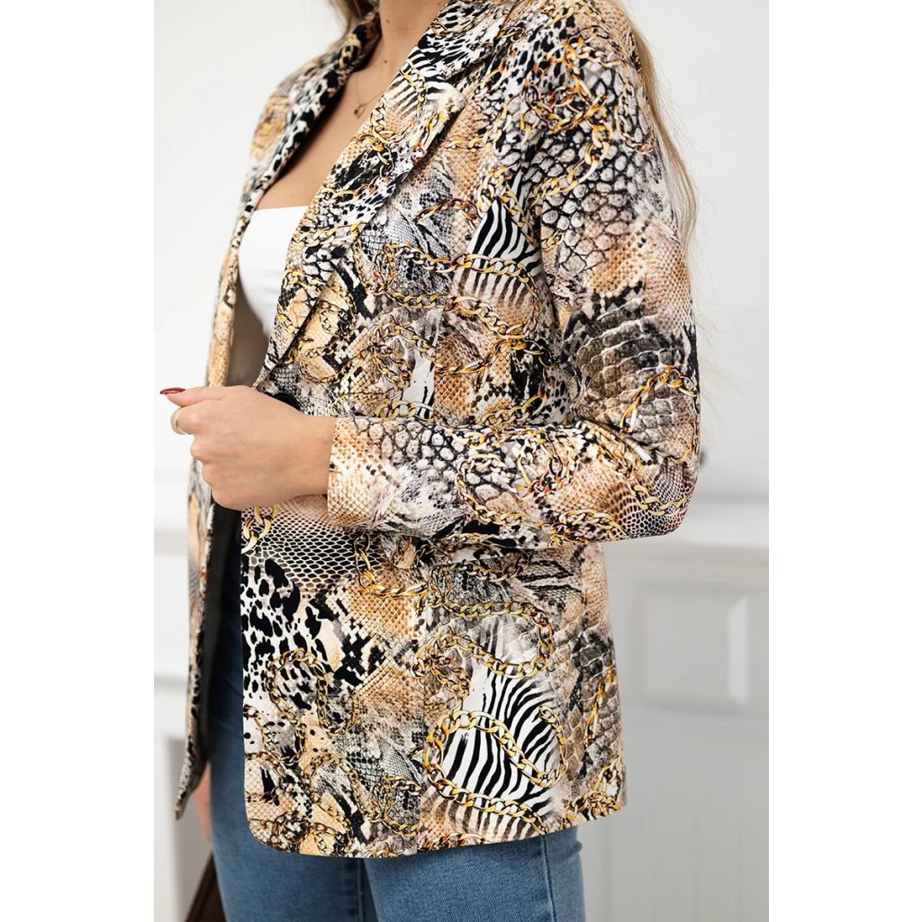 Bavlnené sako na gombík s potlačou je štýlovým prvkom šatníka, ktorý spája klasiku s nádychom modernosti. Vyrobené z vysoko kvalitnej bavlny, zabezpečuje pohodlie počas nosenia a je ideálne na celodenné nosenie. Unikátna potlač mu dodáva výrazný charakter, vďaka čomu vyniká na pozadí klasických modelov. Zapínanie na gombík zdôrazňuje elegantný strih a dobre strihaný strih sa skvele prispôsobí postave, zdôrazňujúc jej prednosti. Je to všestranná voľba na rôznorodé príležitosti – od ležérnych stretnutí po polformálne výlety. Skvele sa kombinuje s jednoduchými nohavicami aj džínsami, pridávajúc celkovému outfitu módny akcent. Ideálne pre ľudí, ktorí si cenia pohodlie a neobvyklý štýl. Sako má podšívku. Sako dostupné vo veľkostiach M, L, XL.