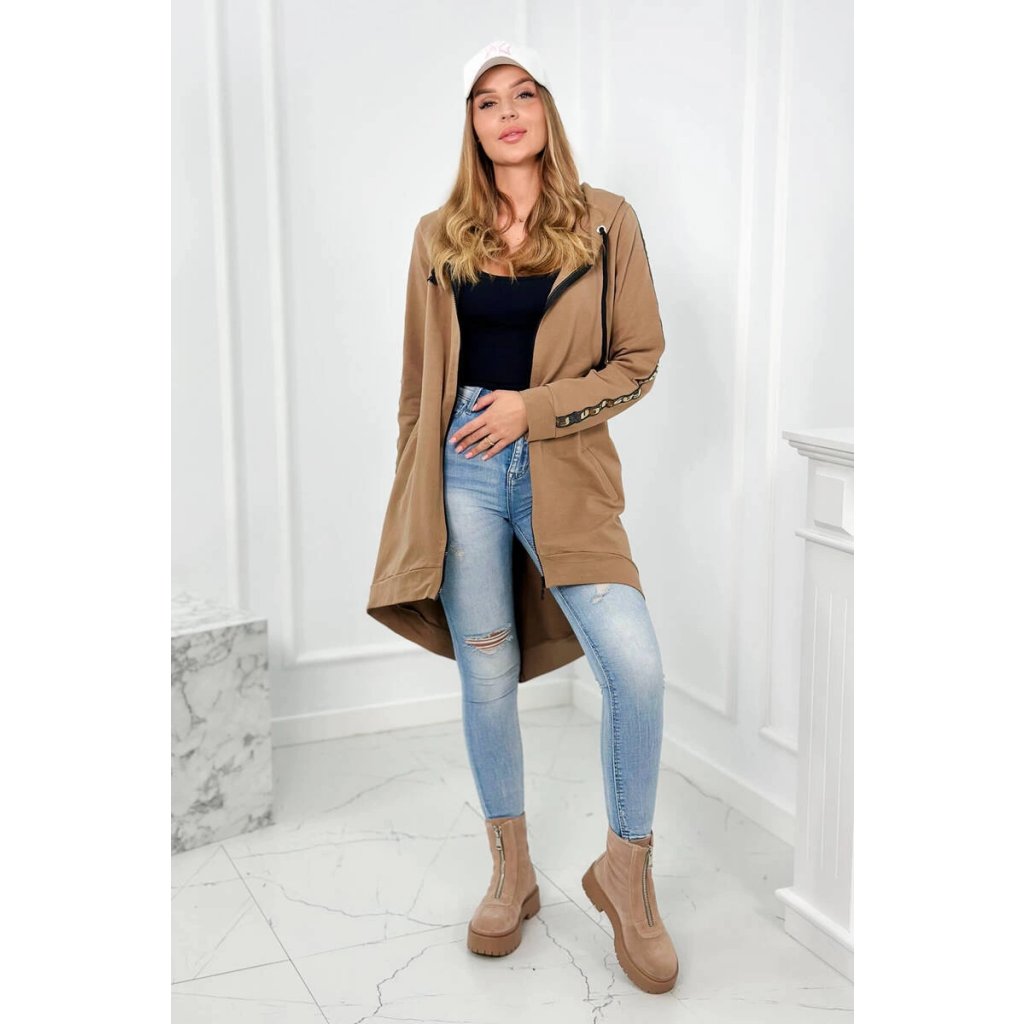 Predstavujeme vám pohodlnú dlhú mikinu s kapucňou. Mikina má zapínanie na zips a navyše zips na chrbte. Vrecká po bokoch a dve ozdoby vzadu. Mikina má našité pásky s nápisom fashion. Mikina je vyrobená z vysoko kvalitného materiálu. Veľkosť je univerzálna a bude vhodná pre dámy nosiace veľkosť S, M alebo L.