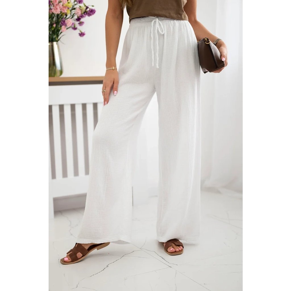 Objavte jedinečné nohavice vyrobené z jemného, vzdušného mušelínu, ktoré poskytujú nevídané pohodlie pri nosení aj v najteplejších dňoch. Ich široké nohavice dodávajú celku moderný, štýlový charakter, opticky predlžujú postavu a pridávajú outfitu ľahkosť. Ideálne na každý deň, do práce alebo na výnimočné príležitosti – tieto nohavice sa dokonale hodia k rôznym topom, od minimalistických tričiek, cez elegantné blúzky, až po svetre. Stavte na klasický, ale zároveň rafinovaný dizajn, ktorý vám umožní užívať si pohodlie aj nápaditý štýl. Veľkosť je univerzálna a vhodná pre ženy nosiace veľkosť S, M alebo L.
