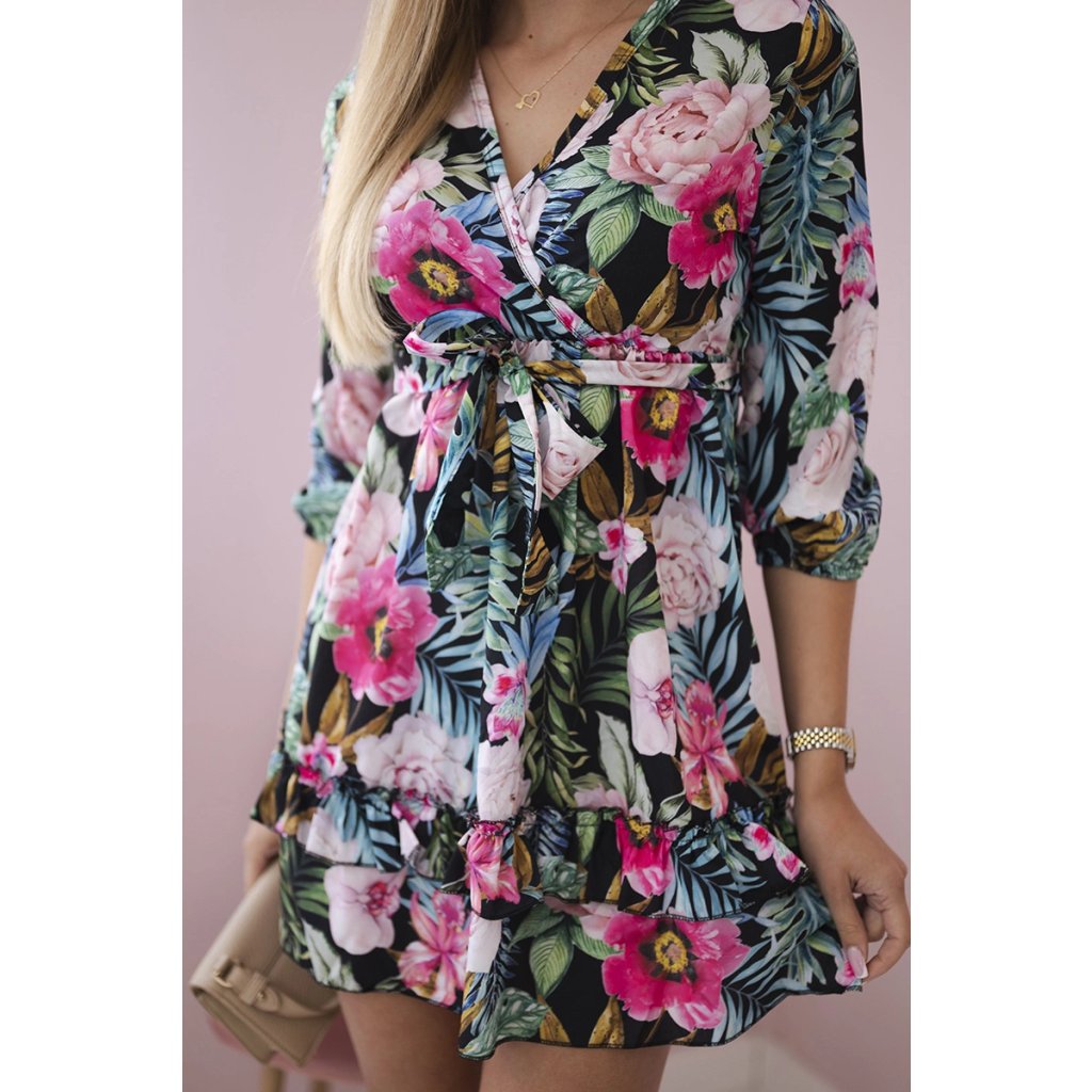 Čierne kvetované šaty s viazaním v páse