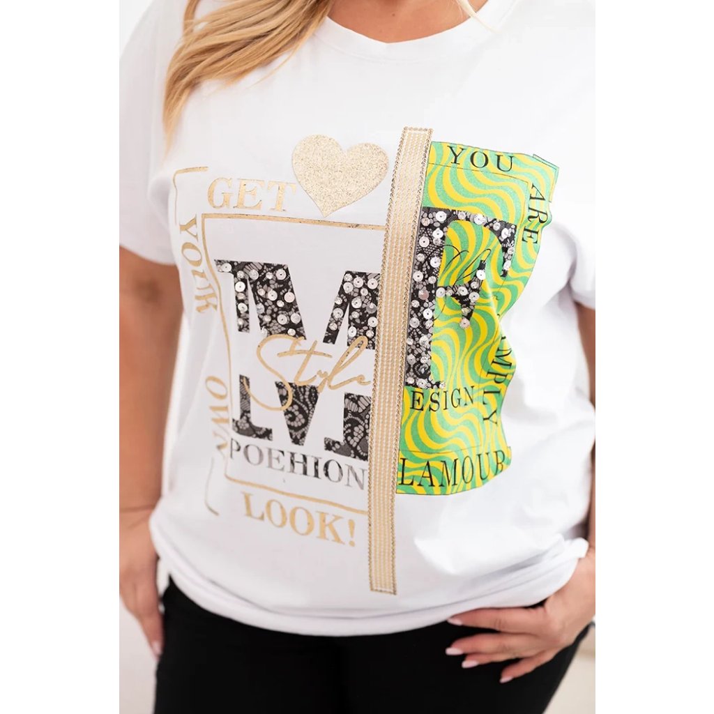 Dámska bavlnená blúzka Plus Size s potlačou a flitrami biela + zelená