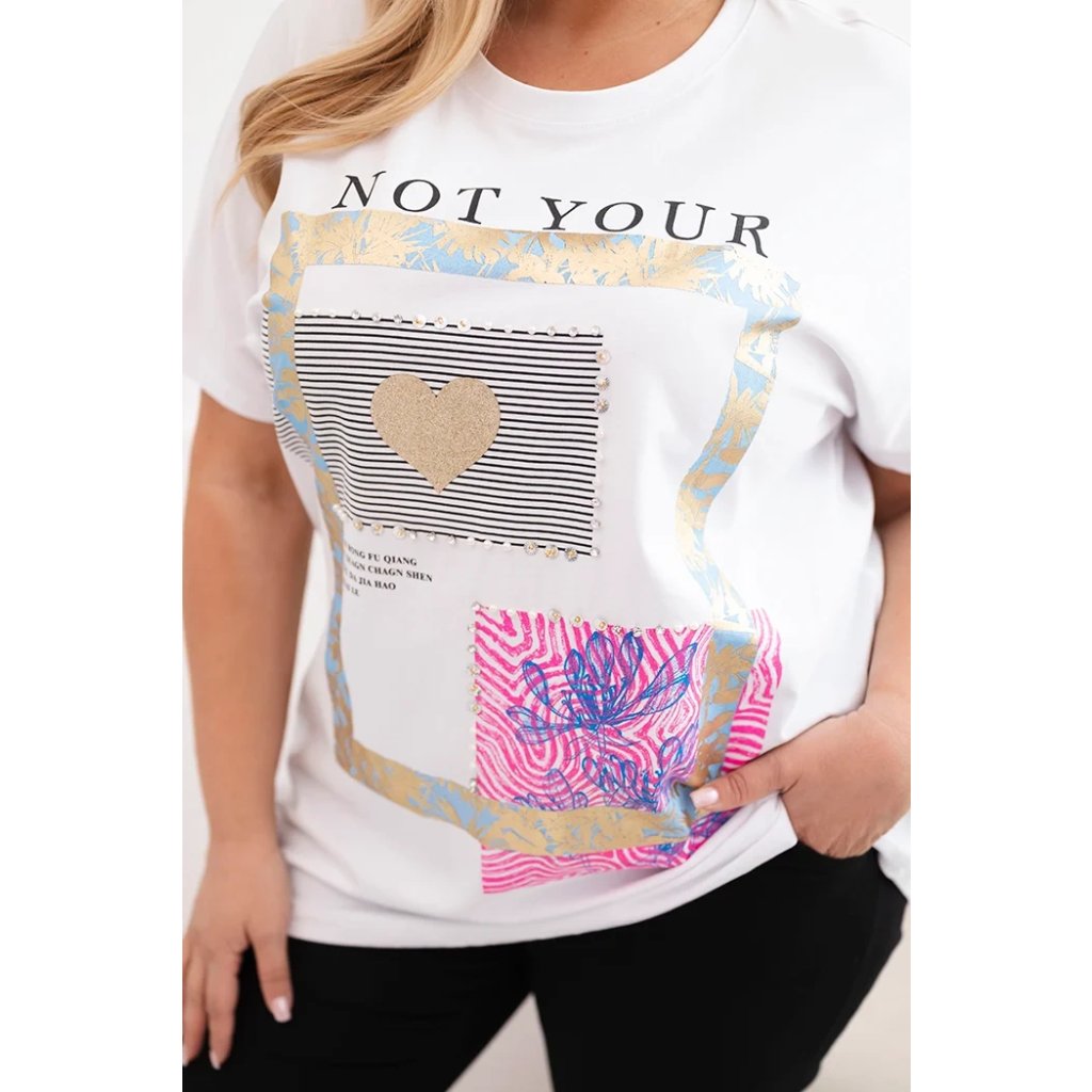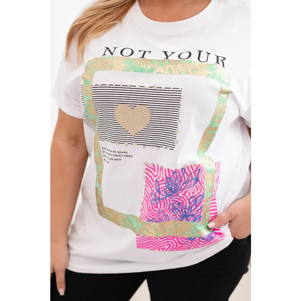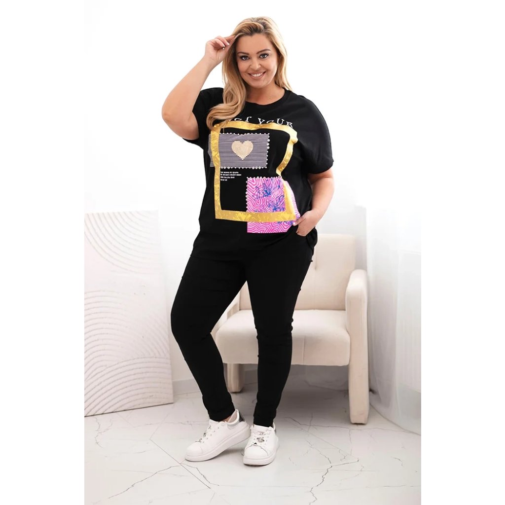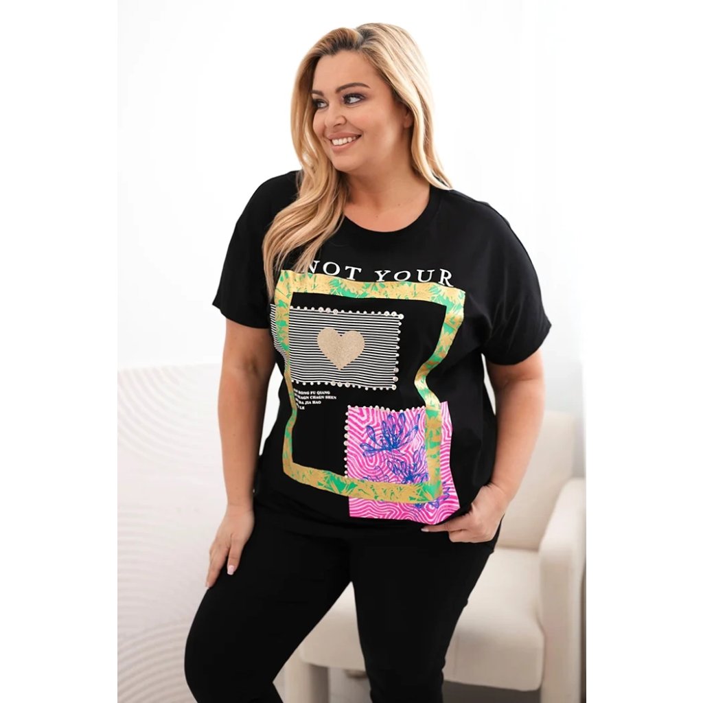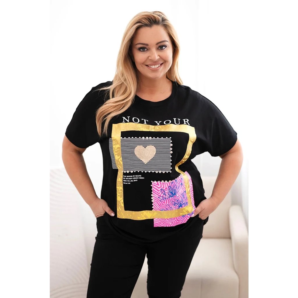 Táto dámska blúzka s krátkym rukávom je ideálnou voľbou pre ženy, ktoré si cenia pohodlie a štýl v jednom. Vyrobená z mäkkej, na dotyk príjemnej bavlny s pridaným elastanom, skvele sa prispôsobí postave a zaručuje komfort nosenia po celý deň. Voľný strih umožňuje slobodu pohybu a pútavá potlač s lesklým zlatým srdcom a farebnými detailmi jej dodáva výnimočný charakter. Je to blúzka, ktorá sa hodí ako na každodenné nosenie, tak aj na stretnutia s priateľmi alebo voľnejšie výlety – stačí ju skombinovať s obľúbenými džínsami alebo legínami. Vďaka módnemu dizajnu a univerzálnemu strihu je skvelou voľbou do každého šatníka. Model je určený dámam nosiacim veľkosti Plus Size – XXL, XXXL a väčšie.