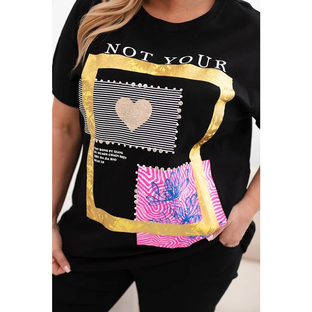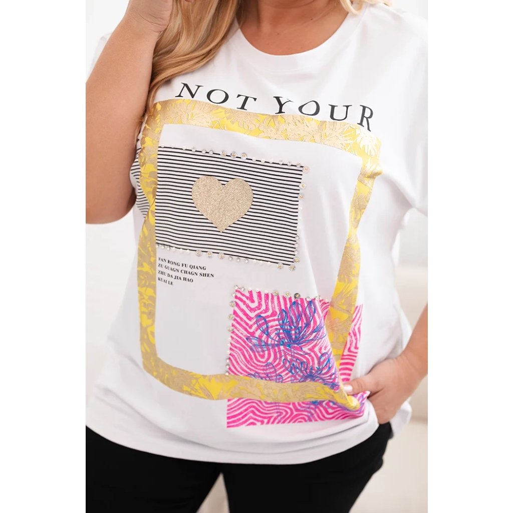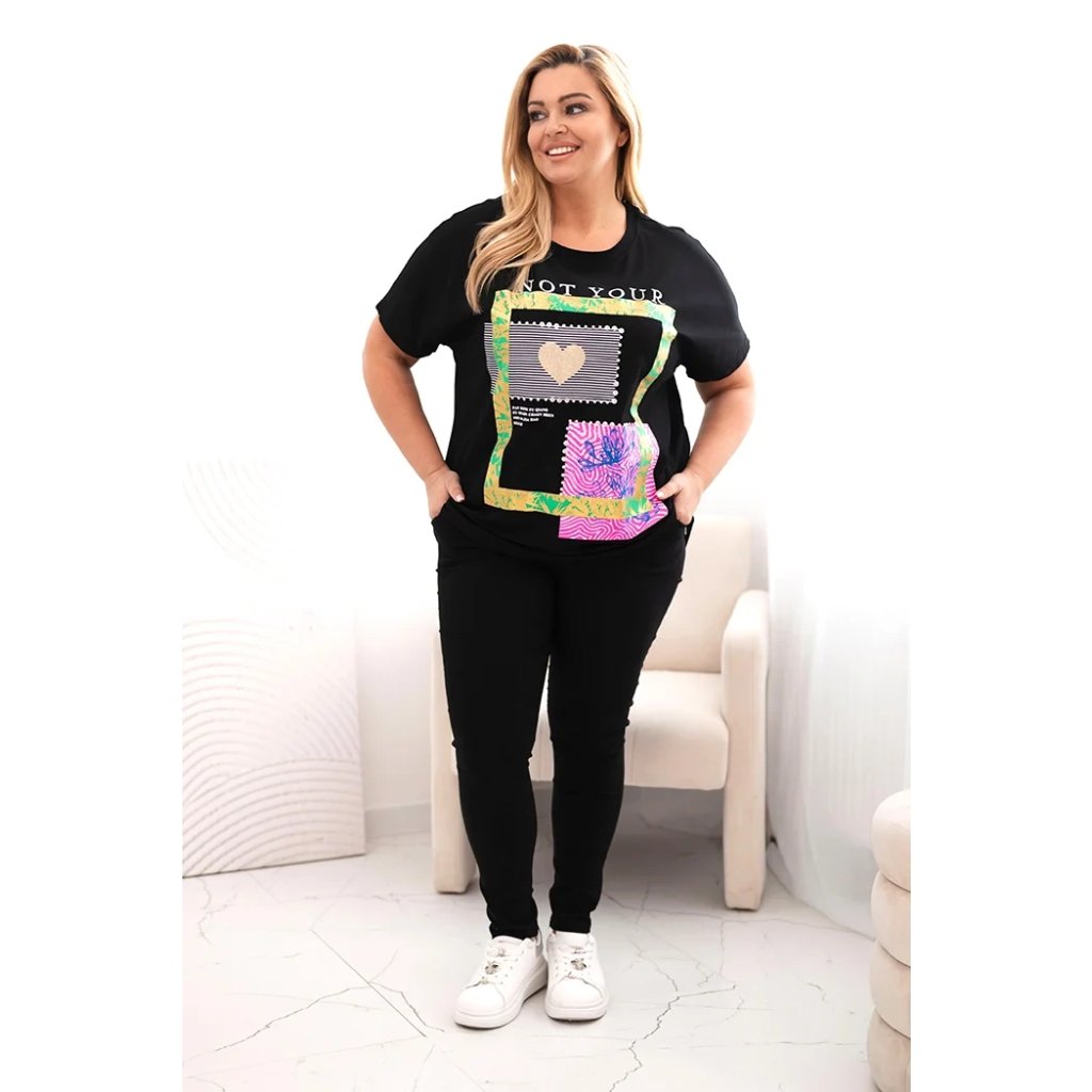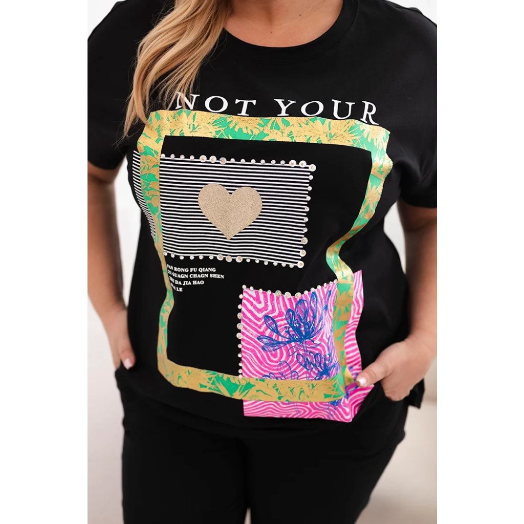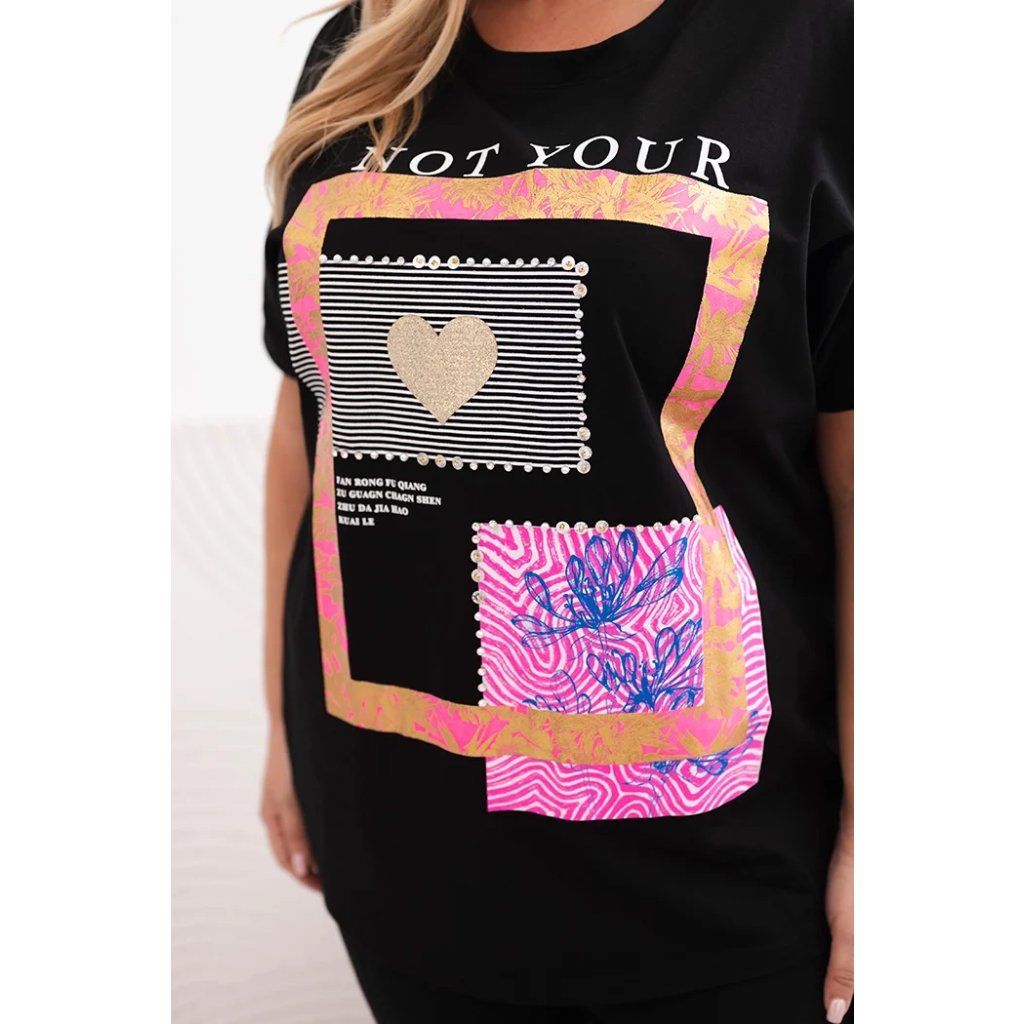 Táto dámska blúzka s krátkym rukávom je ideálnou voľbou pre ženy, ktoré si cenia pohodlie a štýl v jednom. Vyrobená z mäkkej, na dotyk príjemnej bavlny s pridaným elastanom, skvele sa prispôsobí postave a zaručuje komfort nosenia po celý deň. Voľný strih umožňuje slobodu pohybu a pútavá potlač s lesklým zlatým srdcom a farebnými detailmi jej dodáva výnimočný charakter. Je to blúzka, ktorá sa hodí ako na každodenné nosenie, tak aj na stretnutia s priateľmi alebo voľnejšie výlety – stačí ju skombinovať s obľúbenými džínsami alebo legínami. Vďaka módnemu dizajnu a univerzálnemu strihu je skvelou voľbou do každého šatníka. Model je určený dámam nosiacim veľkosti Plus Size – XXL, XXXL a väčšie.