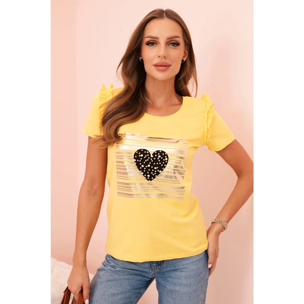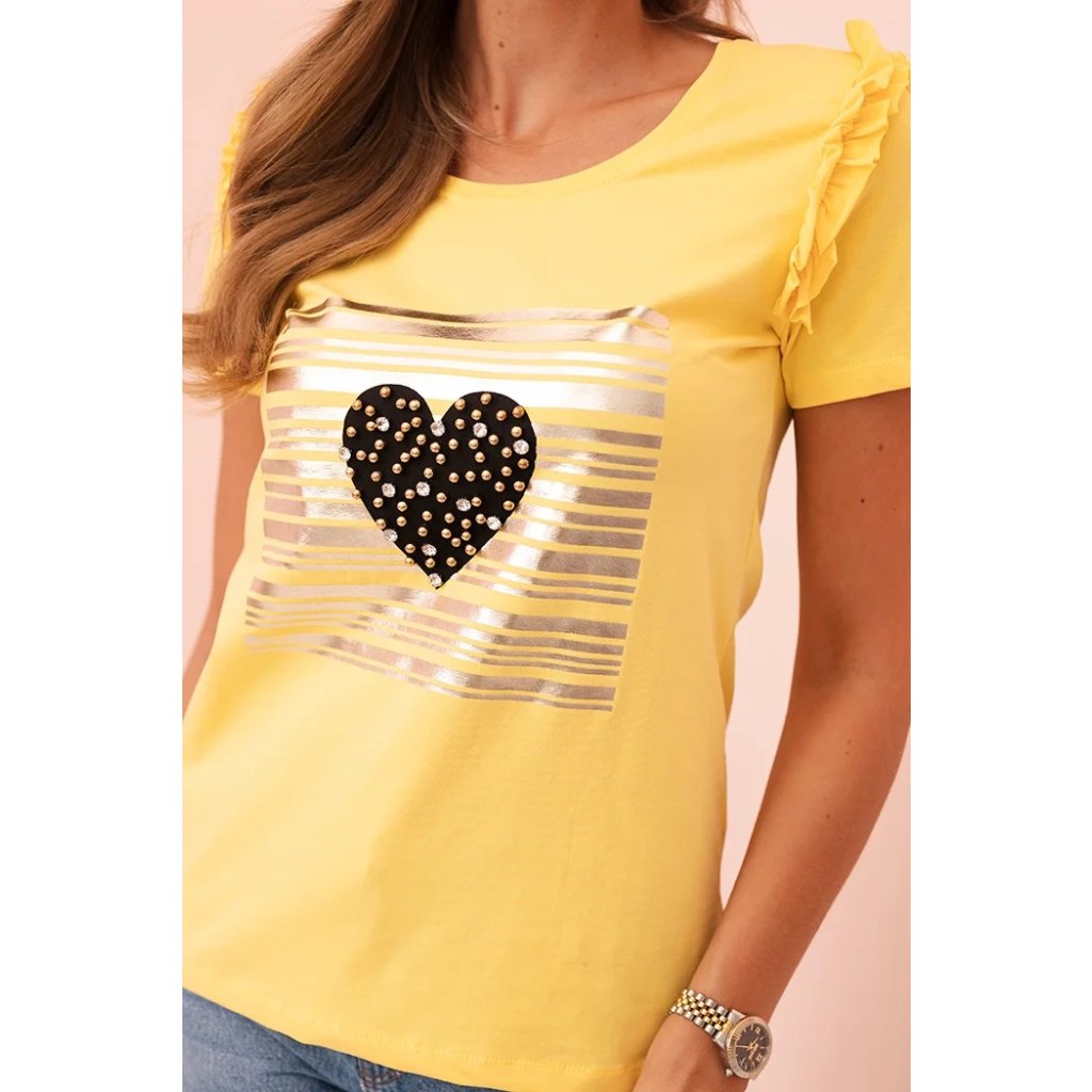 Stavte na jemný šarm a ženský detail! Táto dámska blúzka s krátkym rukávom očarí dekoratívnou aplikáciou v tvare srdca z lesklých džínsu a roztomilými volánikmi na ramenách. Je to ideálna voľba pre ženy, ktoré chcú svojej štylizácii pridať ľahkosť a módny akcent.