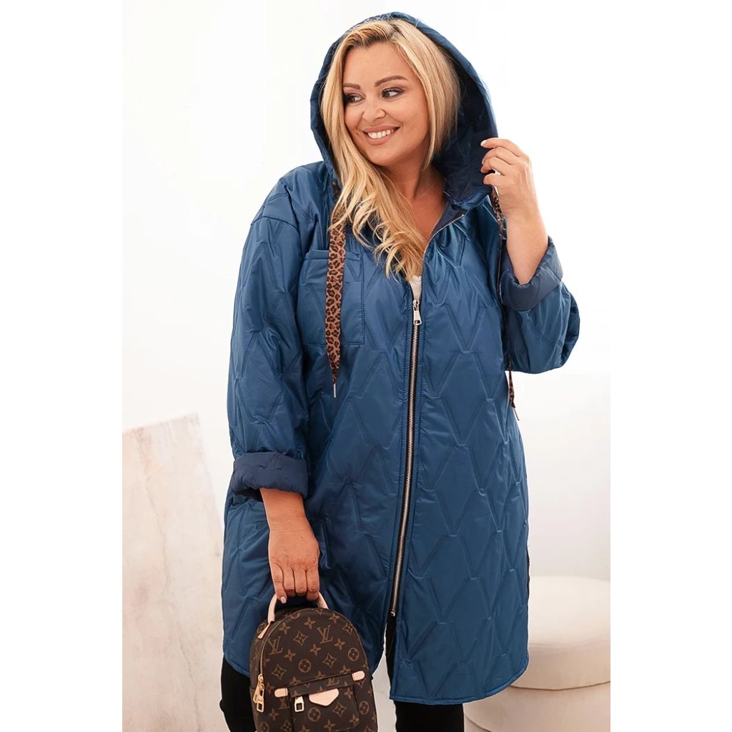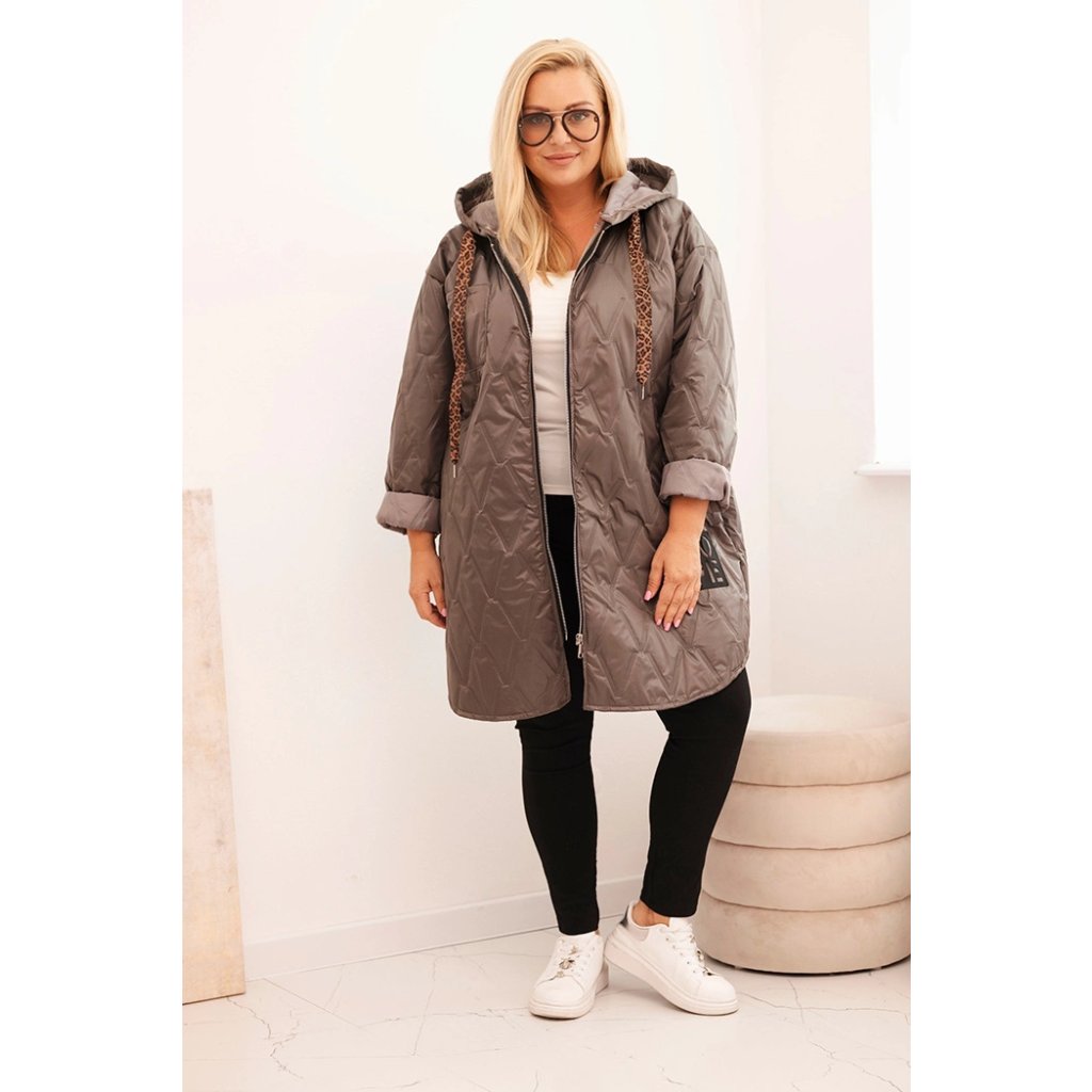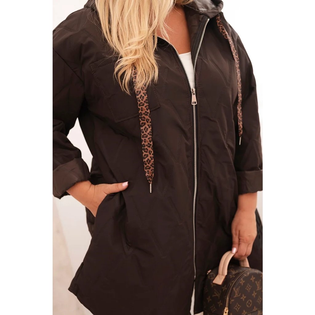 Štýlová dámska prešívaná bunda vo veľkosti plus size je ideálnou voľbou pre ženy nosiace väčšie veľkosti – od XL do 4XL. Jej voľný, oversized strih poskytuje maximálne pohodlie pri nosení a skvele sedí na postave bez obmedzovania pohybu. Model sa vyznačuje geometrickým prešívaním, ktoré opticky zužuje postavu, a módnou kapucňou so sťahovacou šnúrkou v leopardom vzore. Zips a praktické vrecko na hrudi podčiarkujú moderný a funkčný charakter bundy.