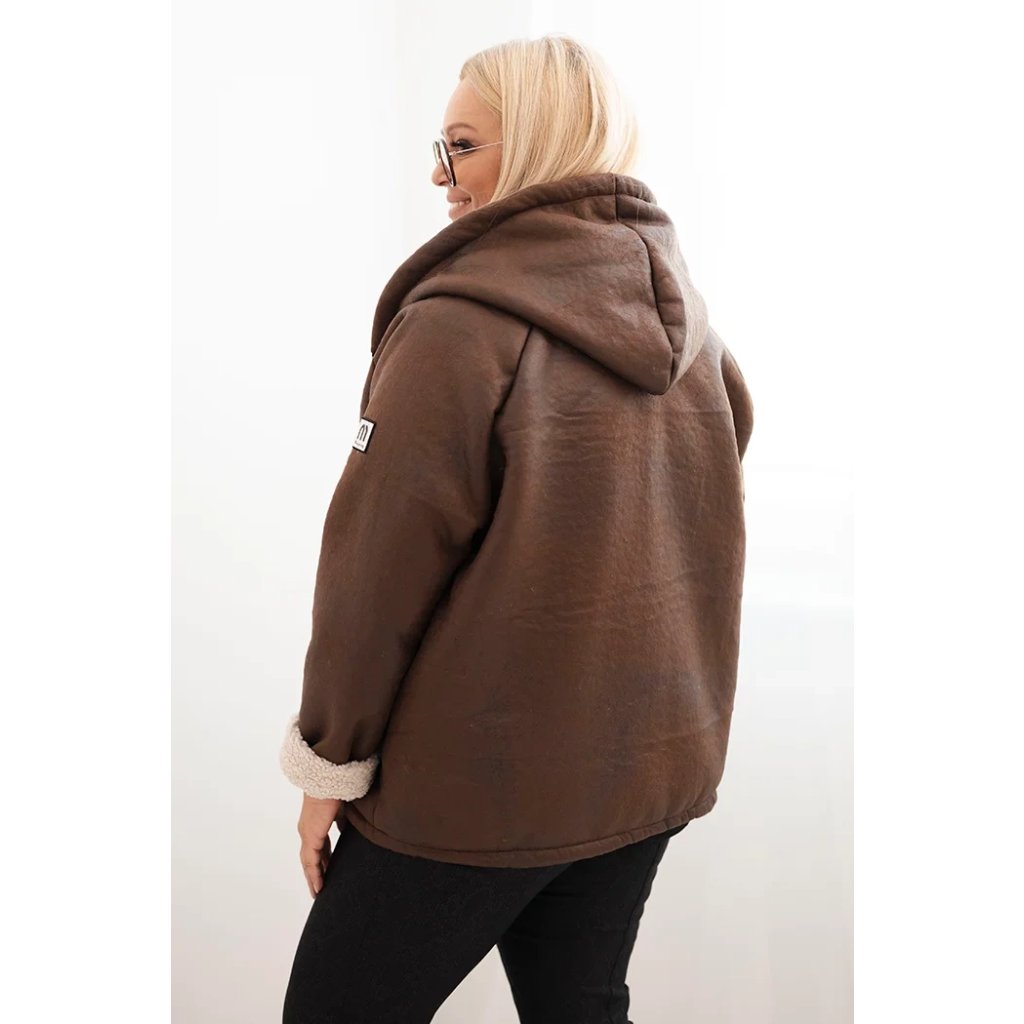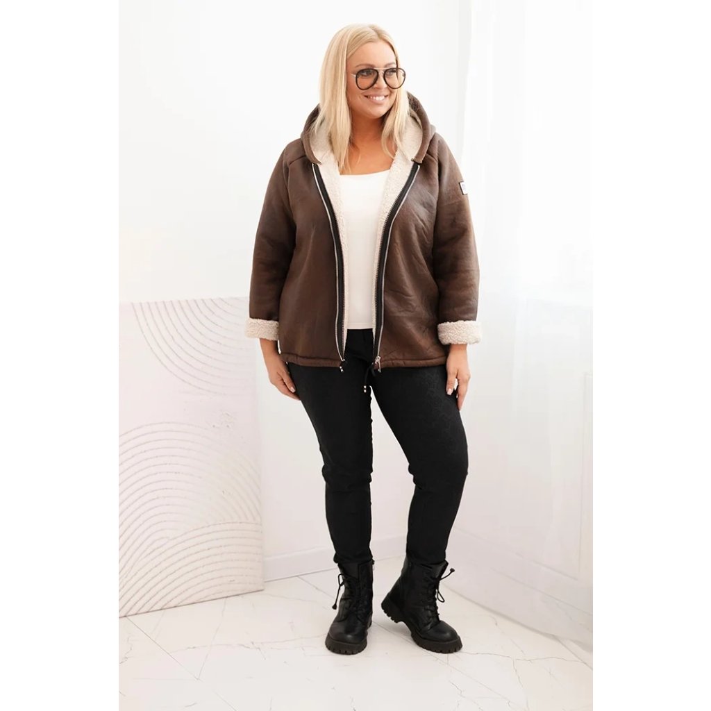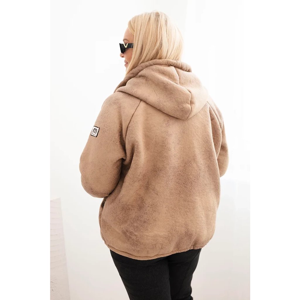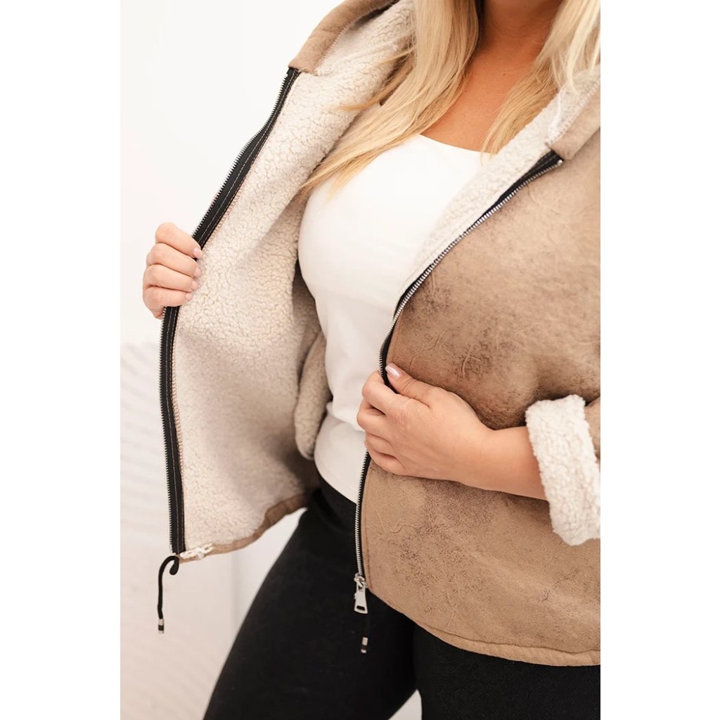 Dámska bunda Plus Size s kapucňou a beránkom v ťavej farbe