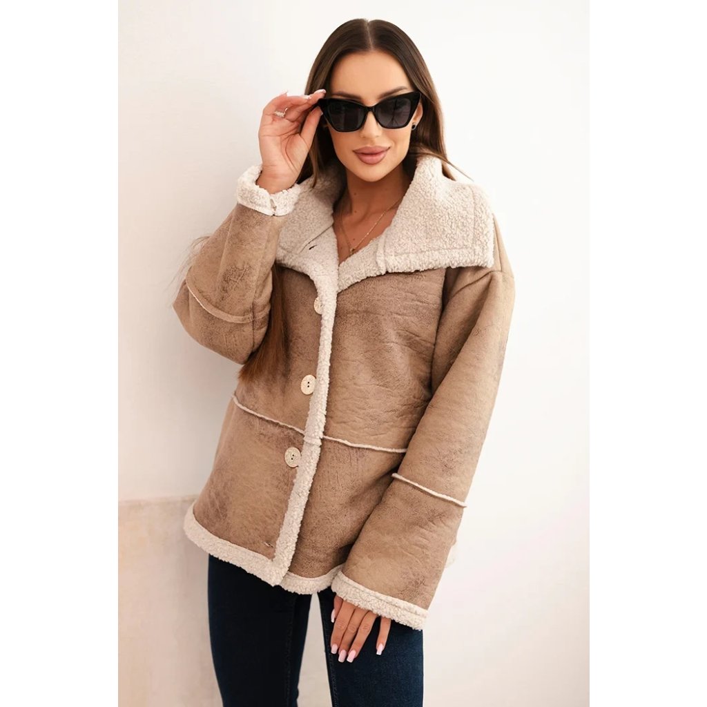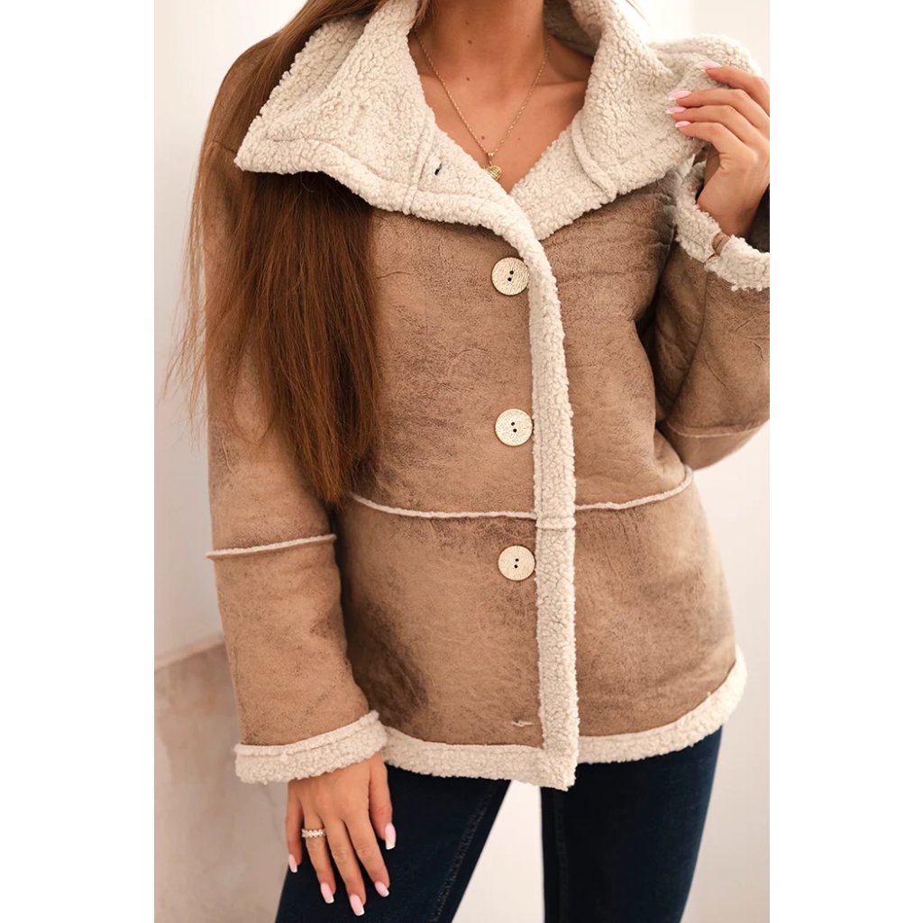Dámska bunda Plus Size zateplená s barančekom a gombíkmi krátky strih v kámeľovej farbe