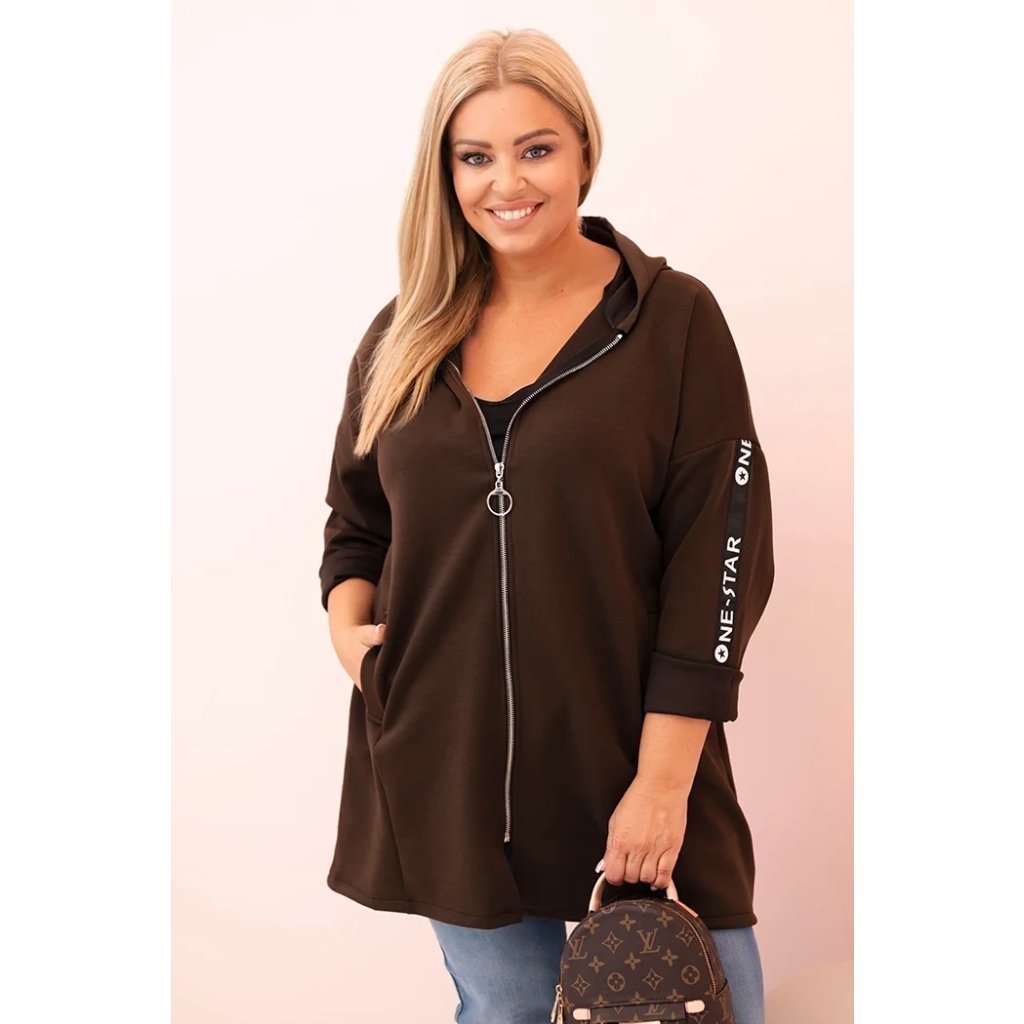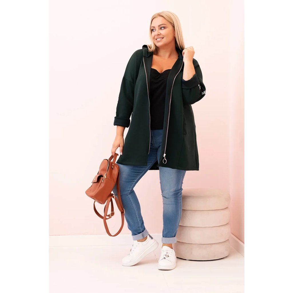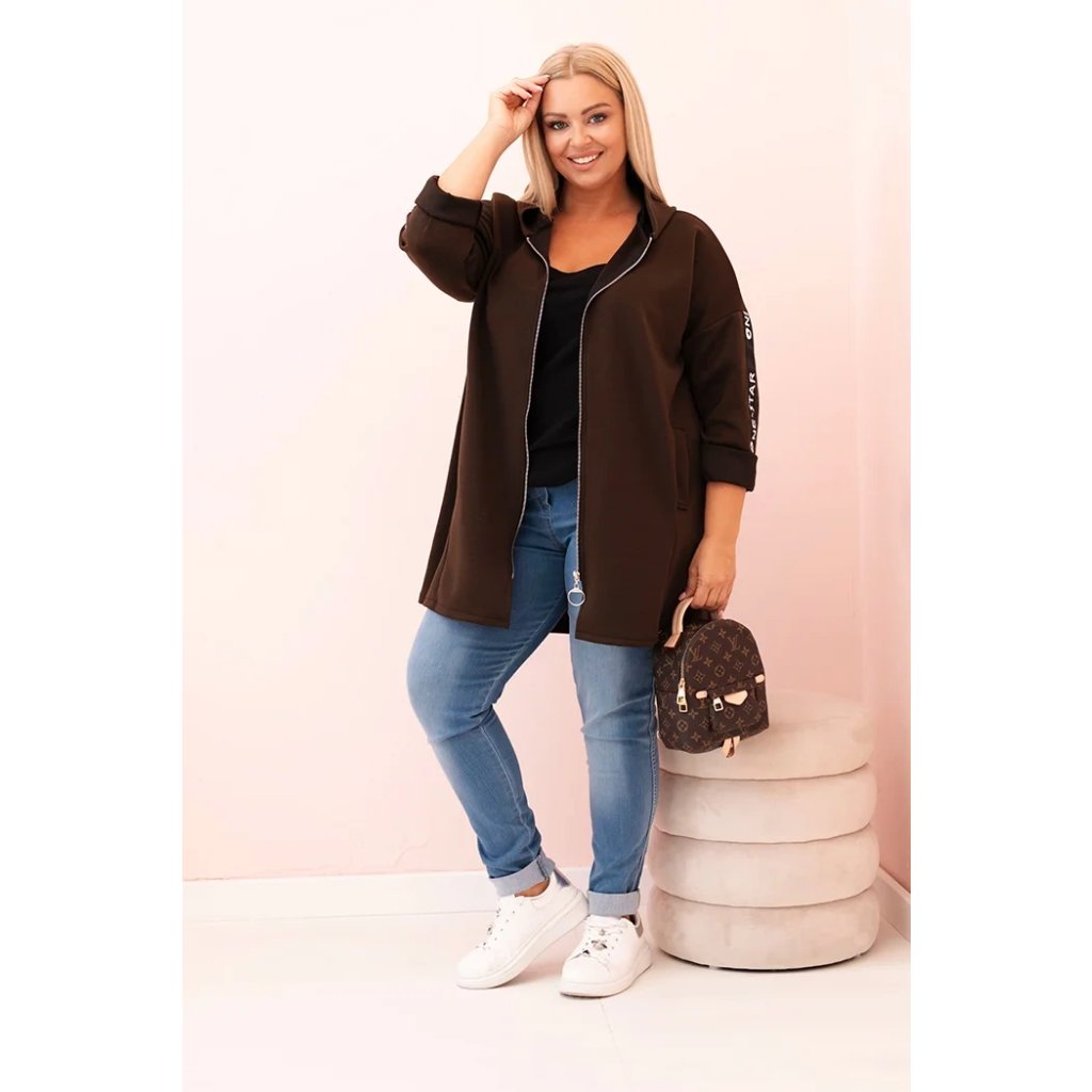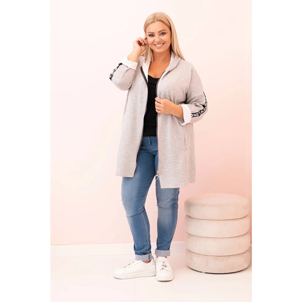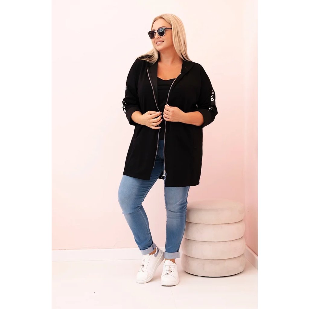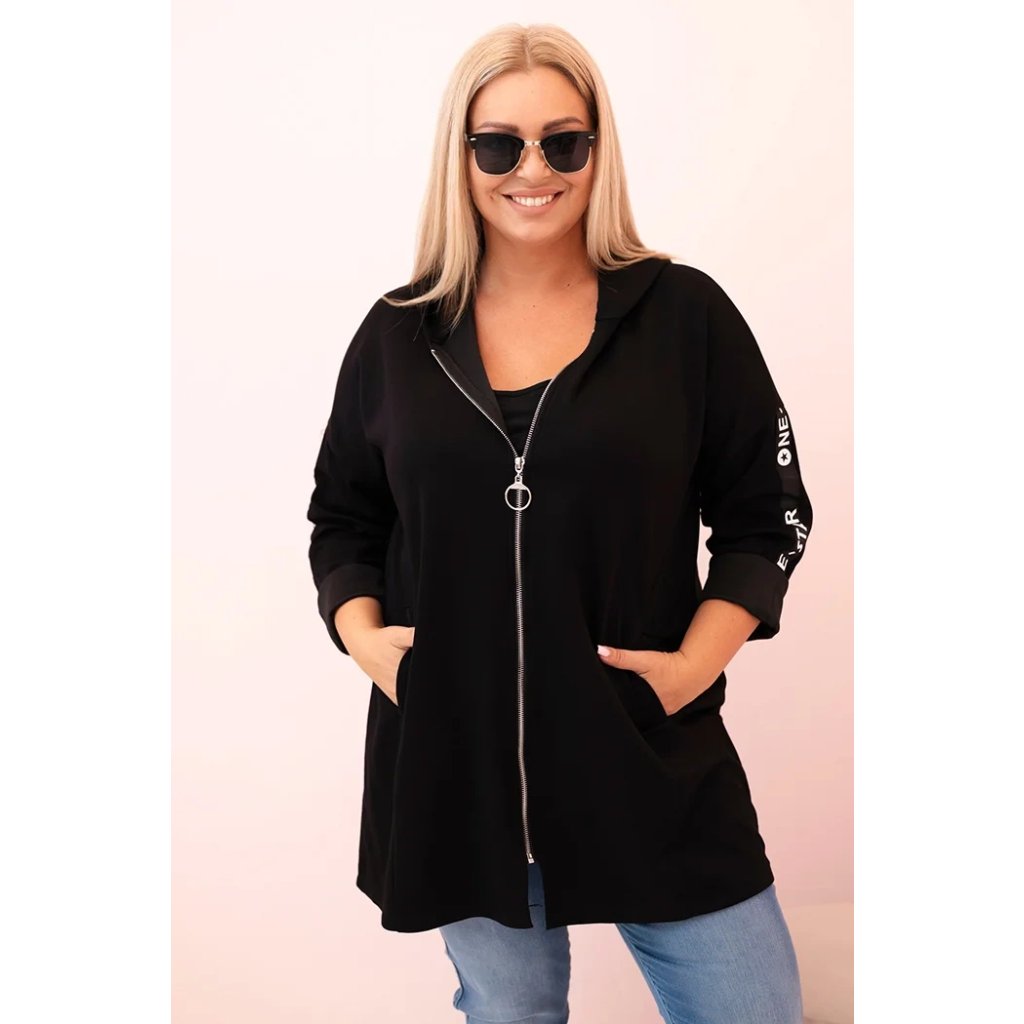 Táto mikinová dámska plus size je vynikajúcou voľbou pre ženy, ktoré si cenia pohodlie a módny, voľný štýl. Vyrobená z mäkkej zmesi polyesteru, viskózy a elastánu, skvele sa prispôsobuje postave a neobmedzuje pohyby. Model na zips s dekoratívnym krúžkom na zipse dodáva moderný vzhľad a kapucňa zvyšuje funkčnosť. Na rukáve sa nachádza moderná potlač v streetwearovom štýle, ktorá priťahuje pohľady a zdôrazňuje športový štýl mikiny.
