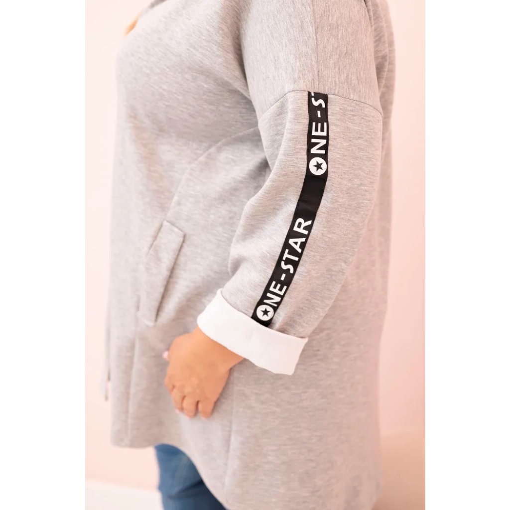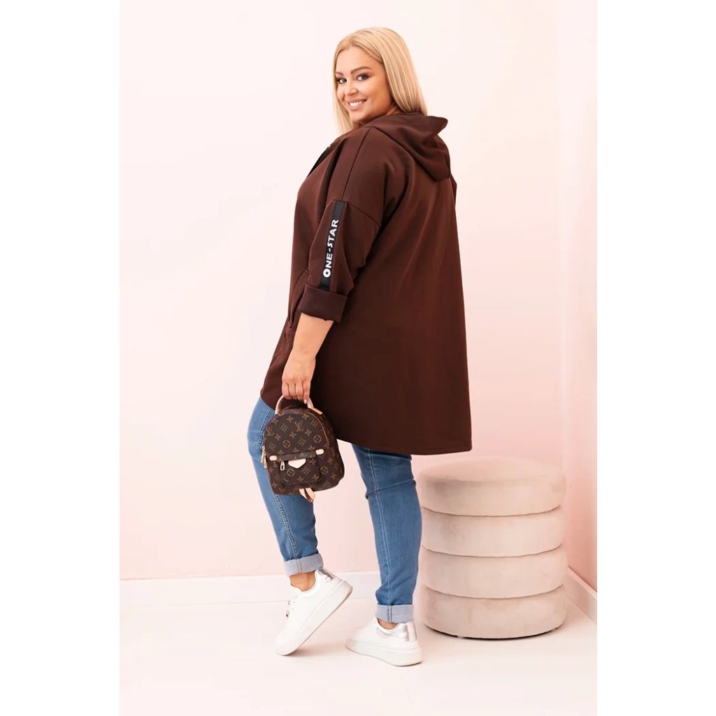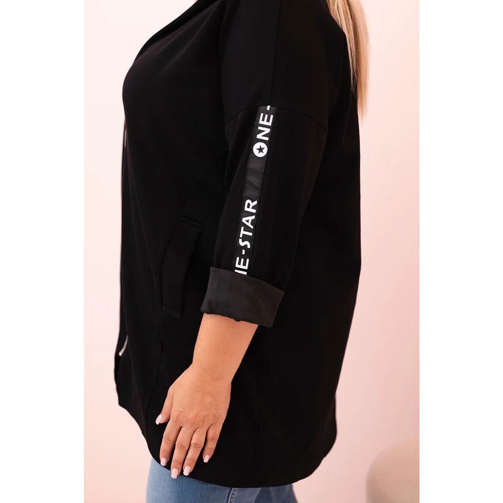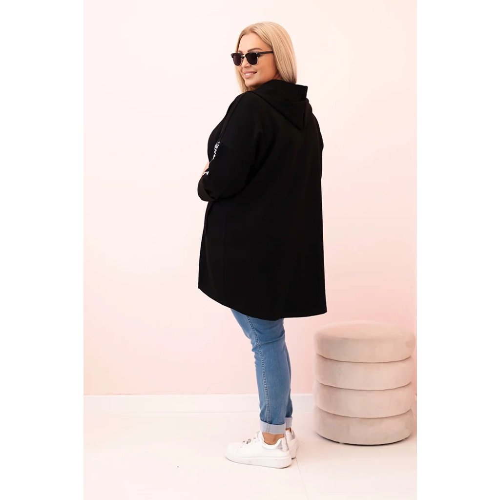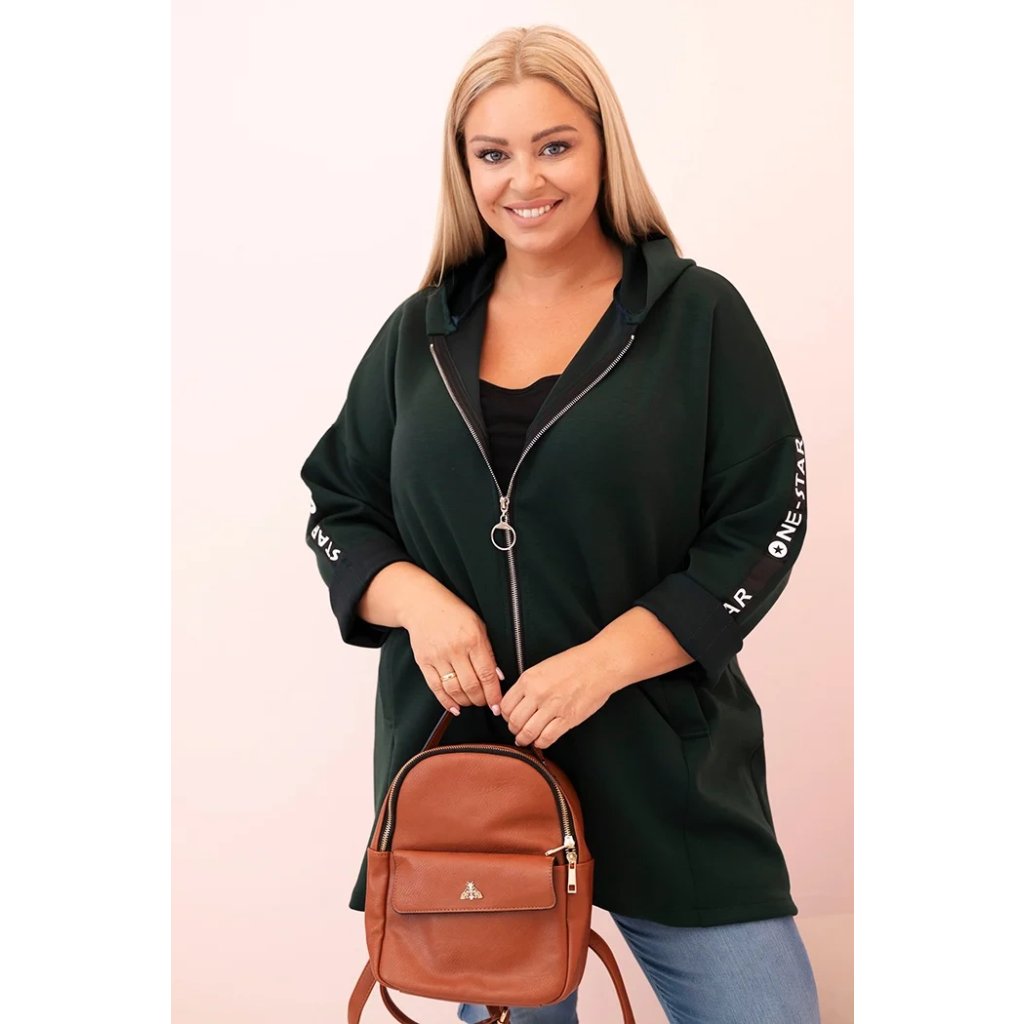 Táto mikinová dámska plus size je vynikajúcou voľbou pre ženy, ktoré si cenia pohodlie a módny, voľný štýl. Vyrobená z mäkkej zmesi polyesteru, viskózy a elastánu, skvele sa prispôsobuje postave a neobmedzuje pohyby. Model na zips s dekoratívnym krúžkom na zipse dodáva moderný vzhľad a kapucňa zvyšuje funkčnosť. Na rukáve sa nachádza moderná potlač v streetwearovom štýle, ktorá priťahuje pohľady a zdôrazňuje športový štýl mikiny.