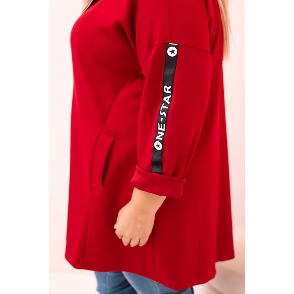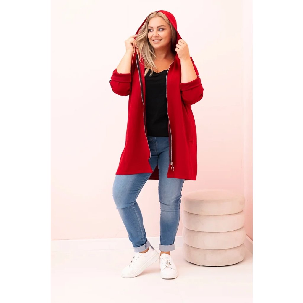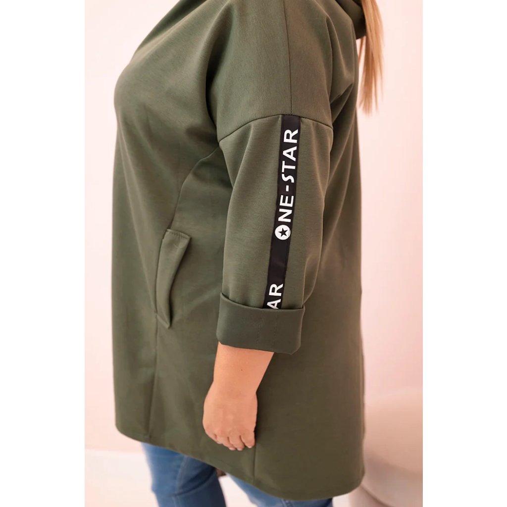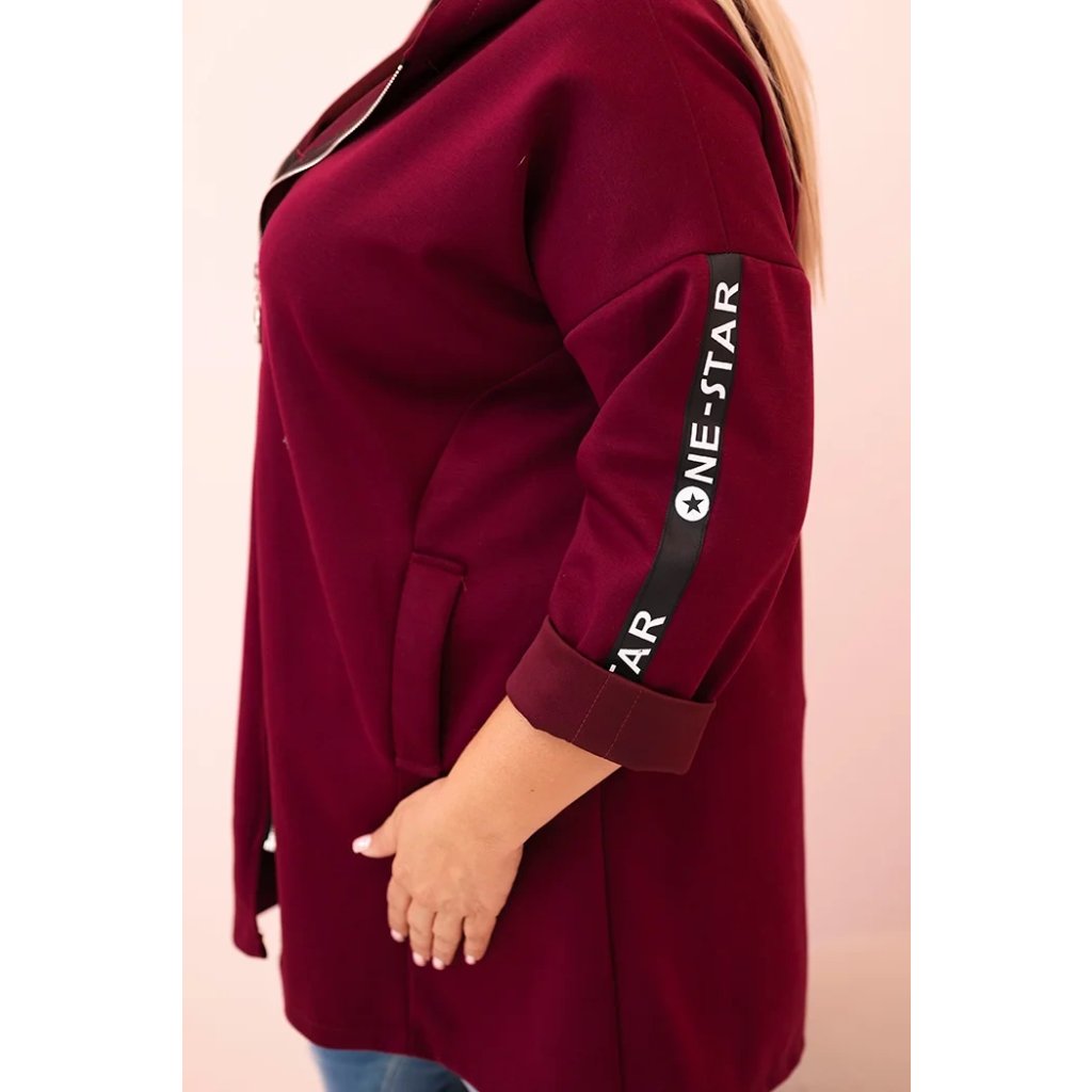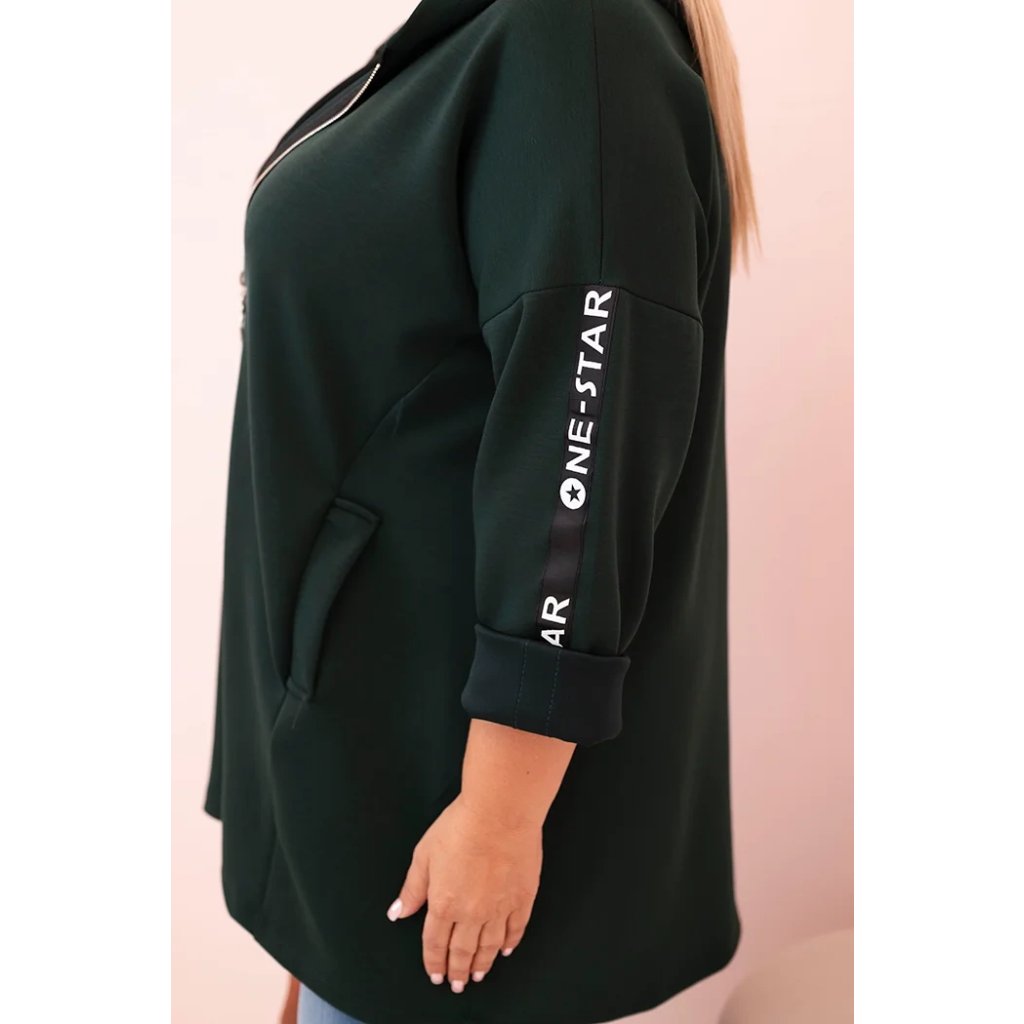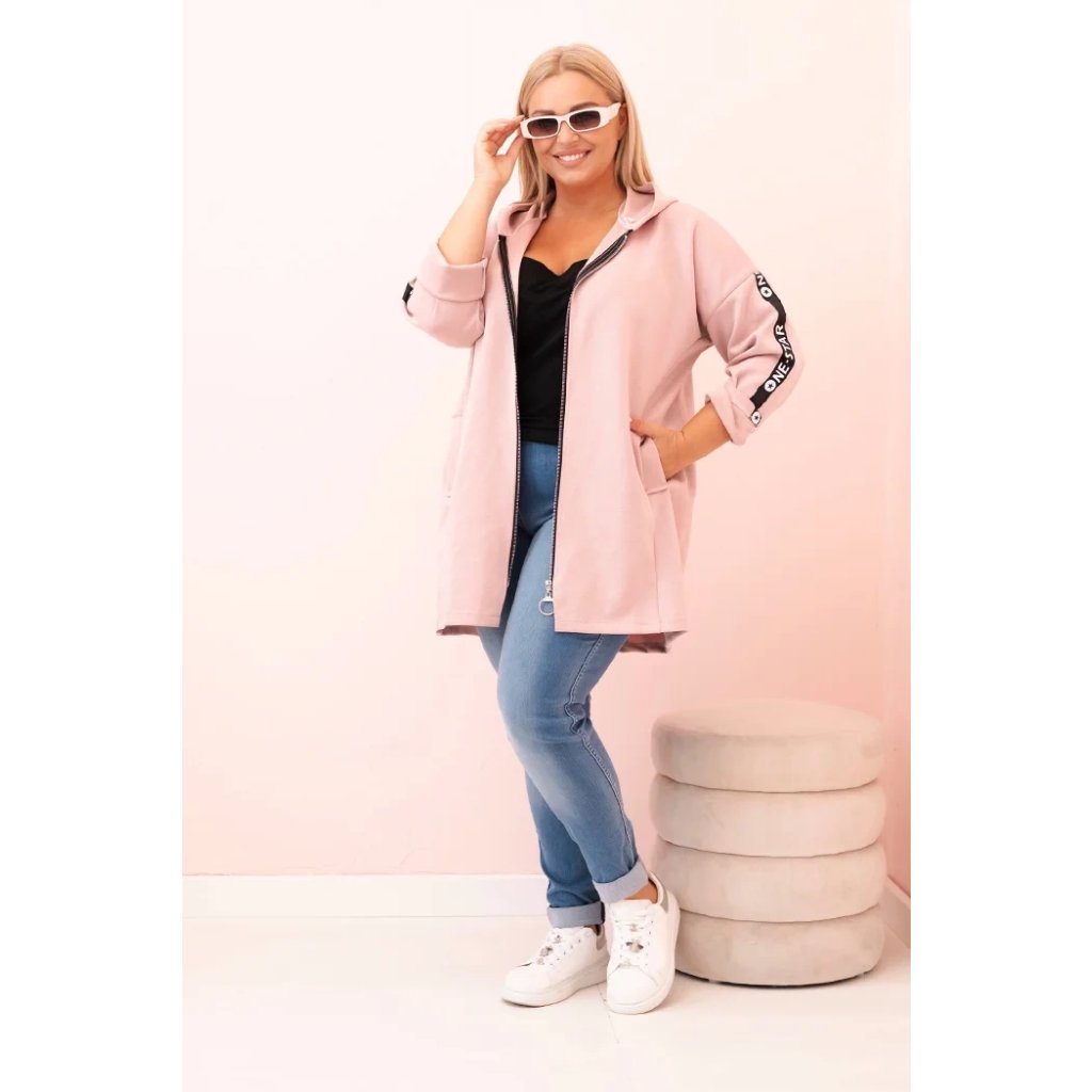 Táto mikinová dámska plus size je vynikajúcou voľbou pre ženy, ktoré si cenia pohodlie a módny, voľný štýl. Vyrobená z mäkkej zmesi polyesteru, viskózy a elastánu, skvele sa prispôsobuje postave a neobmedzuje pohyby. Model na zips s dekoratívnym krúžkom na zipse dodáva moderný vzhľad a kapucňa zvyšuje funkčnosť. Na rukáve sa nachádza moderná potlač v streetwearovom štýle, ktorá priťahuje pohľady a zdôrazňuje športový štýl mikiny.