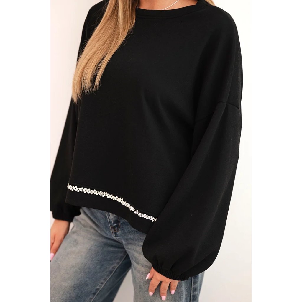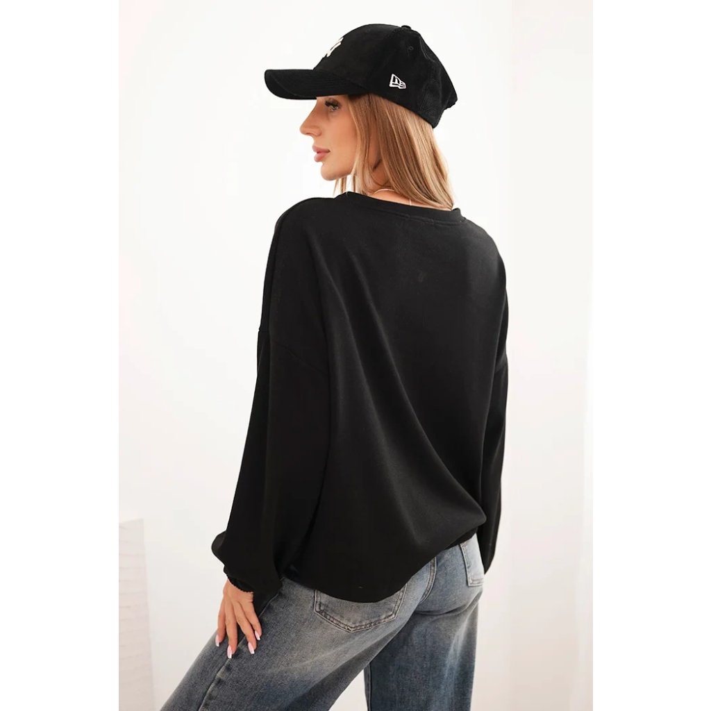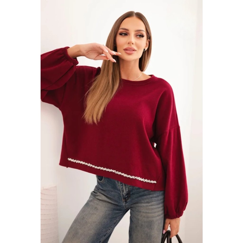 Dámska mikina s ozdobným zakončením na spodku je spojením pohodlia a elegancie v každodennom štýle. Voľnejší strih zaisťuje pohodlie pri nosení a dekoratívna aplikácia dodáva celku výnimočný charakter. Model je ideálny aj k džínam, aj k sukniam, čím vytvára outfity na každý deň, ako aj na stretnutia v uvoľnenejšej atmosfére.