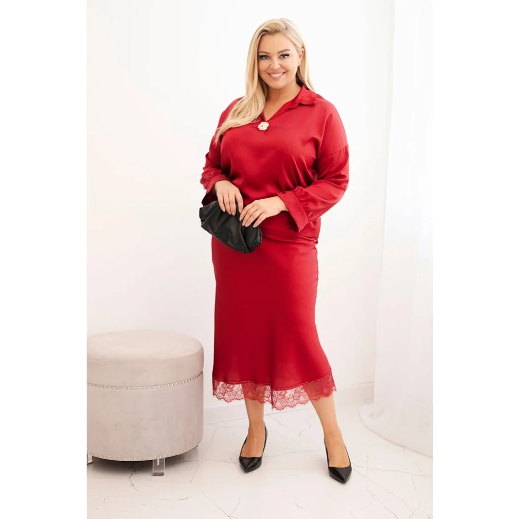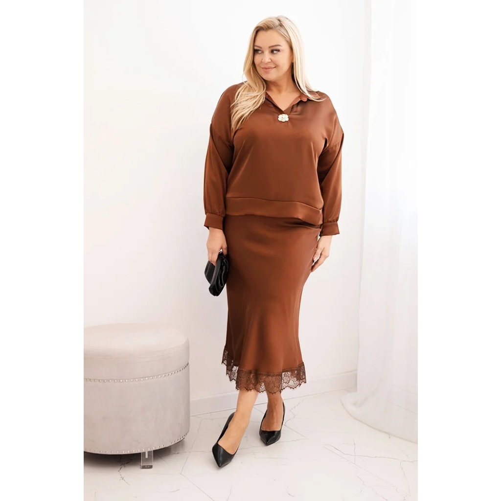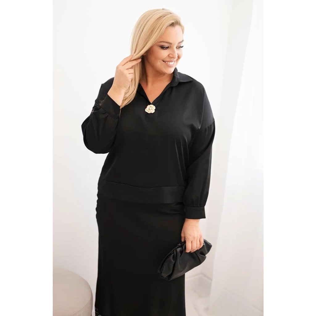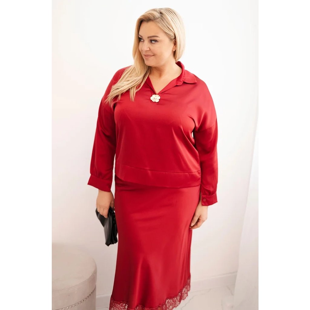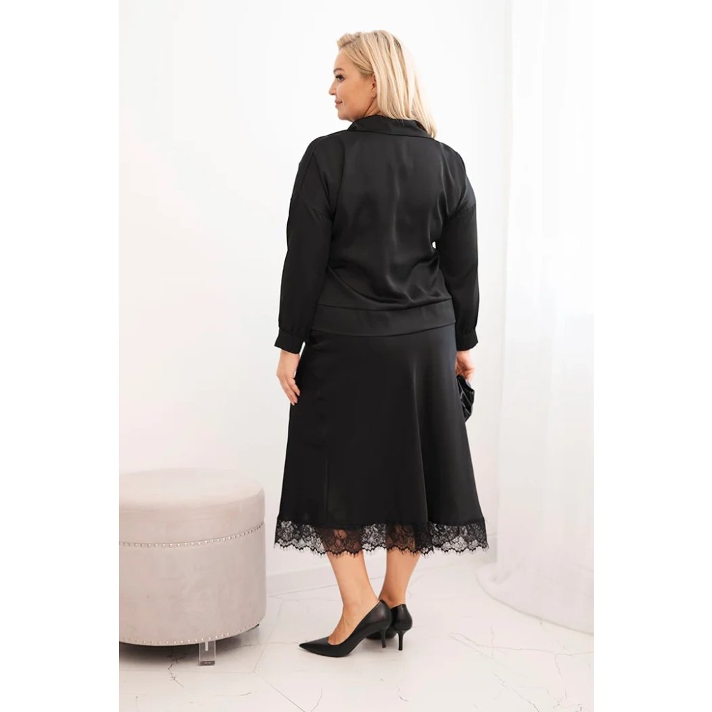 Elegantná dámska súprava plus size, ktorá spája moderný štýl s klasickou ženskosťou. Saténový lesk materiálu dodáva celku sofistikovanosť a jemná čipka na sukni jemne zvýrazňuje nohy a dodáva tak celku romantický charakter. Blúzka s efektným golierikom a ozdobným zlatým gombíkom sa hodí ako na bežné dni, tak aj na špeciálne príležitosti – stačí pridať vhodné doplnky!