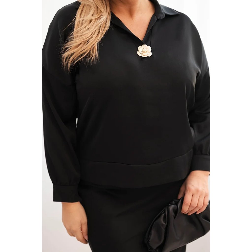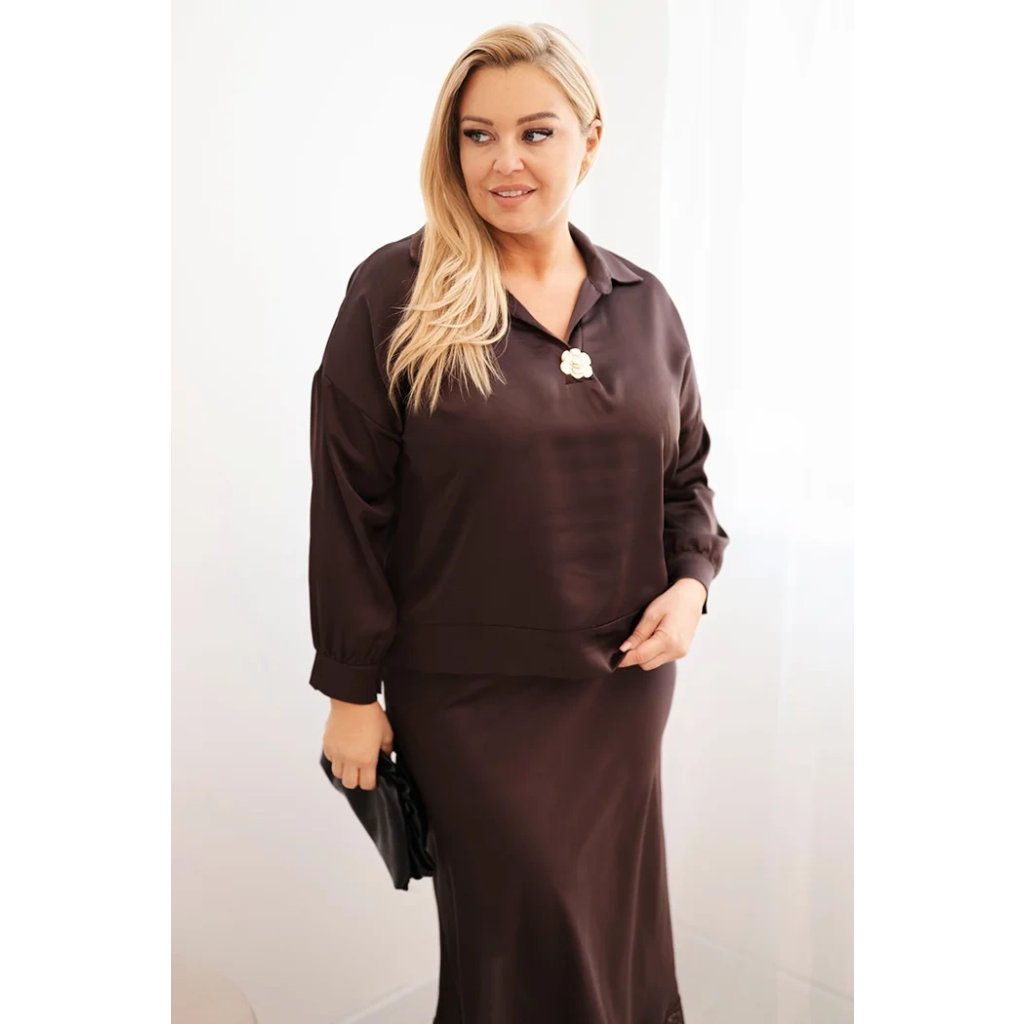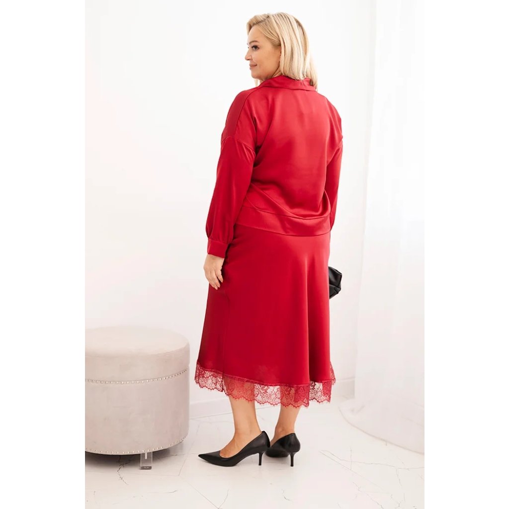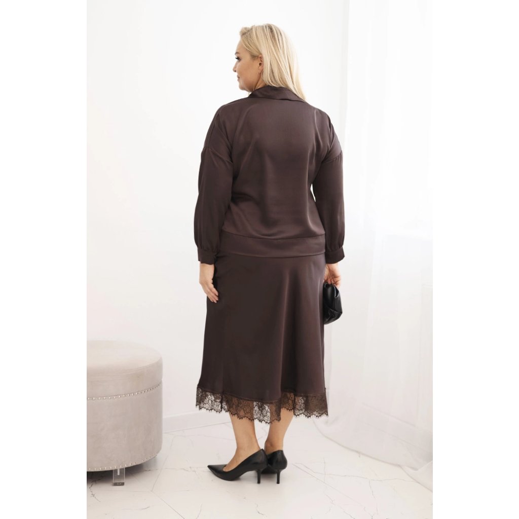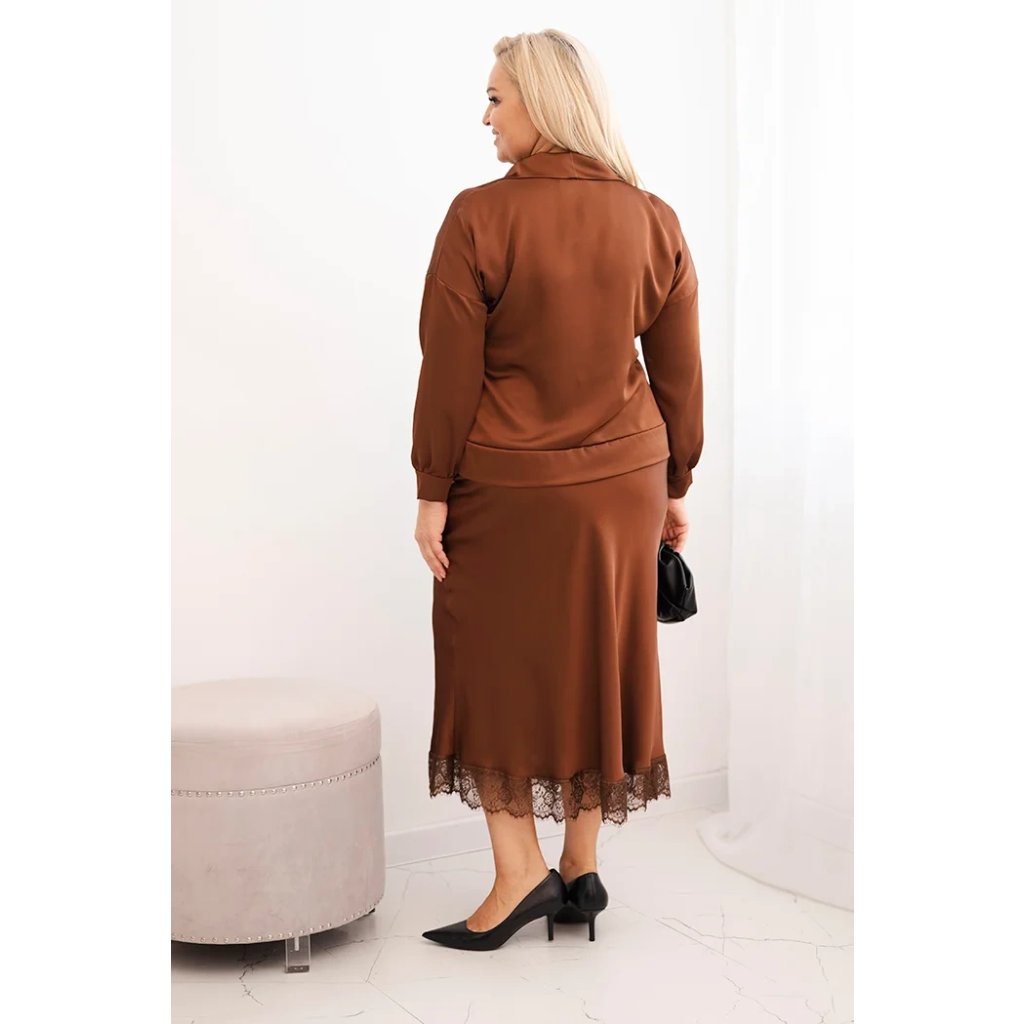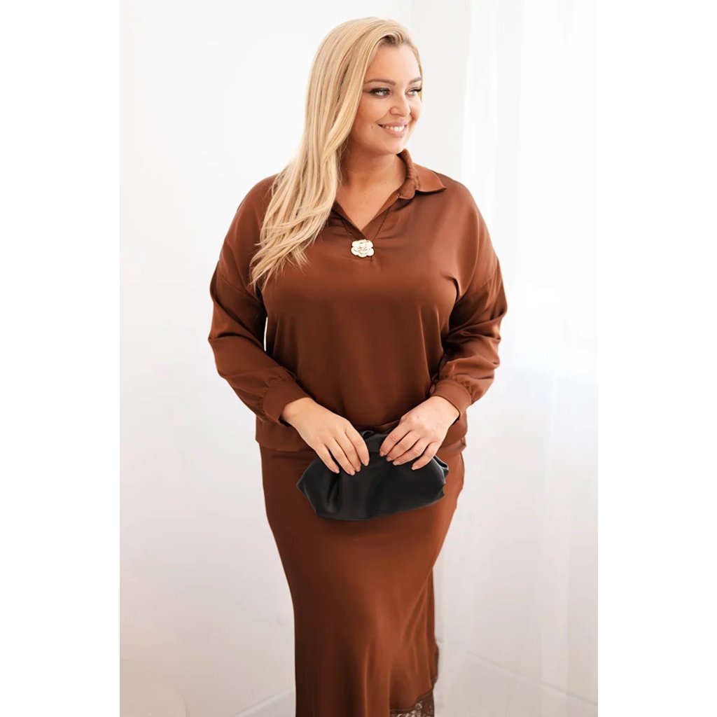 Elegantná dámska súprava plus size, ktorá spája moderný štýl s klasickou ženskosťou. Saténový lesk materiálu dodáva celku sofistikovanosť a jemná čipka na sukni jemne zvýrazňuje nohy a dodáva tak celku romantický charakter. Blúzka s efektným golierikom a ozdobným zlatým gombíkom sa hodí ako na bežné dni, tak aj na špeciálne príležitosti – stačí pridať vhodné doplnky!