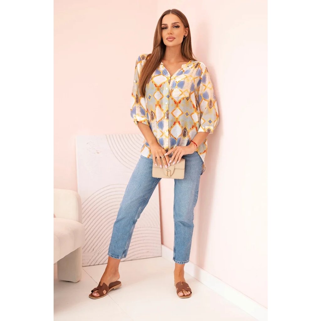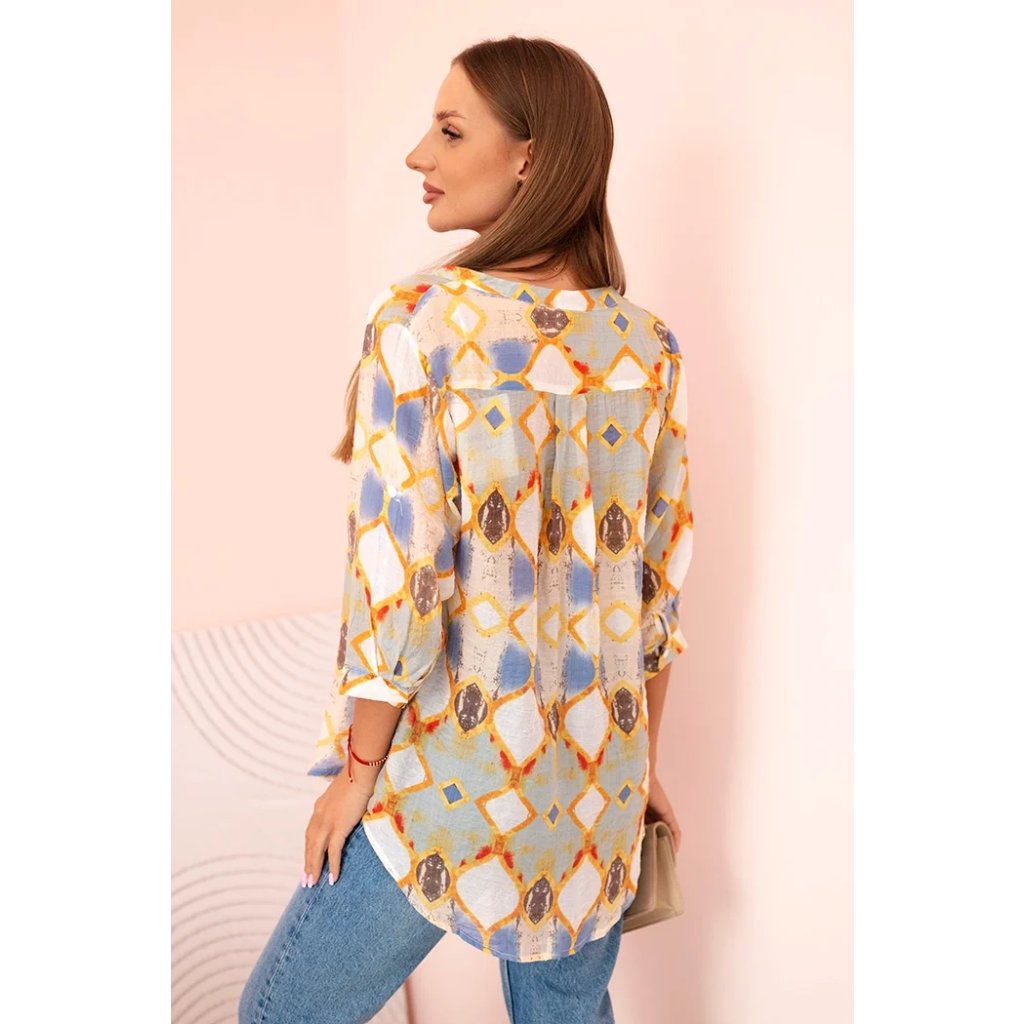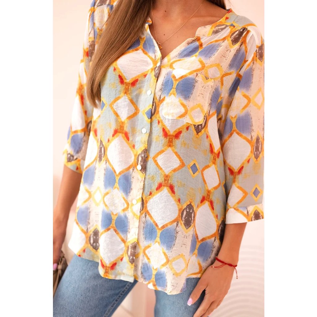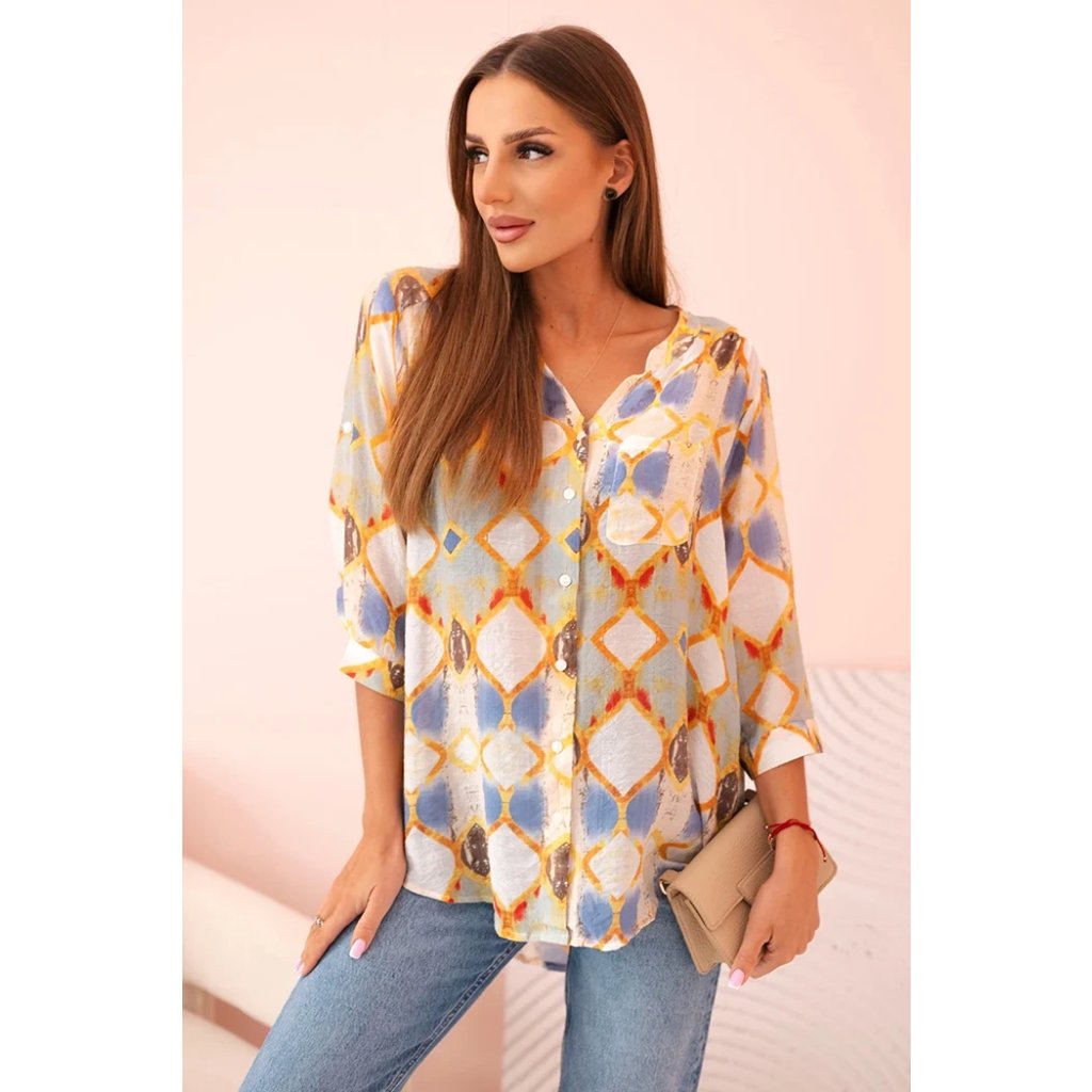 Farebná dámska košeľa s 3/4 rukávom je ideálnou voľbou na jarné a letné obdobie. Geometrický vzor v módnych odtieňoch dodáva celku svieži vzhľad. Model má klasické zapínanie na gombíky a praktické vrecko na hrudi, čo jej dodáva voľný, neformálny charakter. Zaoblený spodok košele dobre sedí na postave a výstrih do V opticky predlžuje krk. Košeľa je vyrobená z príjemnej zmesi prírodných materiálov: viskózy, bavlny a hodvábu, čo zaručuje pohodlie a priedušnosť aj v teplejšie dni. Skvelá na každodenné nosenie, do práce, ako aj na stretnutia v kruhu priateľov.