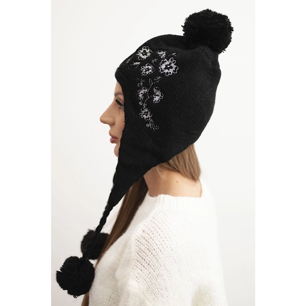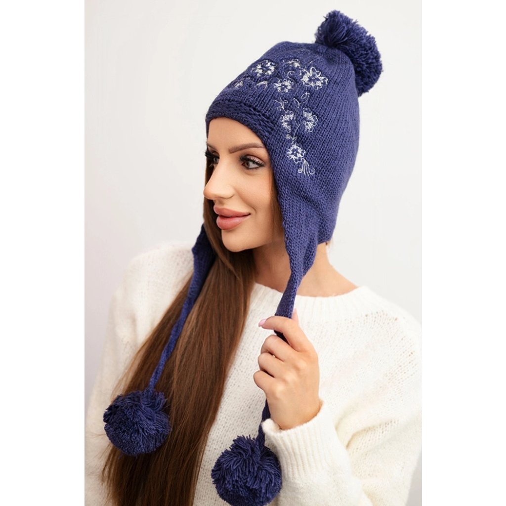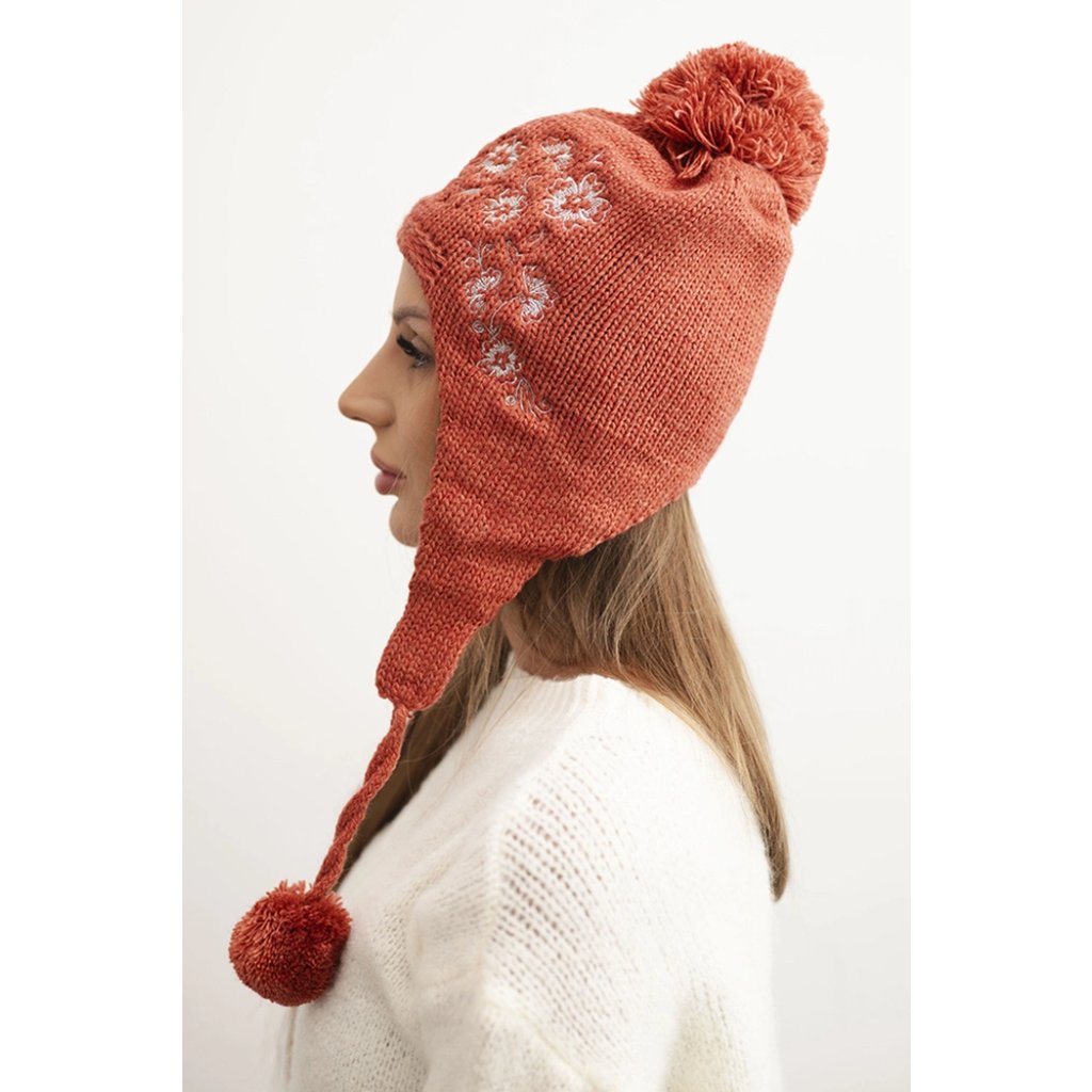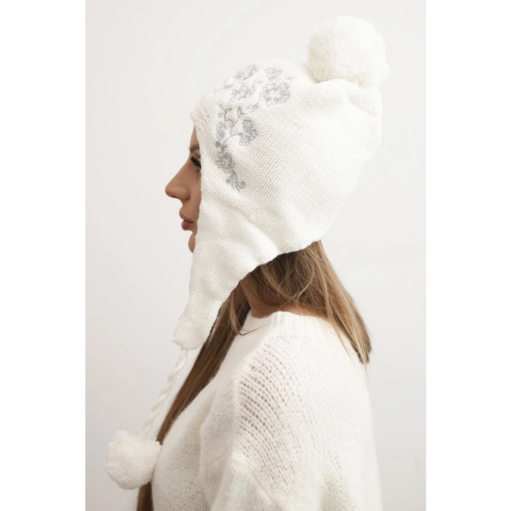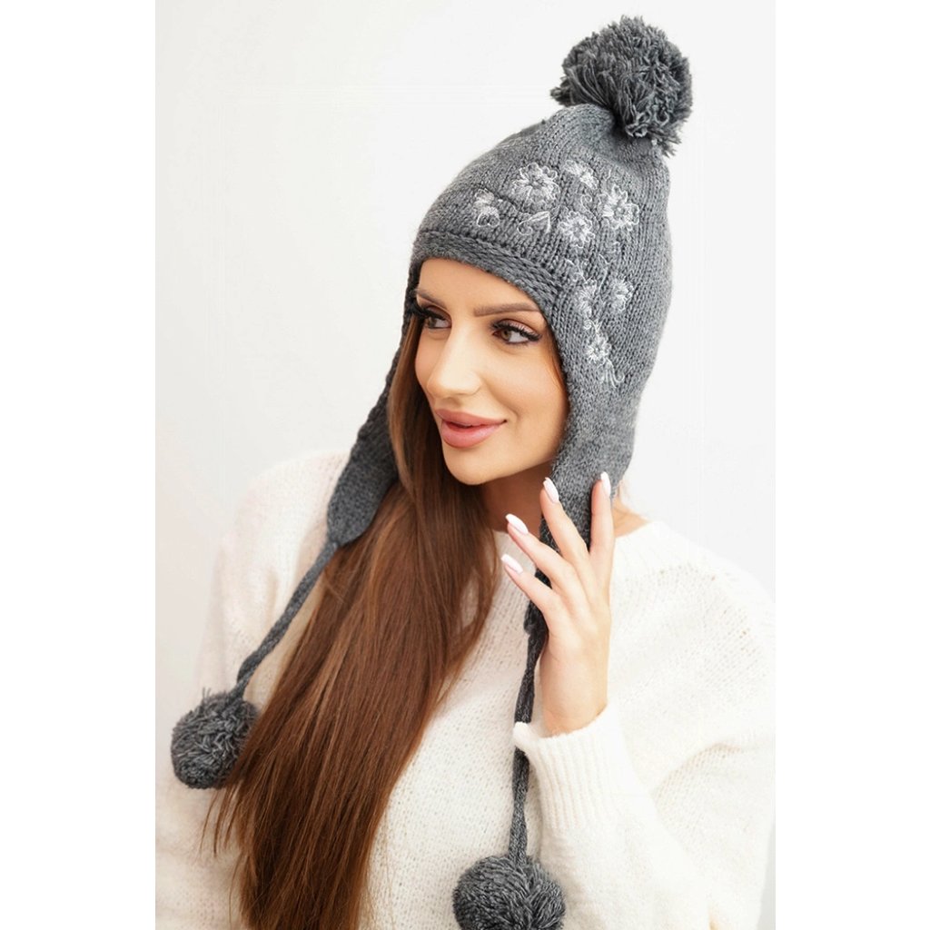 Teplá a štýlová baranica s roztomilými brmbolcami a jemným, vyšitým vzorom. Model ideálny na zimné dni – zaručuje pohodlie, chráni uši pred vetrom a pritiahne pohľady originálnym dizajnom.