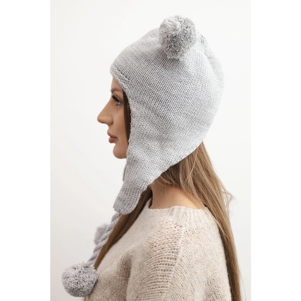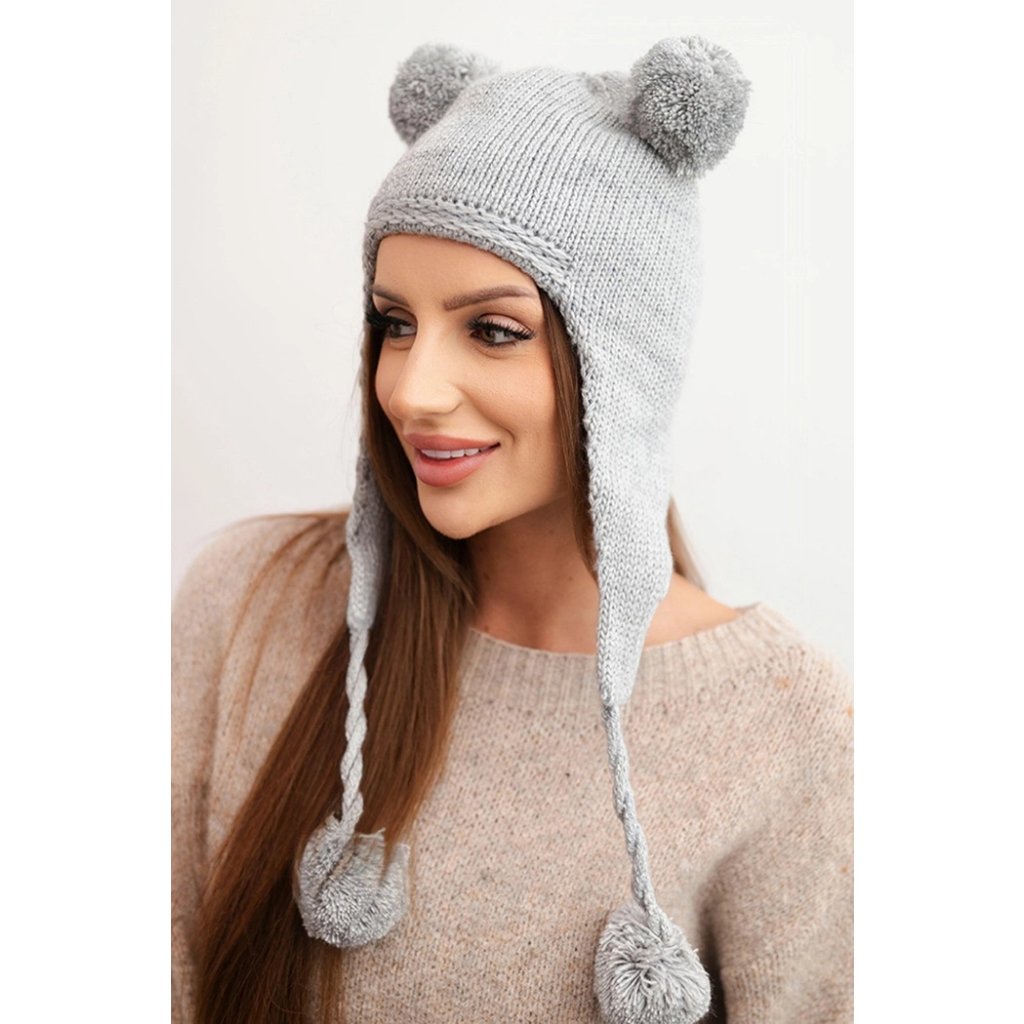 Dámska zimná vlnená čiapka s brmbolcami ušianka medveď K476 sivá