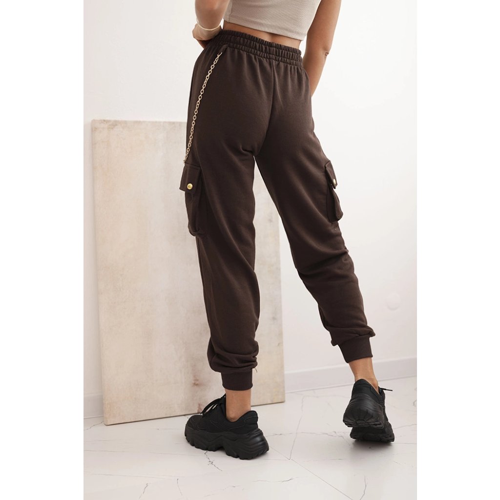 Dámske bavlnené cargo nohavice s vreckami a reťazou hnedé
