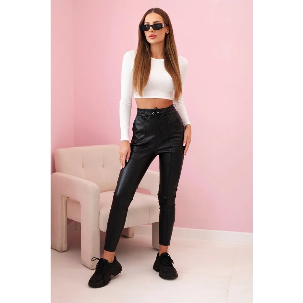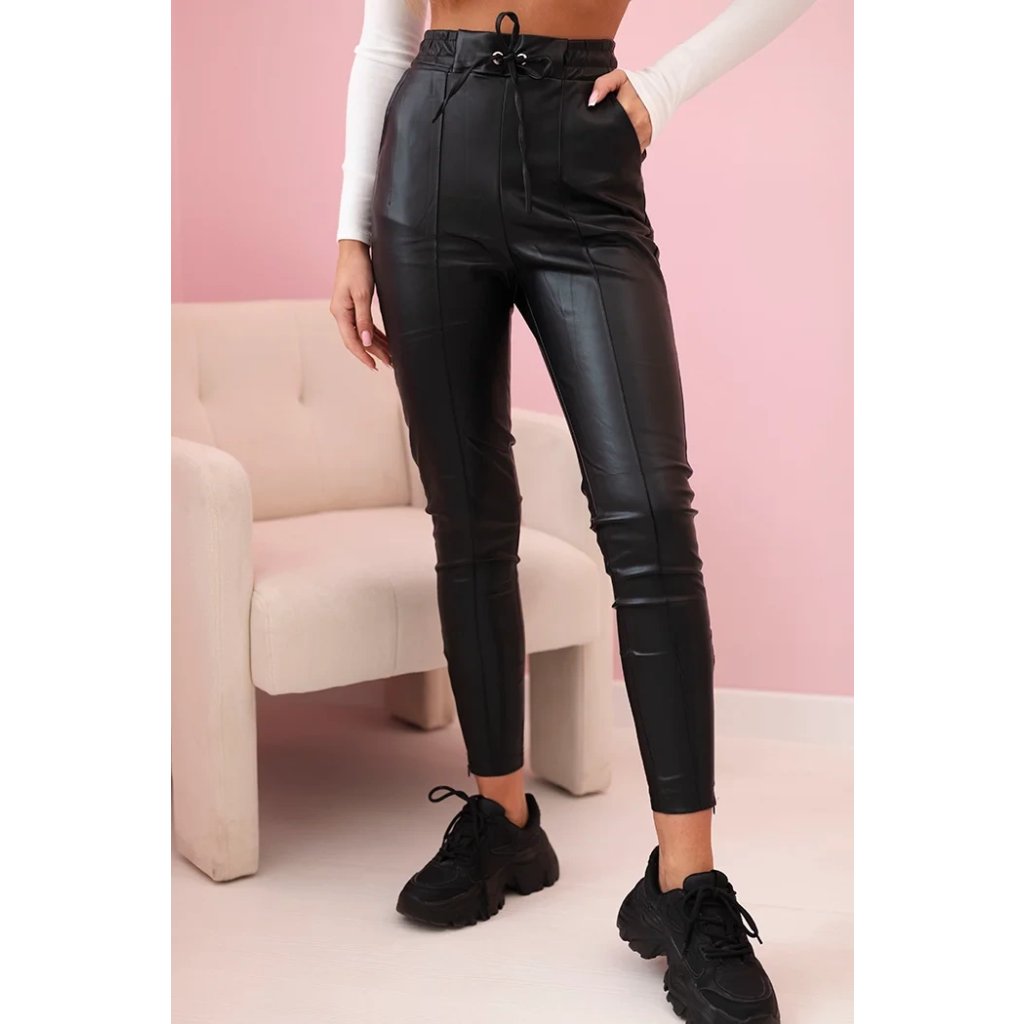 Dámske nohavice z eko-kože so šnurovaním a rozparkom na nohavici čierne