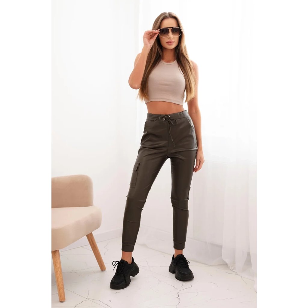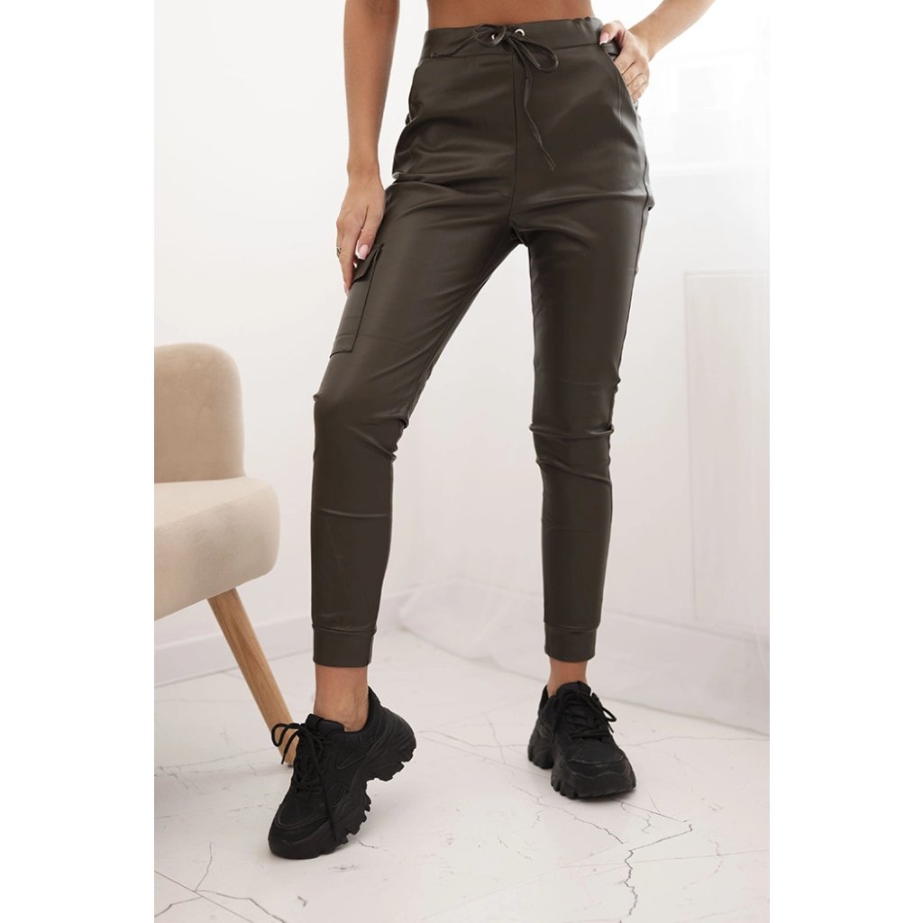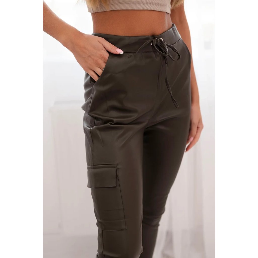 Dámske nohavice z ekokože s vreckami a viazaním v páse khaki