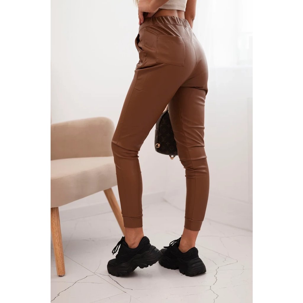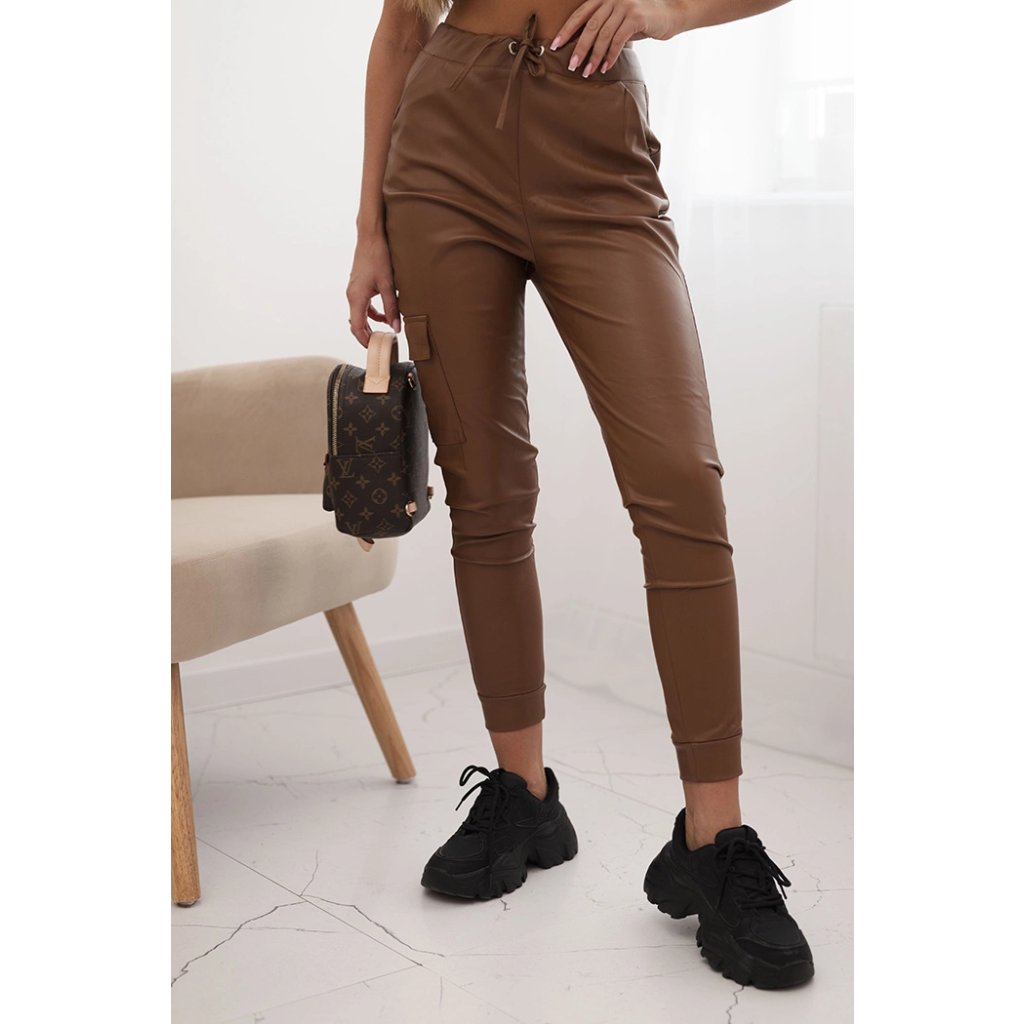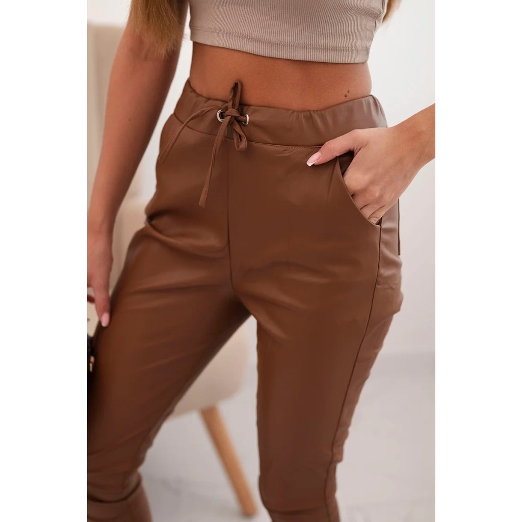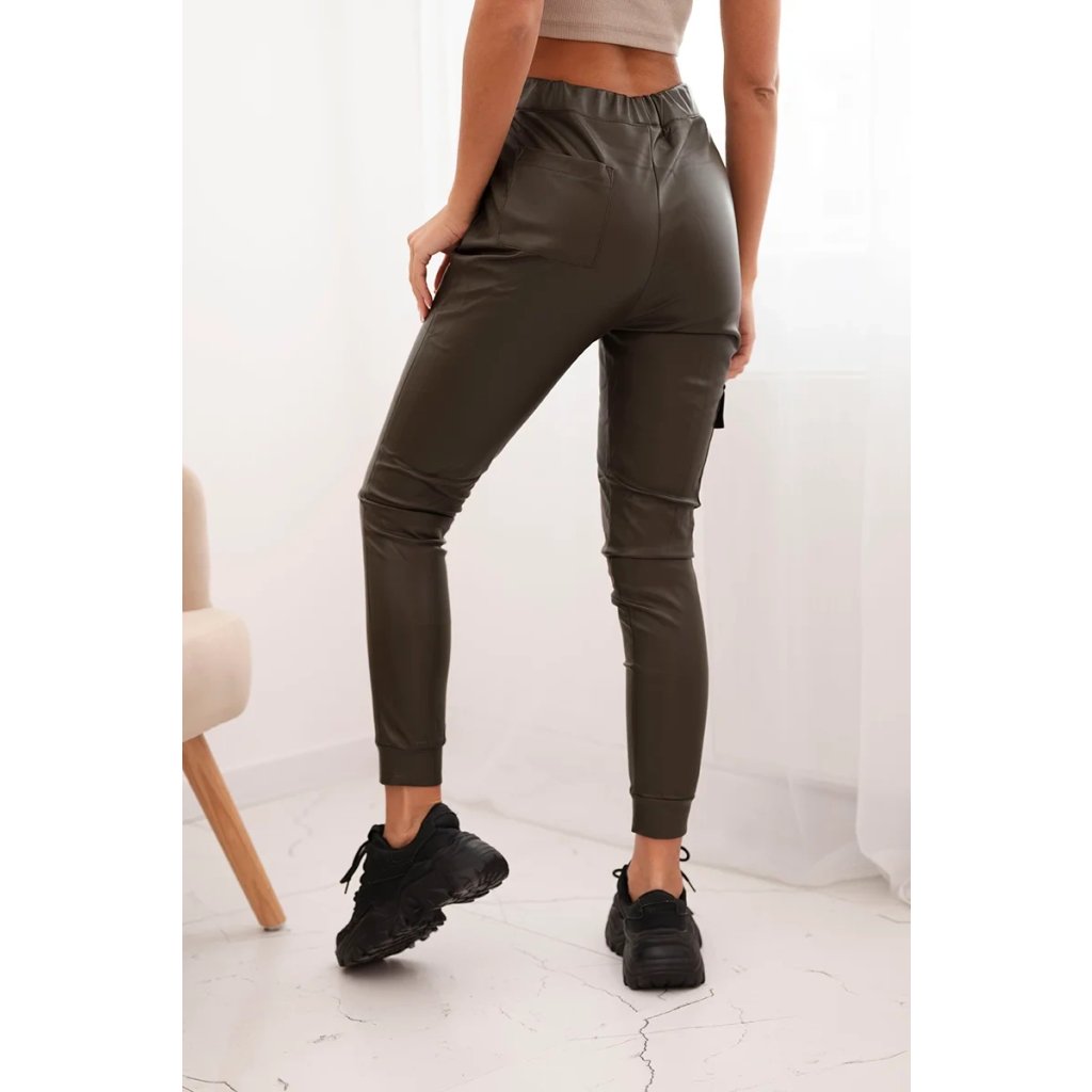 Dámske nohavice z ekokože s vreckami a viazaním v páse khaki