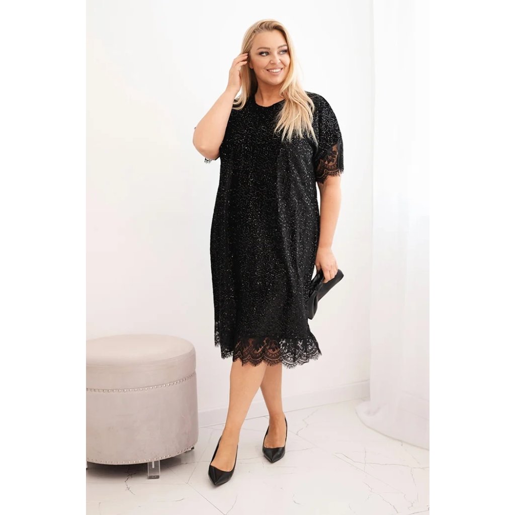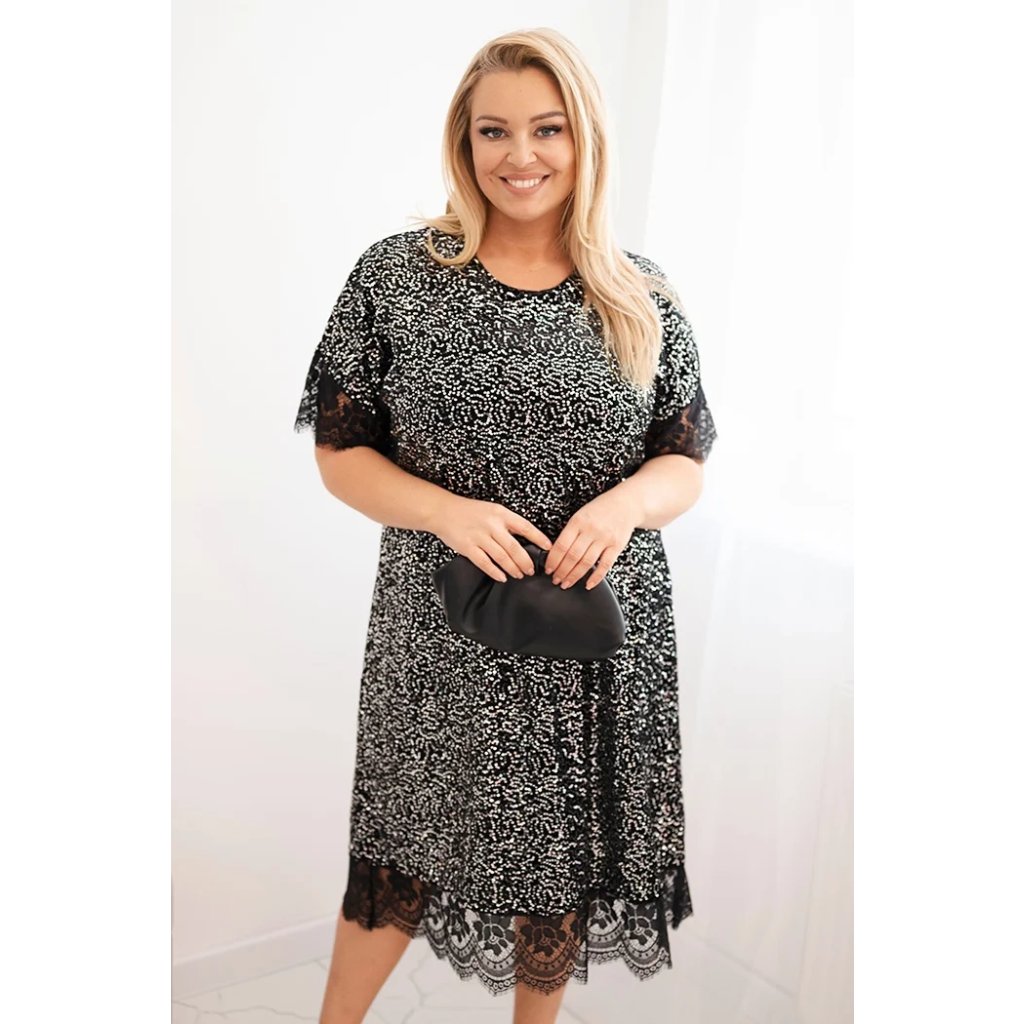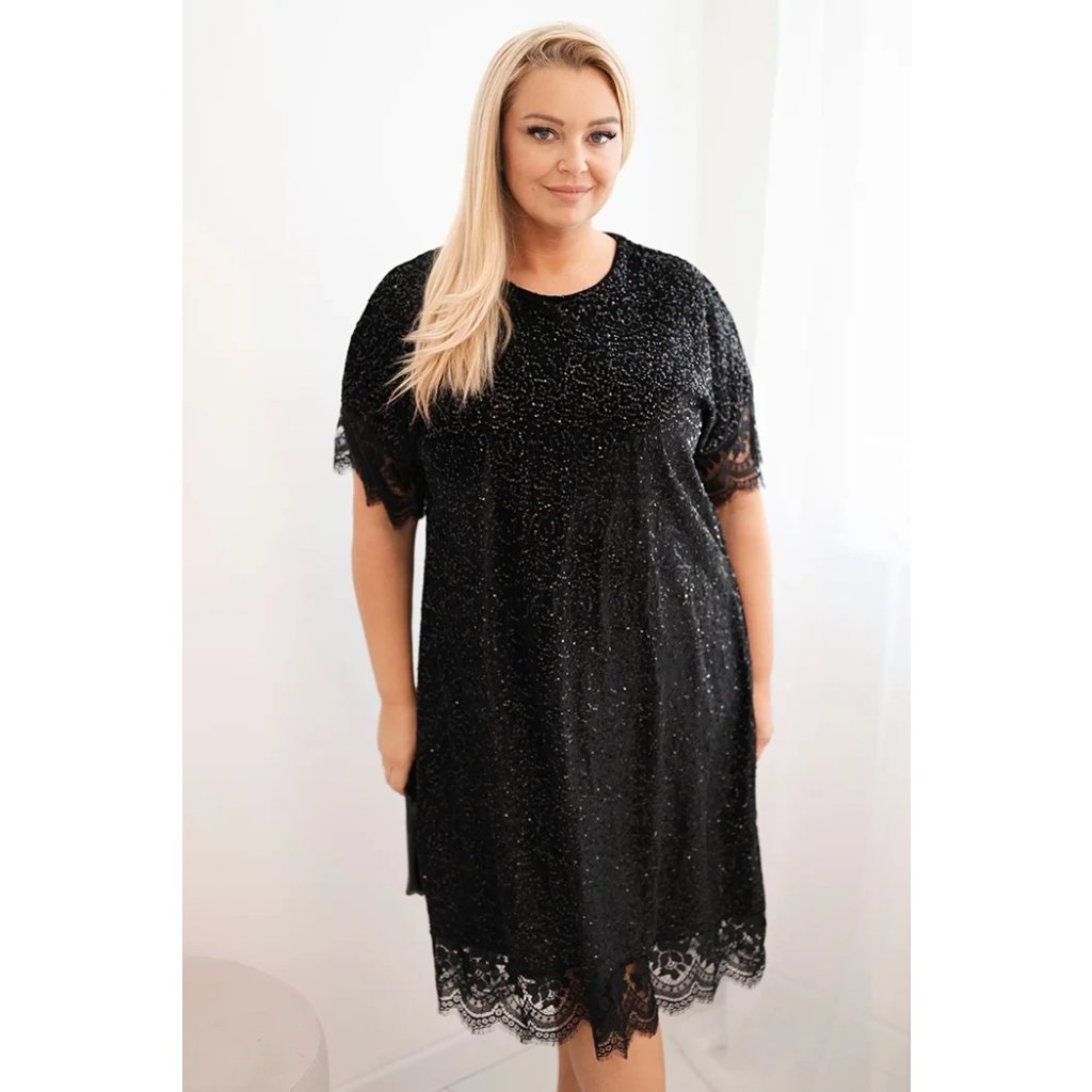Dámske šaty Plus Size s flitrami a čipkovým zakončením čierne