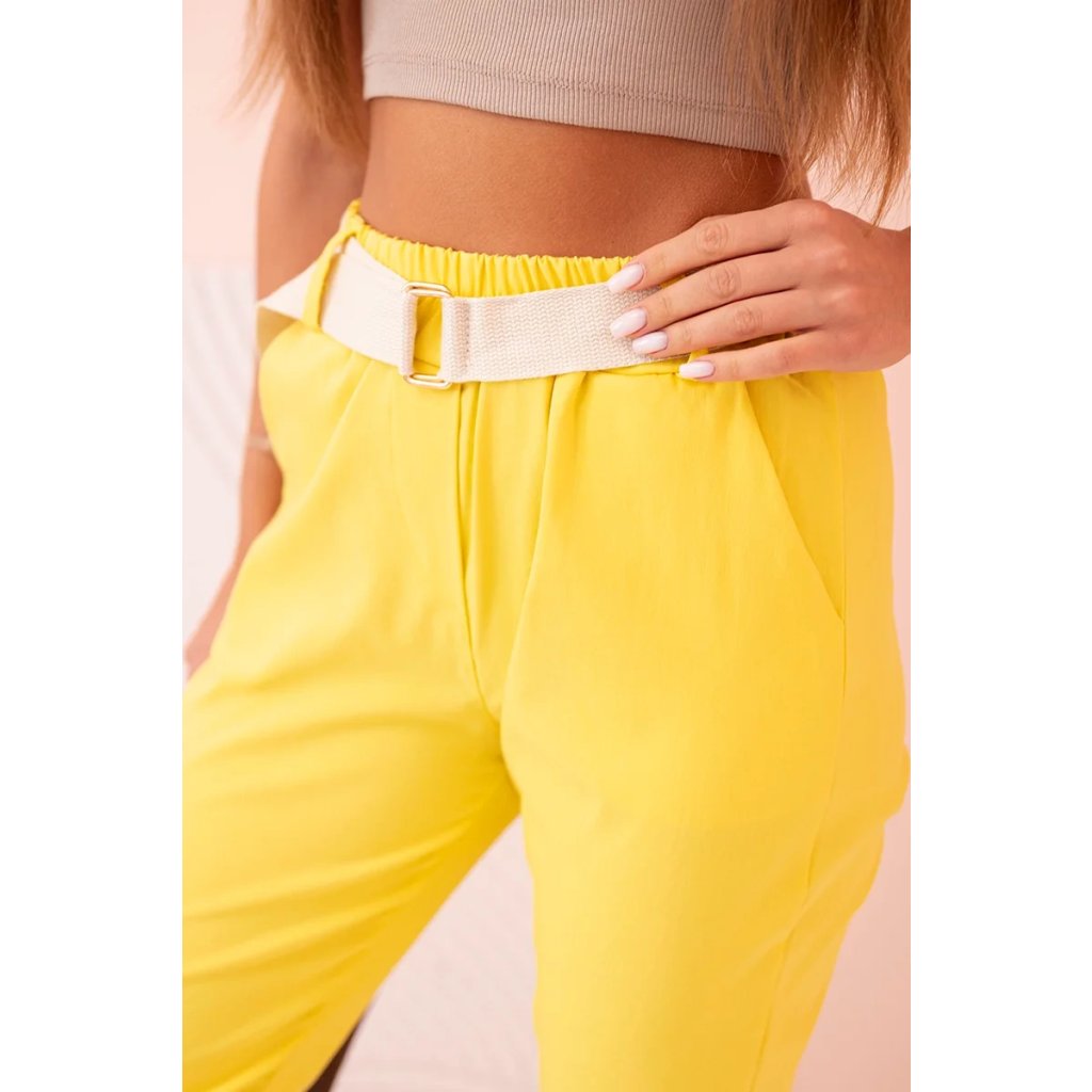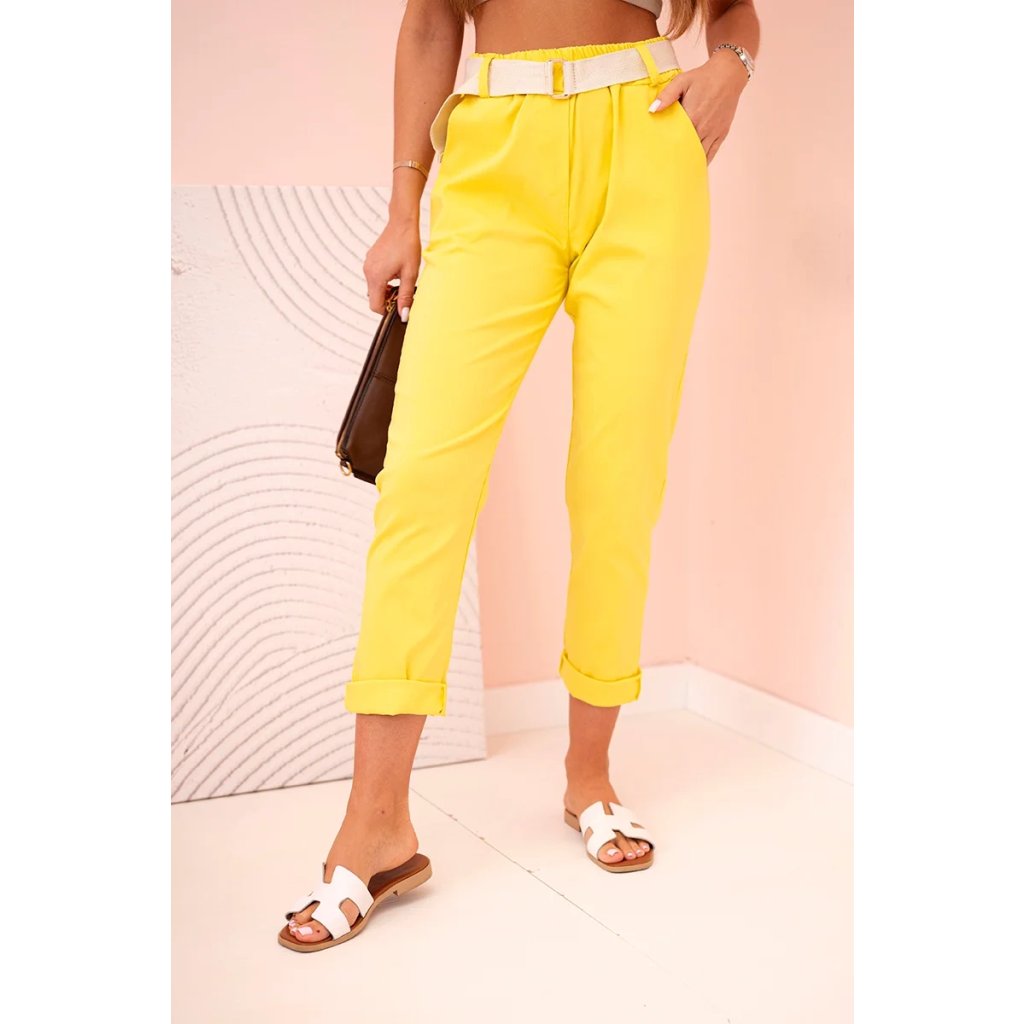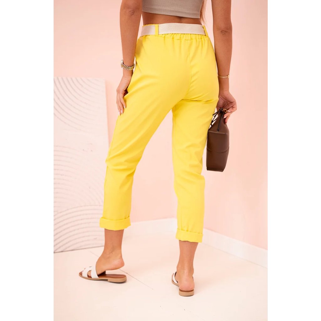 Dámske viskózové nohavice s opaskom a ohrnutými nohavicami tmavožlté
