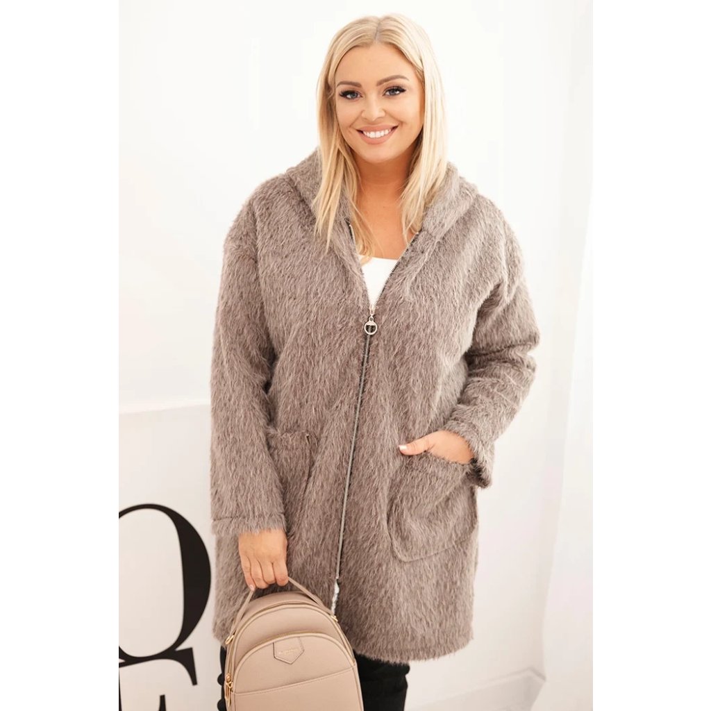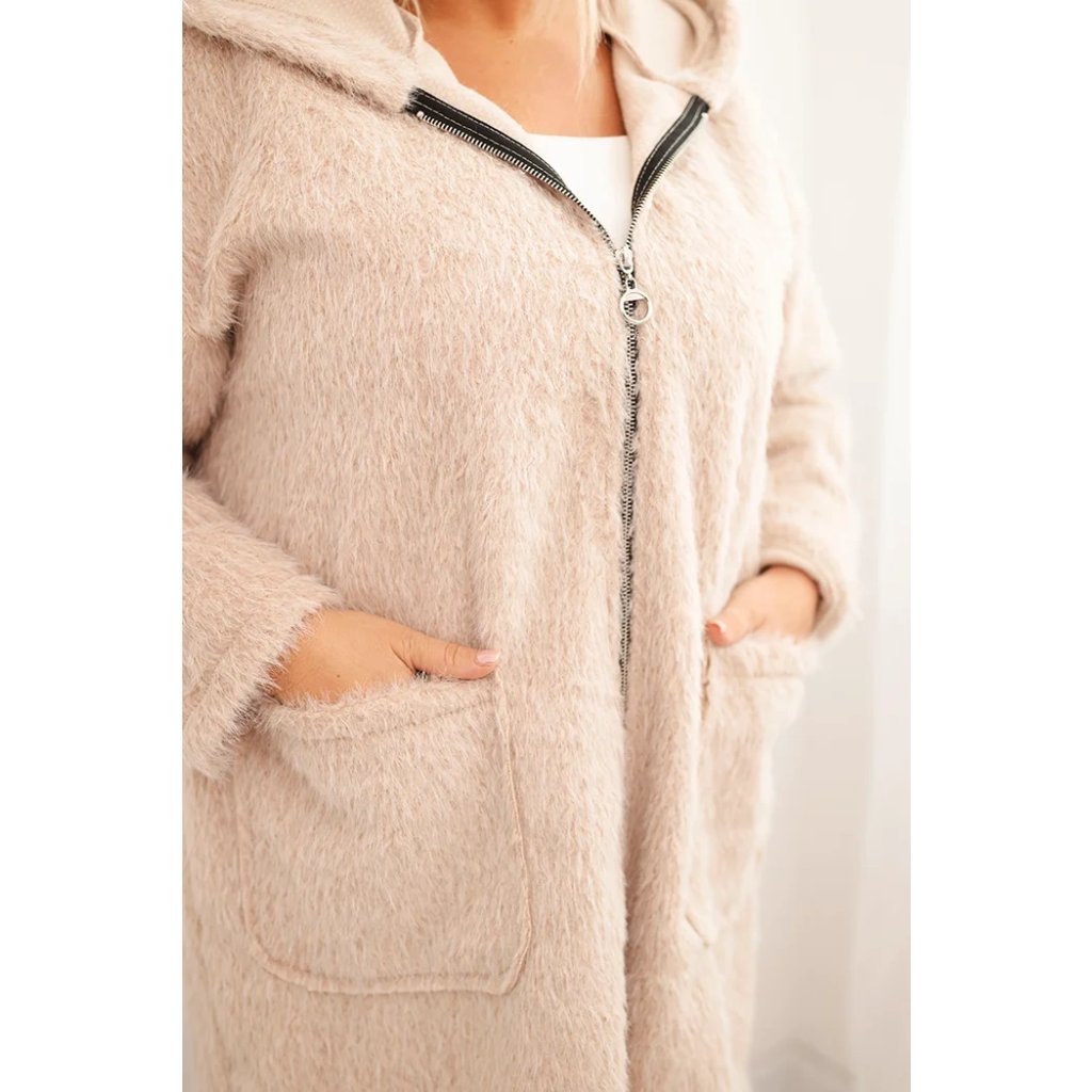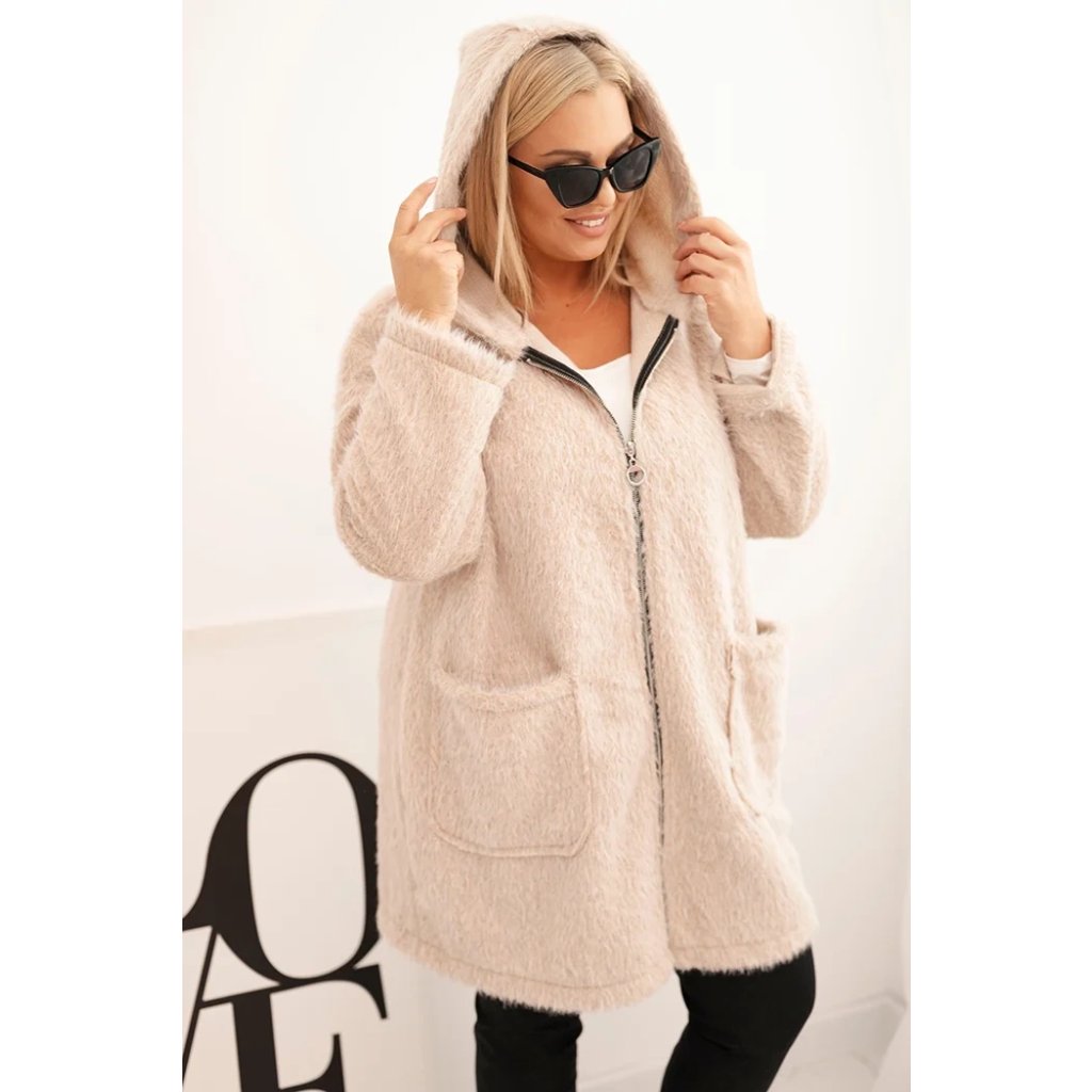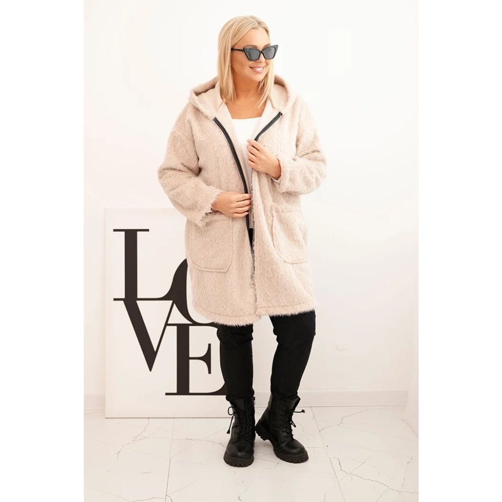 Dámsky kabát Plus Size z viskózy na zips s kapucňou béžový