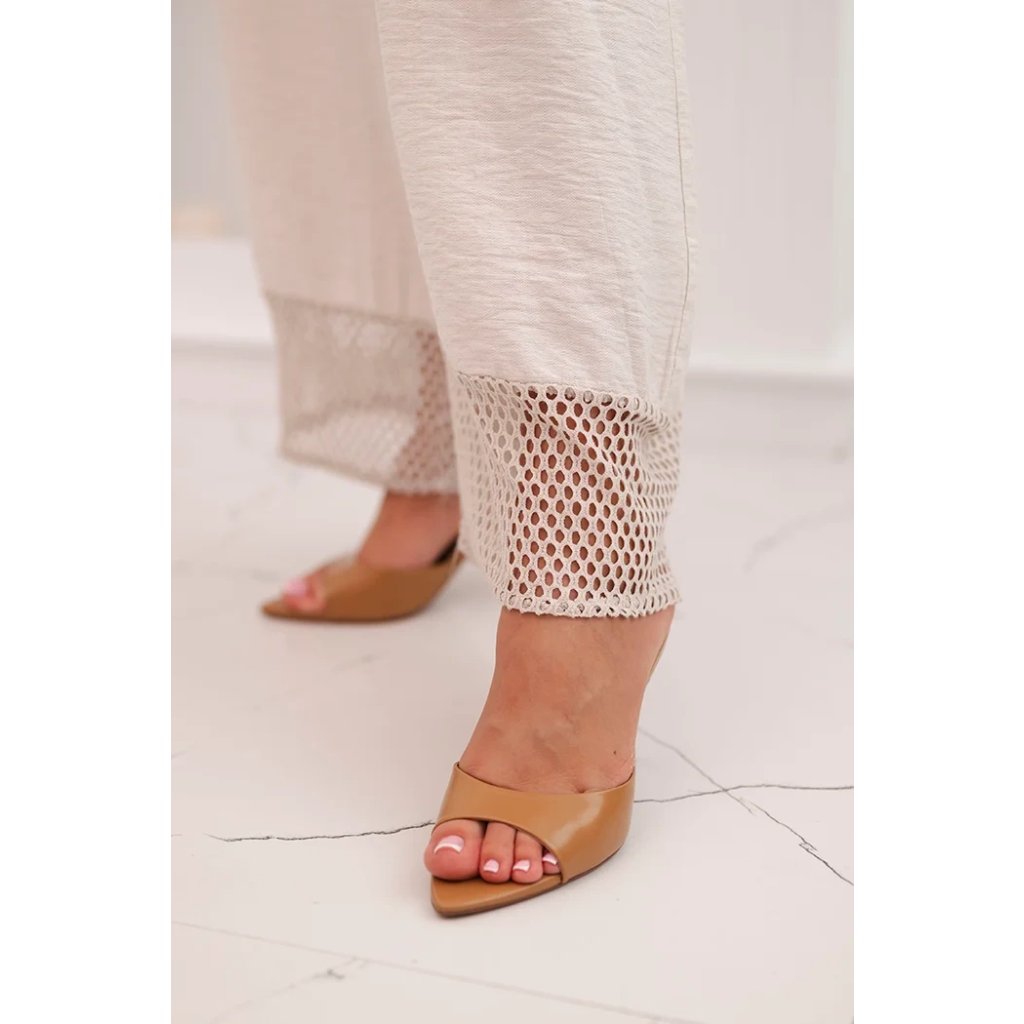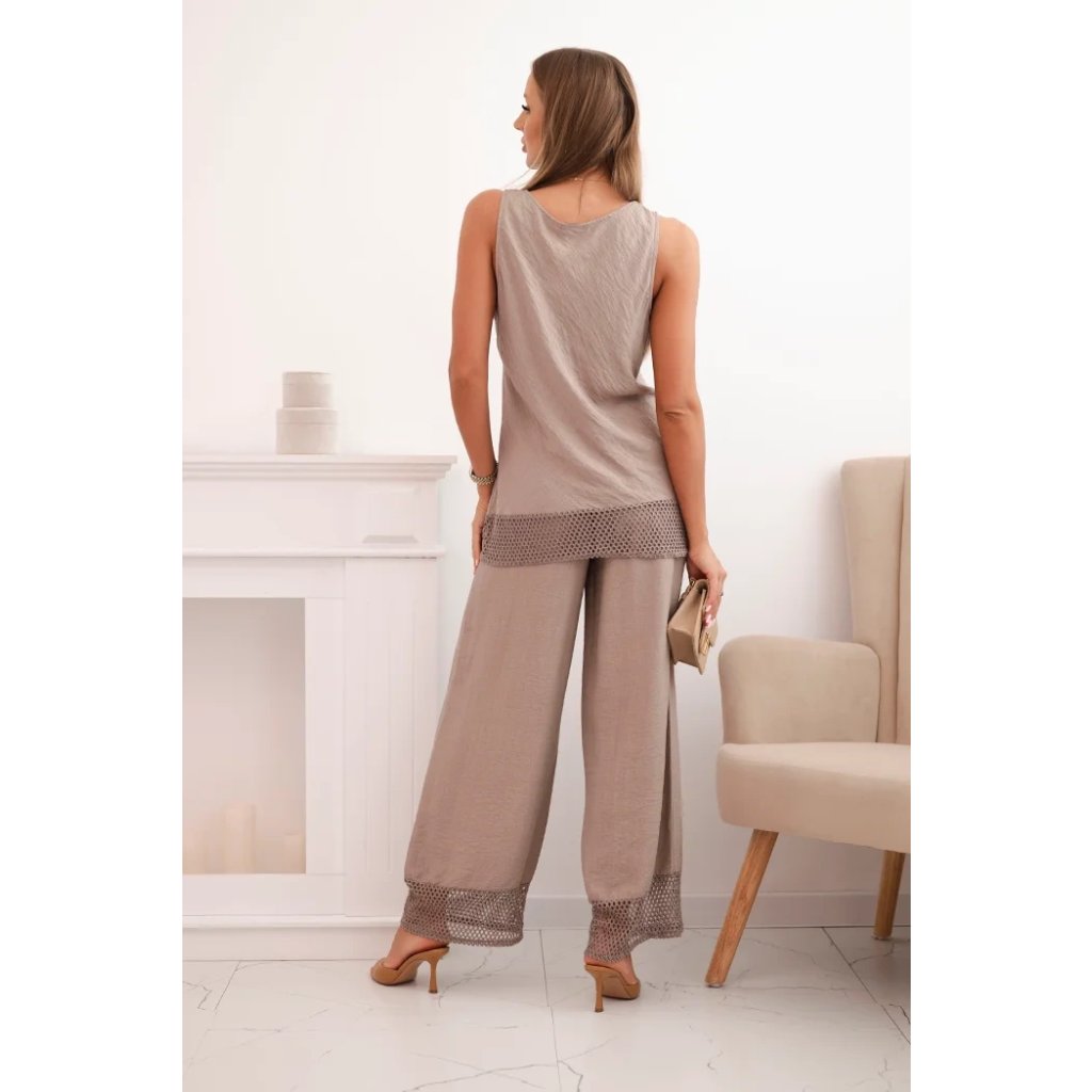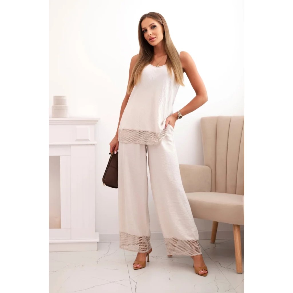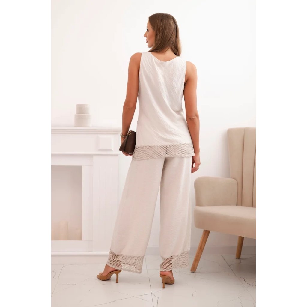 Dámsky komplet z viskózy blúzka na širokých ramienkach a nohavice so širokými nohavicami béžový