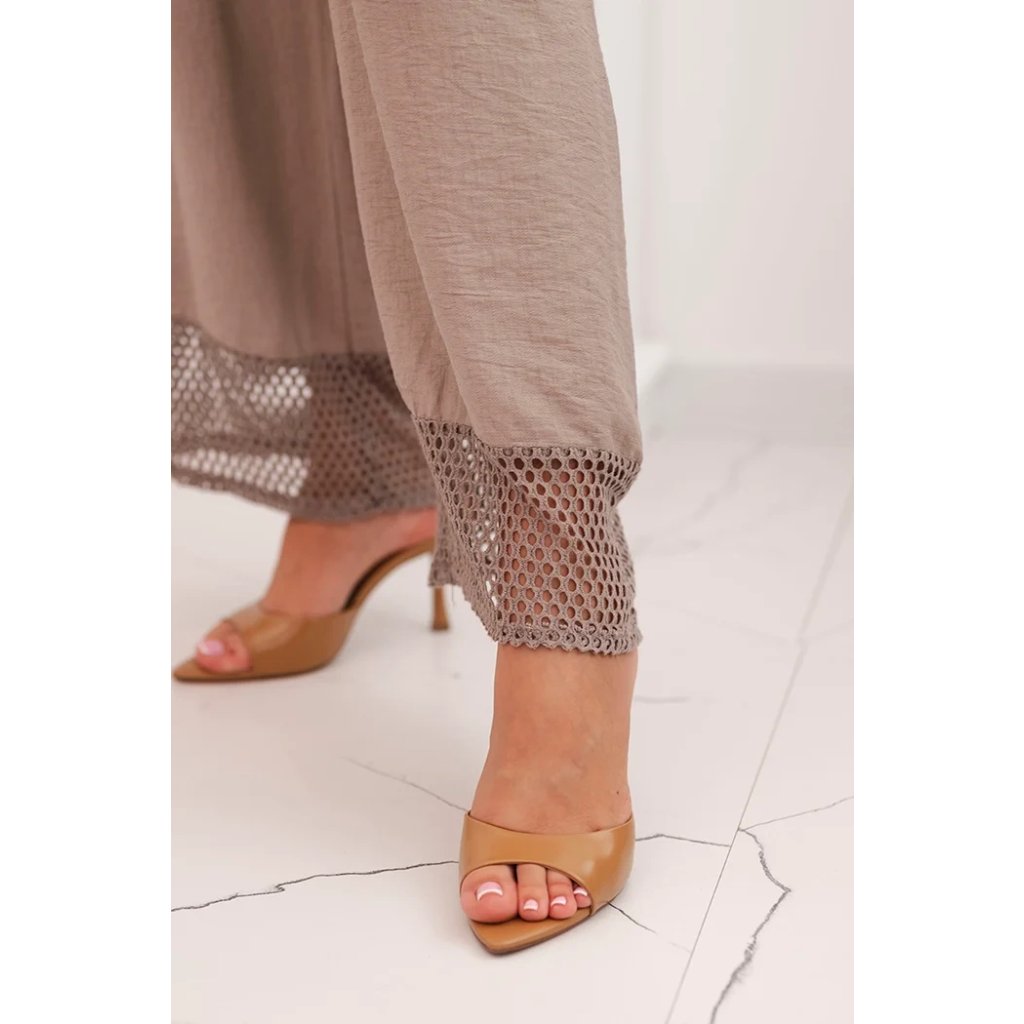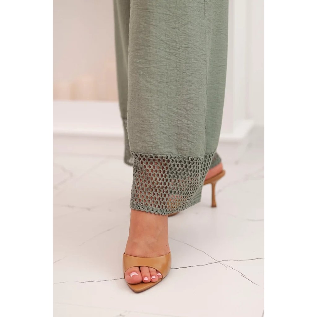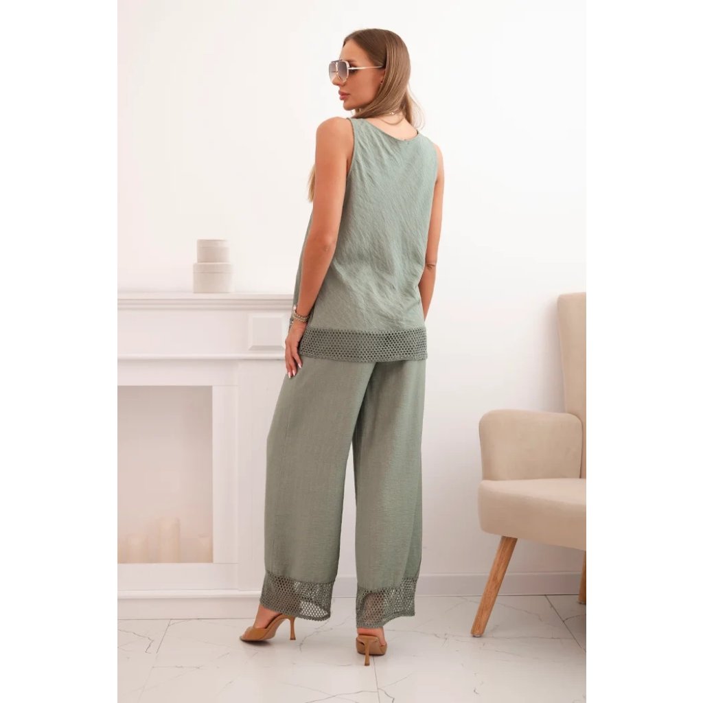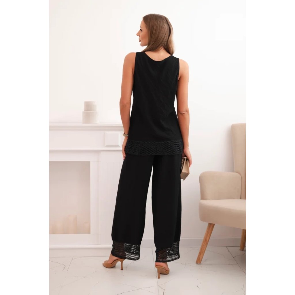 Dámsky set pozostávajúci z ľahkej blúzky na širokých ramienkach a pohodlných nohavíc so širokou nohavicou, ideálny na teplé dni a neformálne štýly. Vyrobené zo 100% viskózy, materiál je vzdušný, mäkký a príjemný na dotyk, čo zaručuje komfort počas celého dňa nosenia. Blúzka sa vyznačuje jemnou ozdobou z ažúrovej tkaniny na spodku, ktorá pridáva štýlový charakter, a nohavice majú elastický pás, čo zaručuje vynikajúce prispôsobenie sa postave. Veľkosť je univerzálna a bude vhodná pre dámy veľkosti S, M alebo L.