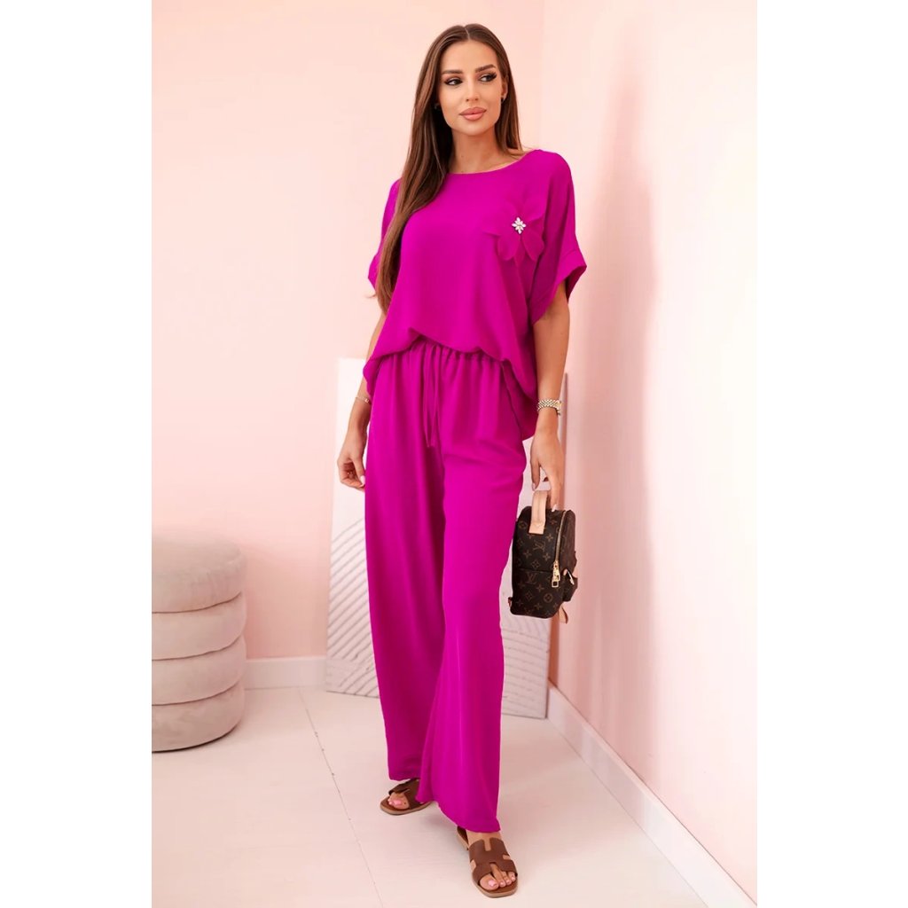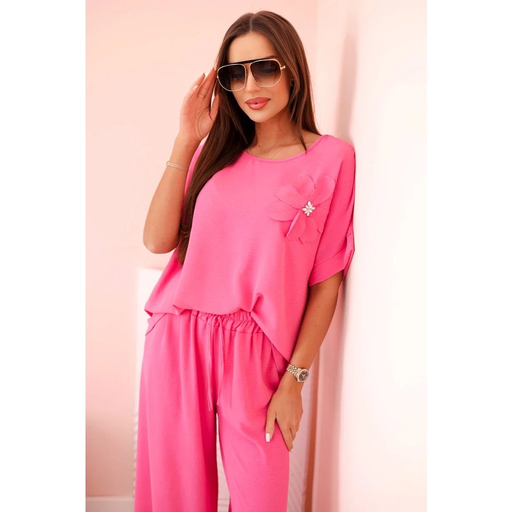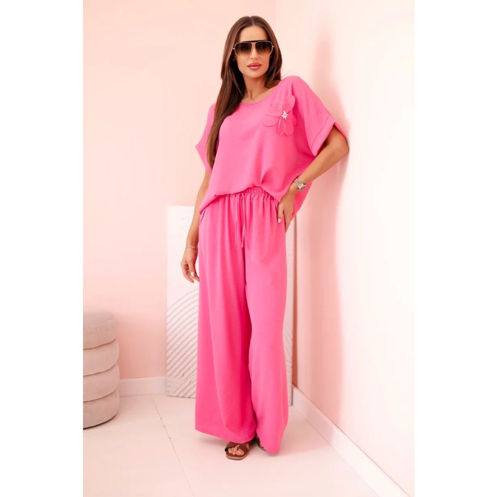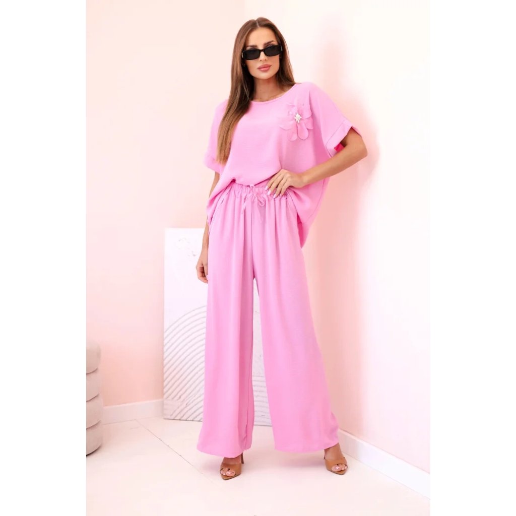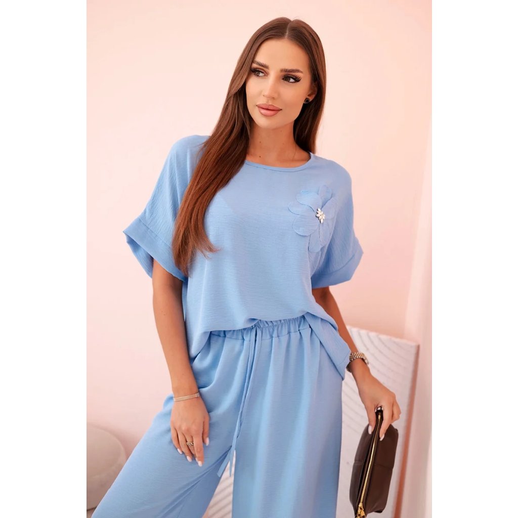 Pohodlný a efektný dámsky komplet ušitý z mäkkej, elastickej viskózovej pleteniny je ideálnou voľbou na každý deň a neformálne výlety. Blúzka vo voľnom strihu s krátkym rukávom bola ozdobená veľkým aplikovaným kvetom so žiarivým stredom, čo jej dodáva jedinečný charakter. Nohavice so širokou nohavicou a elastickým pásom na gumičke a viazaním zaručujú úplnú voľnosť pohybu a pohodlie. Komplet perfektne vyzerá v domácej, aj v mestskej verzii – stačí vybrať vhodné doplnky!