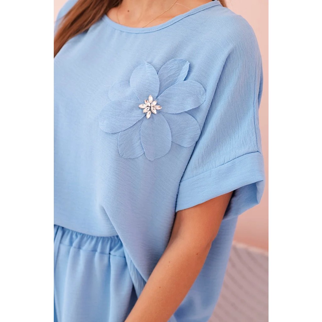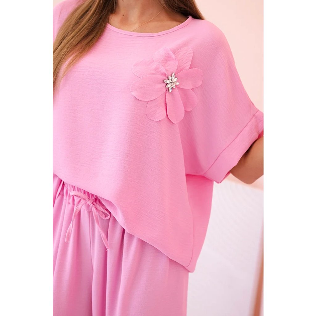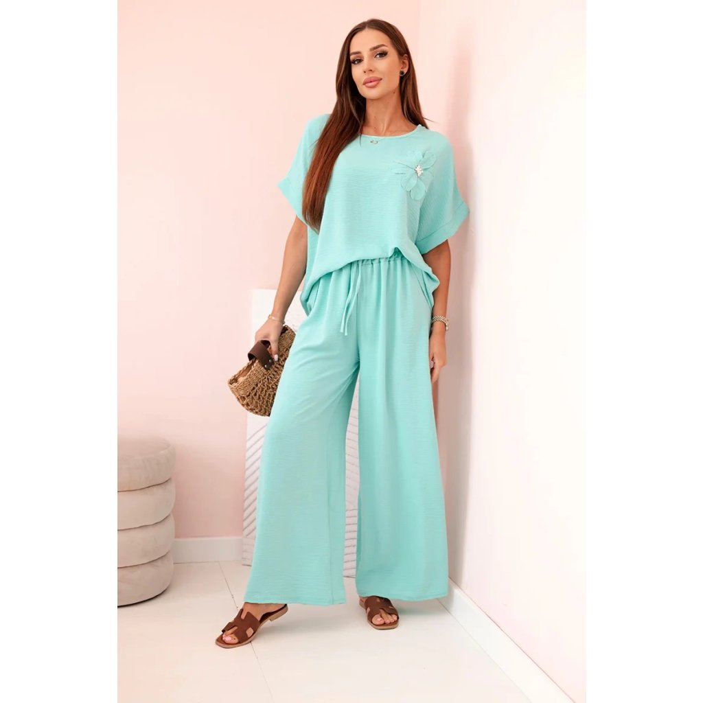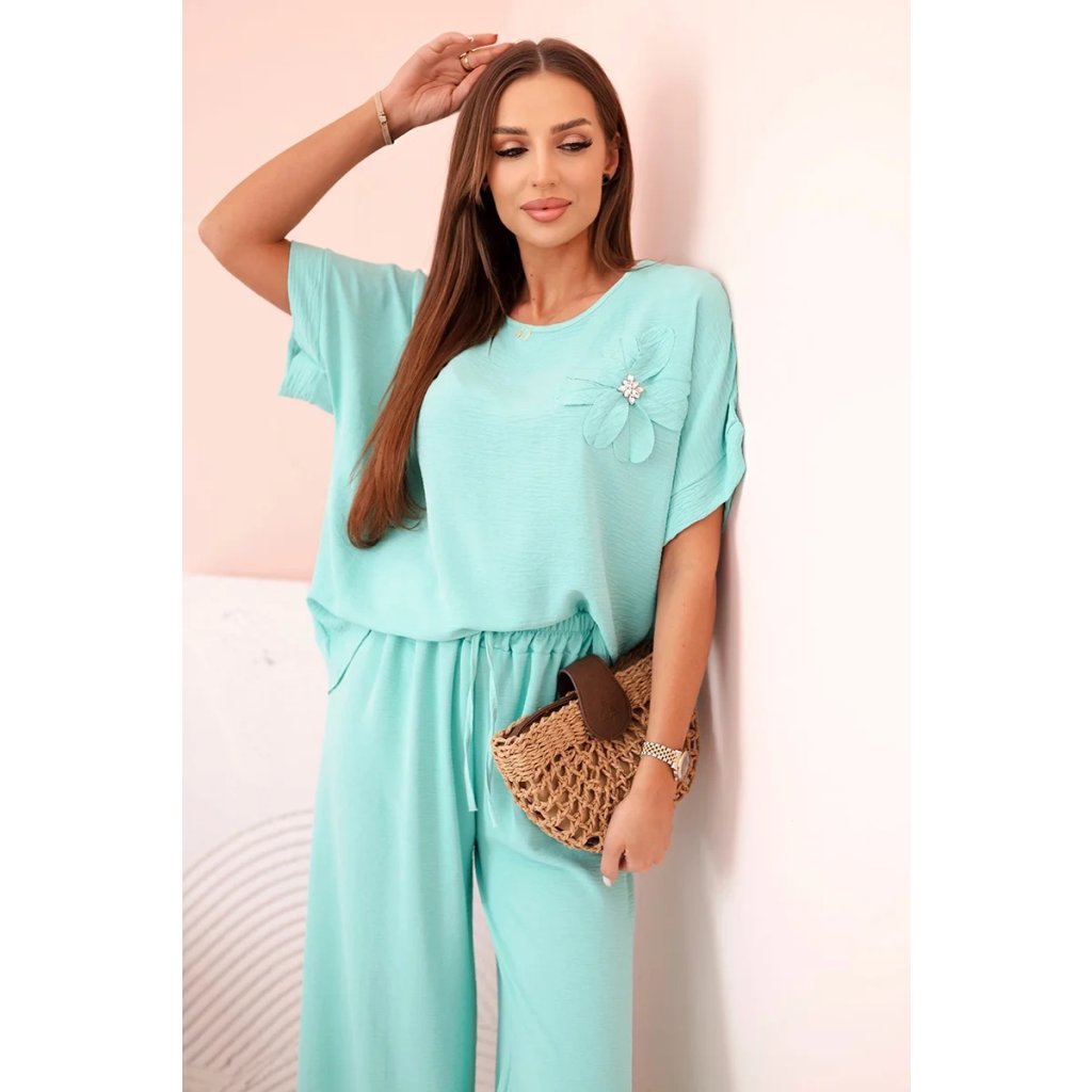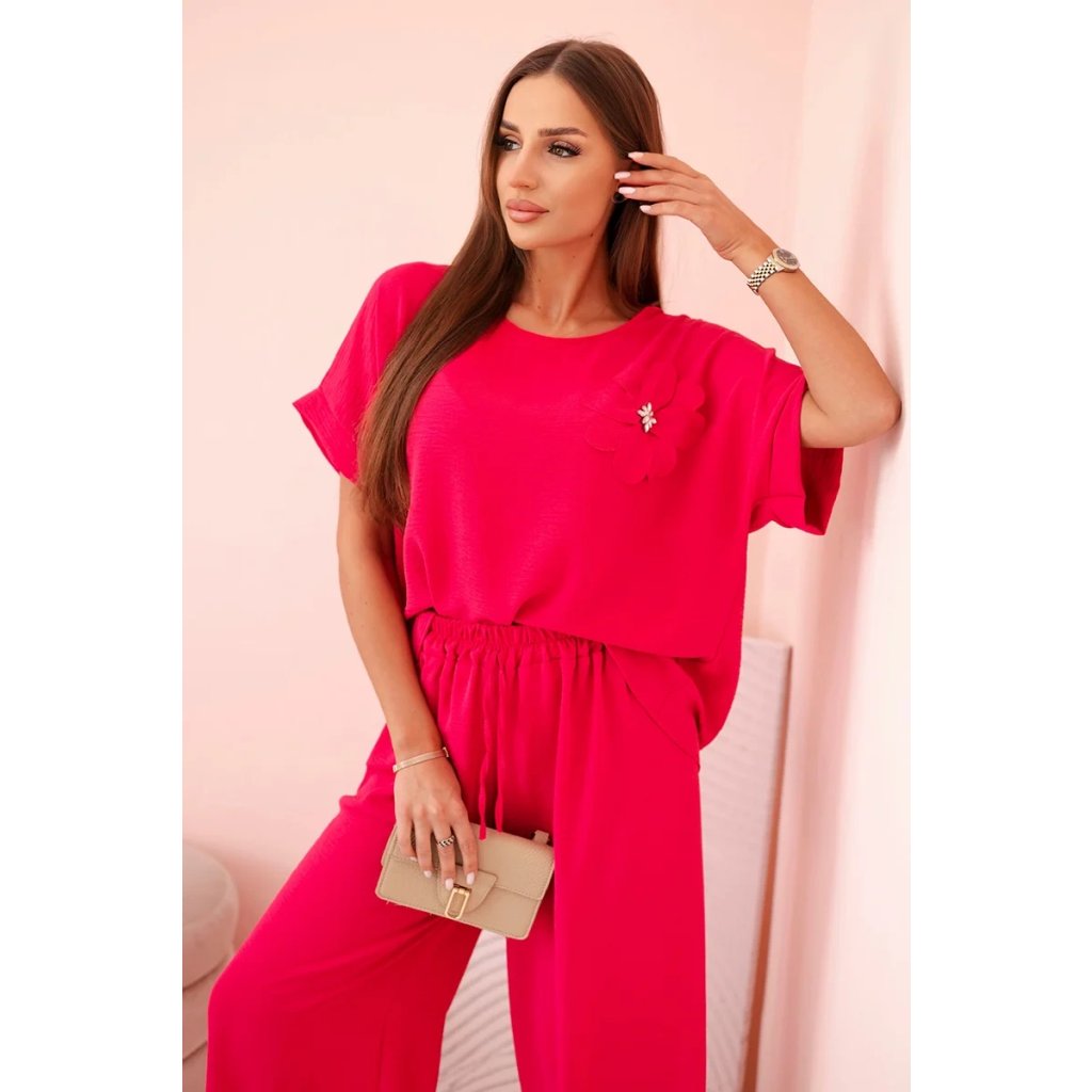 Pohodlný a efektný dámsky komplet ušitý z mäkkej, elastickej viskózovej pleteniny je ideálnou voľbou na každý deň a neformálne výlety. Blúzka vo voľnom strihu s krátkym rukávom bola ozdobená veľkým aplikovaným kvetom so žiarivým stredom, čo jej dodáva jedinečný charakter. Nohavice so širokou nohavicou a elastickým pásom na gumičke a viazaním zaručujú úplnú voľnosť pohybu a pohodlie. Komplet perfektne vyzerá v domácej, aj v mestskej verzii – stačí vybrať vhodné doplnky!