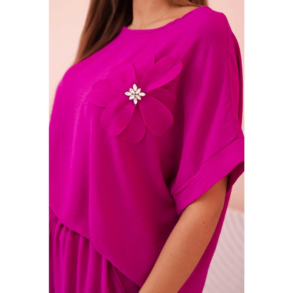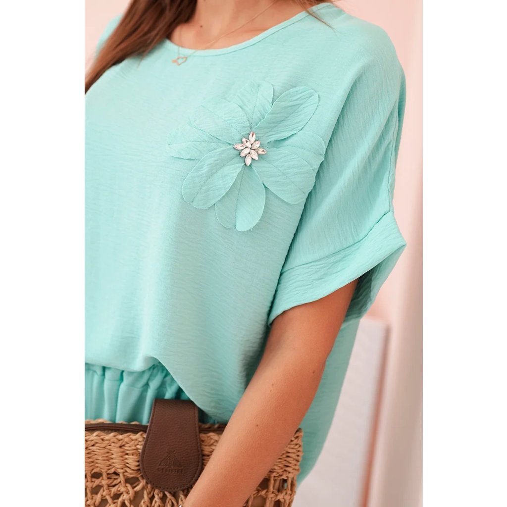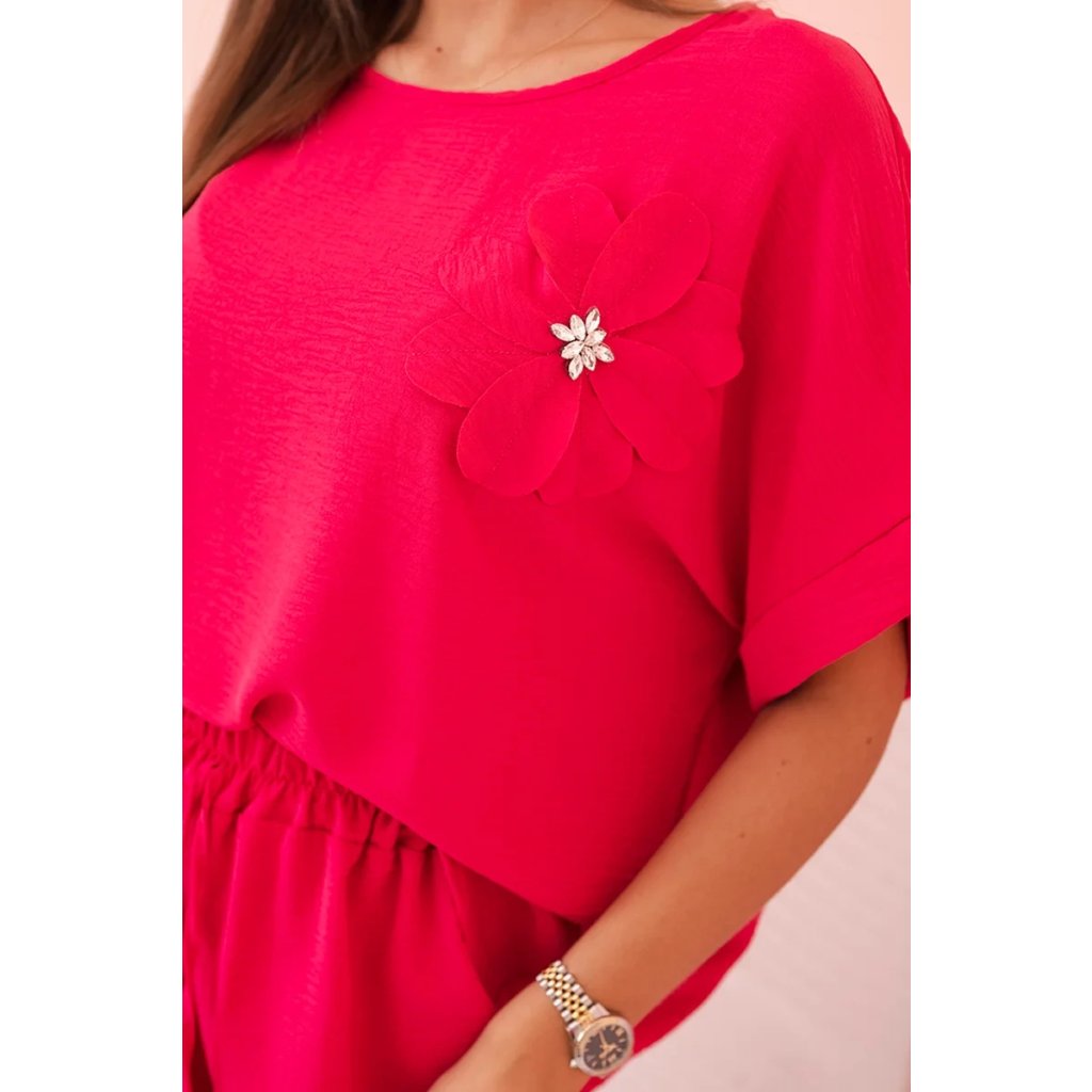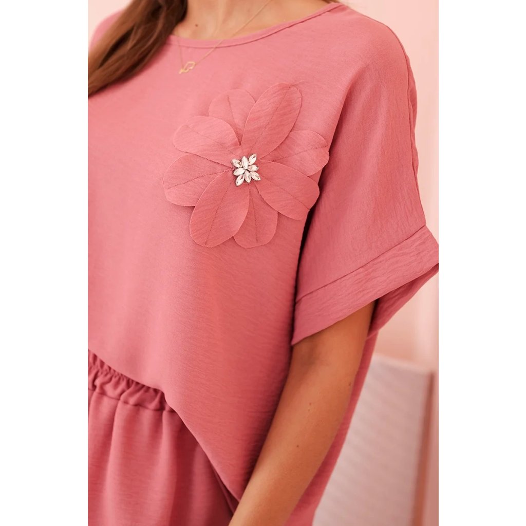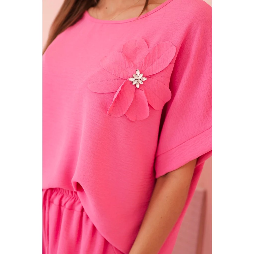 Pohodlný a efektný dámsky komplet ušitý z mäkkej, elastickej viskózovej pleteniny je ideálnou voľbou na každý deň a neformálne výlety. Blúzka vo voľnom strihu s krátkym rukávom bola ozdobená veľkým aplikovaným kvetom so žiarivým stredom, čo jej dodáva jedinečný charakter. Nohavice so širokou nohavicou a elastickým pásom na gumičke a viazaním zaručujú úplnú voľnosť pohybu a pohodlie. Komplet perfektne vyzerá v domácej, aj v mestskej verzii – stačí vybrať vhodné doplnky!
