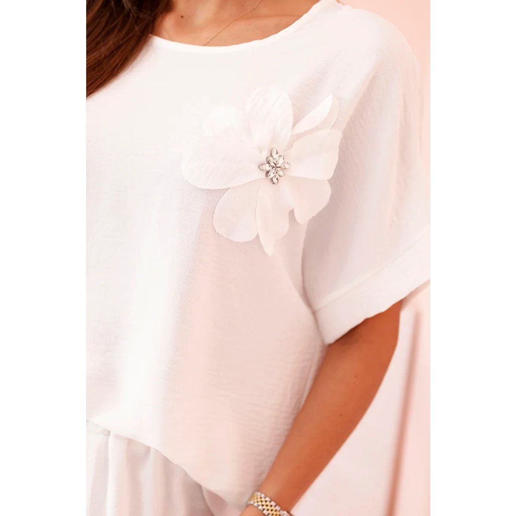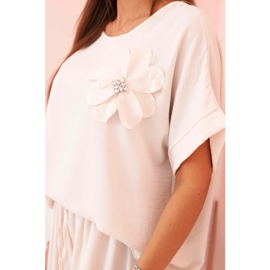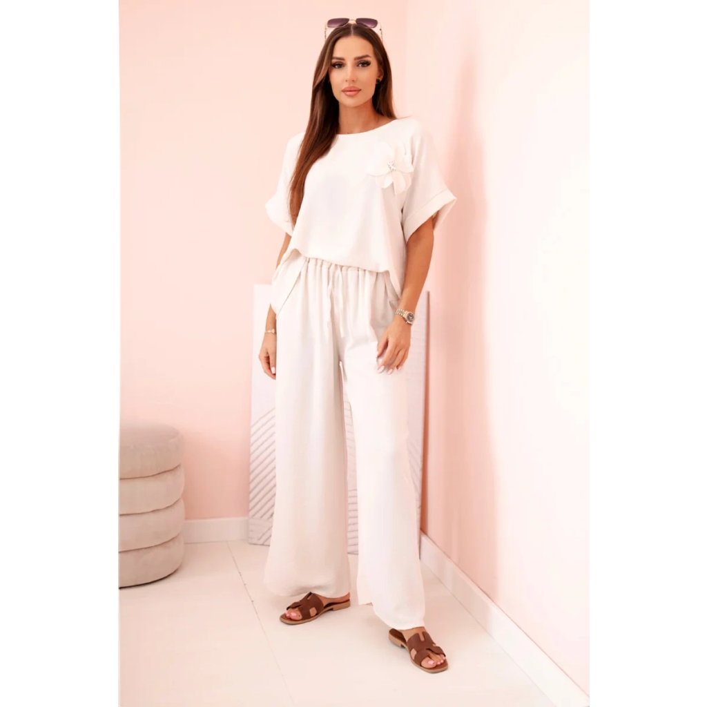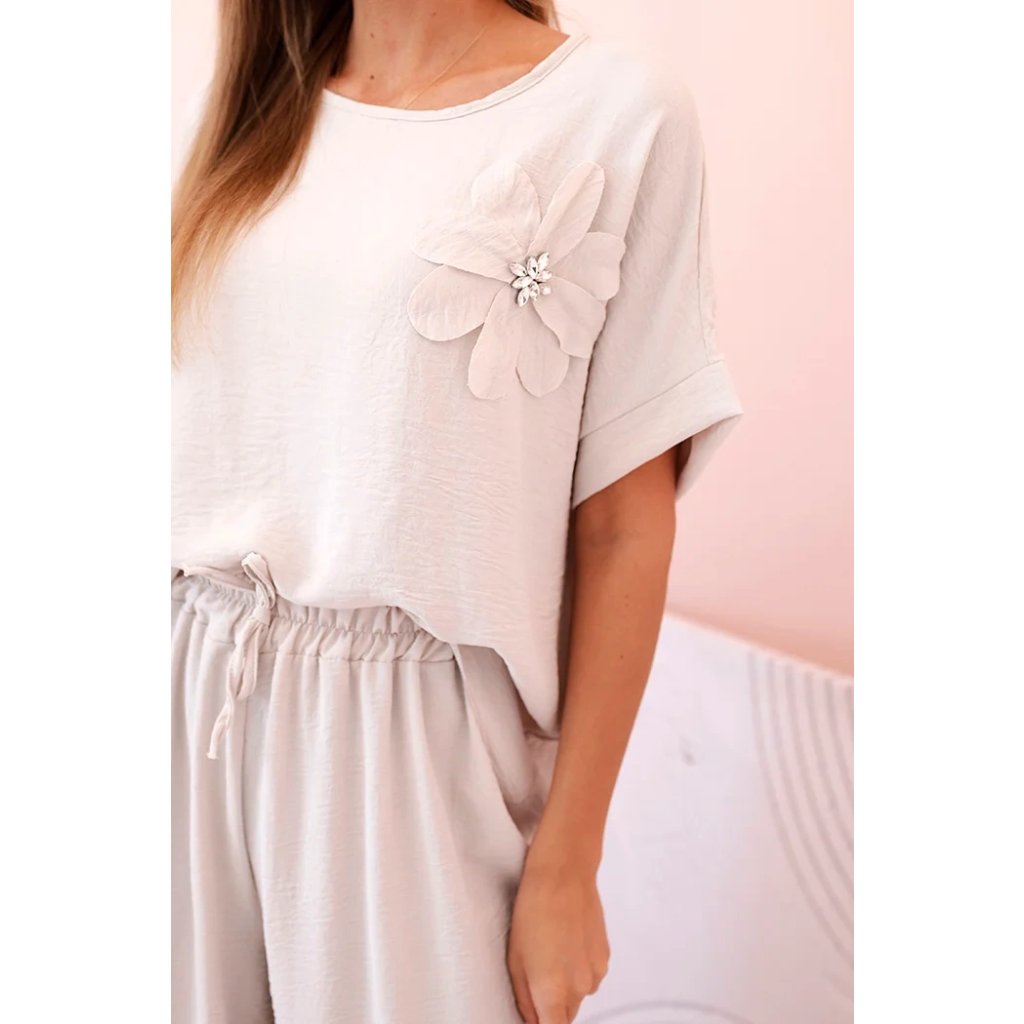 Dámsky komplet z viskózy s ozdobným kvetom a širokými nohavicami béžový