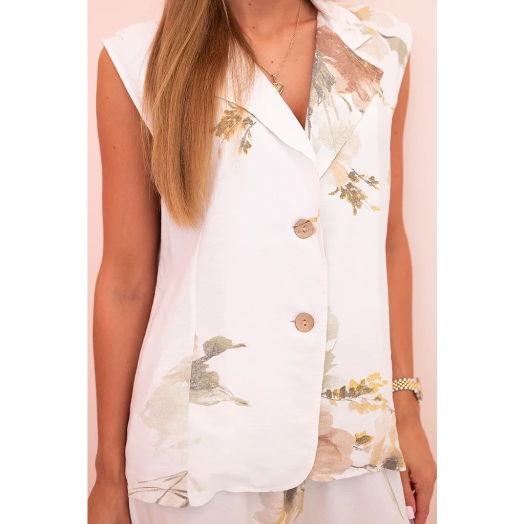 Dámsky komplet z viskózy vesta a nohavice s kvetmi biela