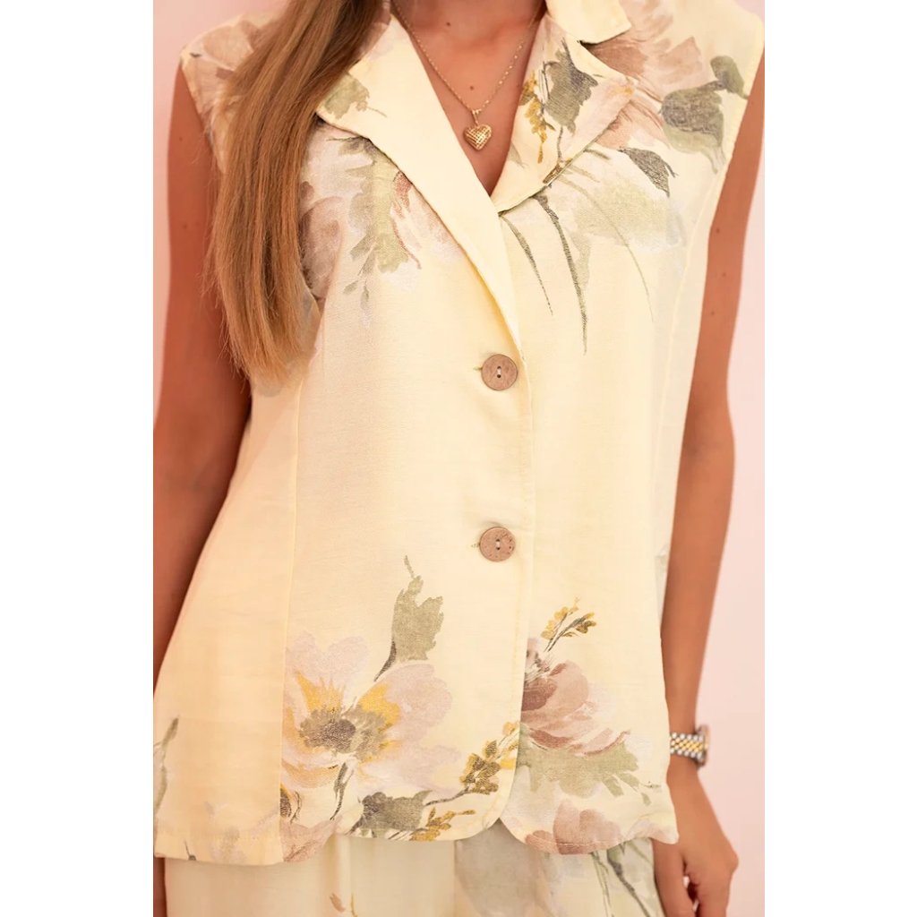 Tento dámsky komplet je ideálnou voľbou pre ženy, ktoré si cenia ľahkosť, eleganciu a prírodné materiály. Pozostáva z vesty bez rukávov s klasickým golierom a gombíkmi a dlhých nohavíc so širokými nohavicami. Celok je vyrobený z vysoko kvalitnej viskózy, ktorá zaručuje maximálny komfort nosenia, priedušnosť a jemnosť pre pokožku. Jemný kvetinový vzor pridáva ženský pôvab a dokonale sa hodí ako na bežné dni, tak aj na špeciálne príležitosti – od letných stretnutí po štýlové vychádzky. Veľkosť je univerzálna a bude vhodná pre dámy vo veľkosti S, M alebo L.