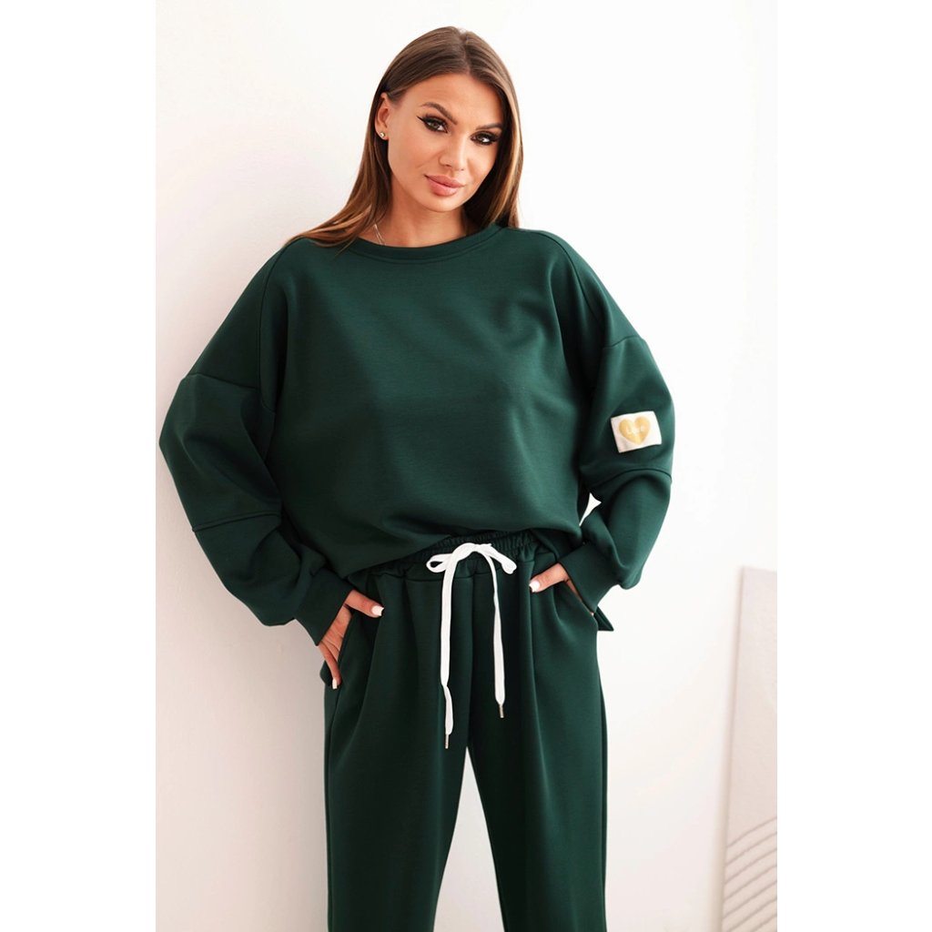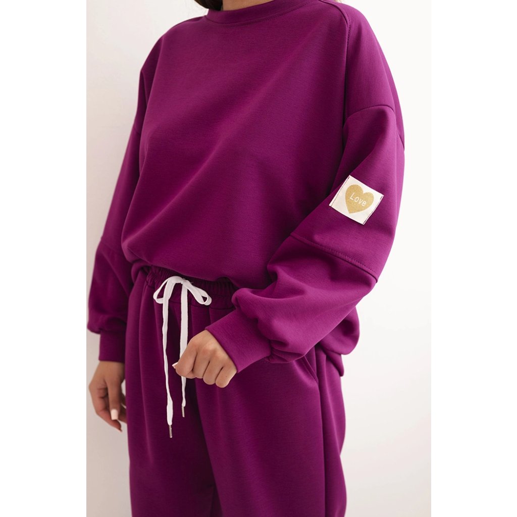 Elegantná dámska súprava vytvorená z mäkkej, elastickej viskózy s prídavkom polyesteru a elastanu je vynikajúcou voľbou pre ženy, ktoré si cenia pohodlie a módny vzhľad. Voľná mikina s predĺženou zadnou časťou a zníženou líniou ramien je ozdobená roztomilým detailom LOVE na rukávoch, čo jej dodáva výnimočný štýl. Nohavice s elastickým pásom a šnúrkou sa dokonale prispôsobia postave a manžety pri nohaviciach dodávajú športový charakter.