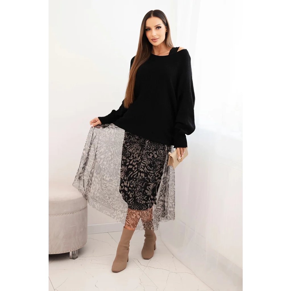 Štýlová a ženská sada pre dámy s mäkkým sveterom a tylovými šatami je ponuka, ktorá sa dokonale hodí nielen na každodenné nosenie, ale aj na výnimočné príležitosti. Vrch súpravy tvorí príjemný na dotyk sveter v uvoľnenom oversize strihu s dlhým rukávom, ktorý poskytuje pohodlie a moderné zakončenie stylingu. Spodok tvoria vzdušné šaty s jemným tylom ozdobeným subtílnym zvieracím vzorom – celok pôsobí veľmi žensky a elegantne.