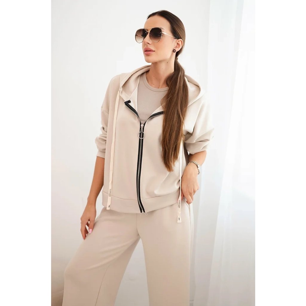 Dámsky súprava maslová so širokými nohavicami a zipsovou mikinou béžová
