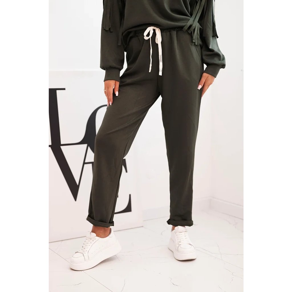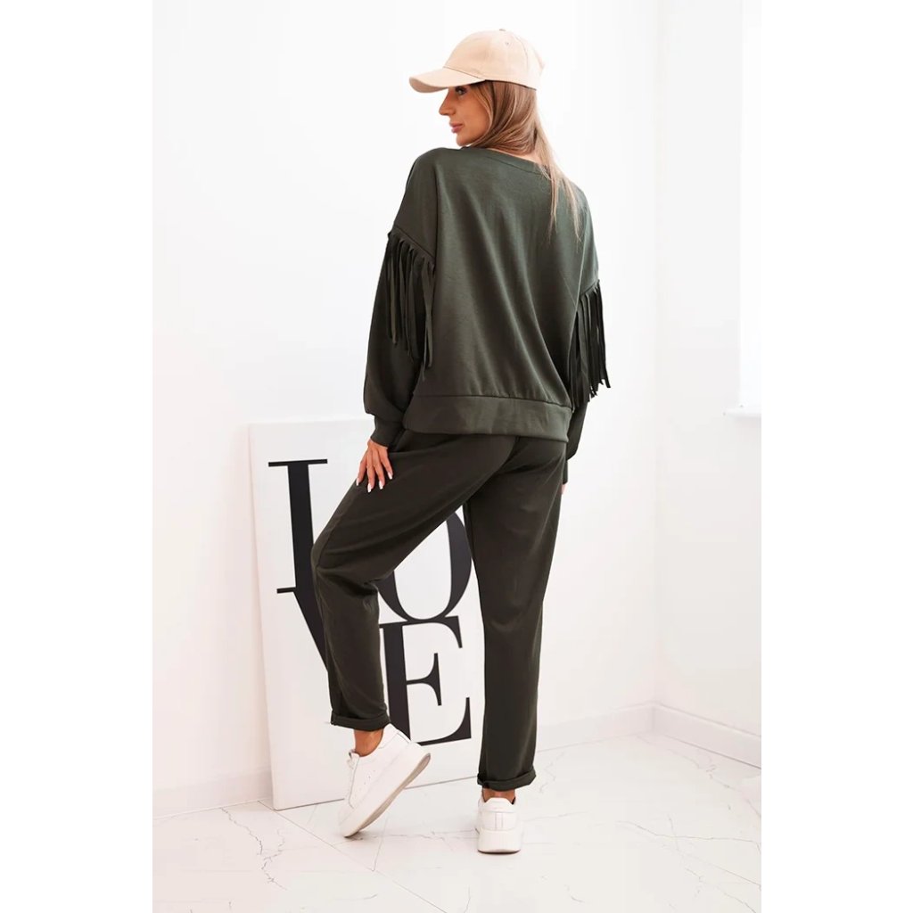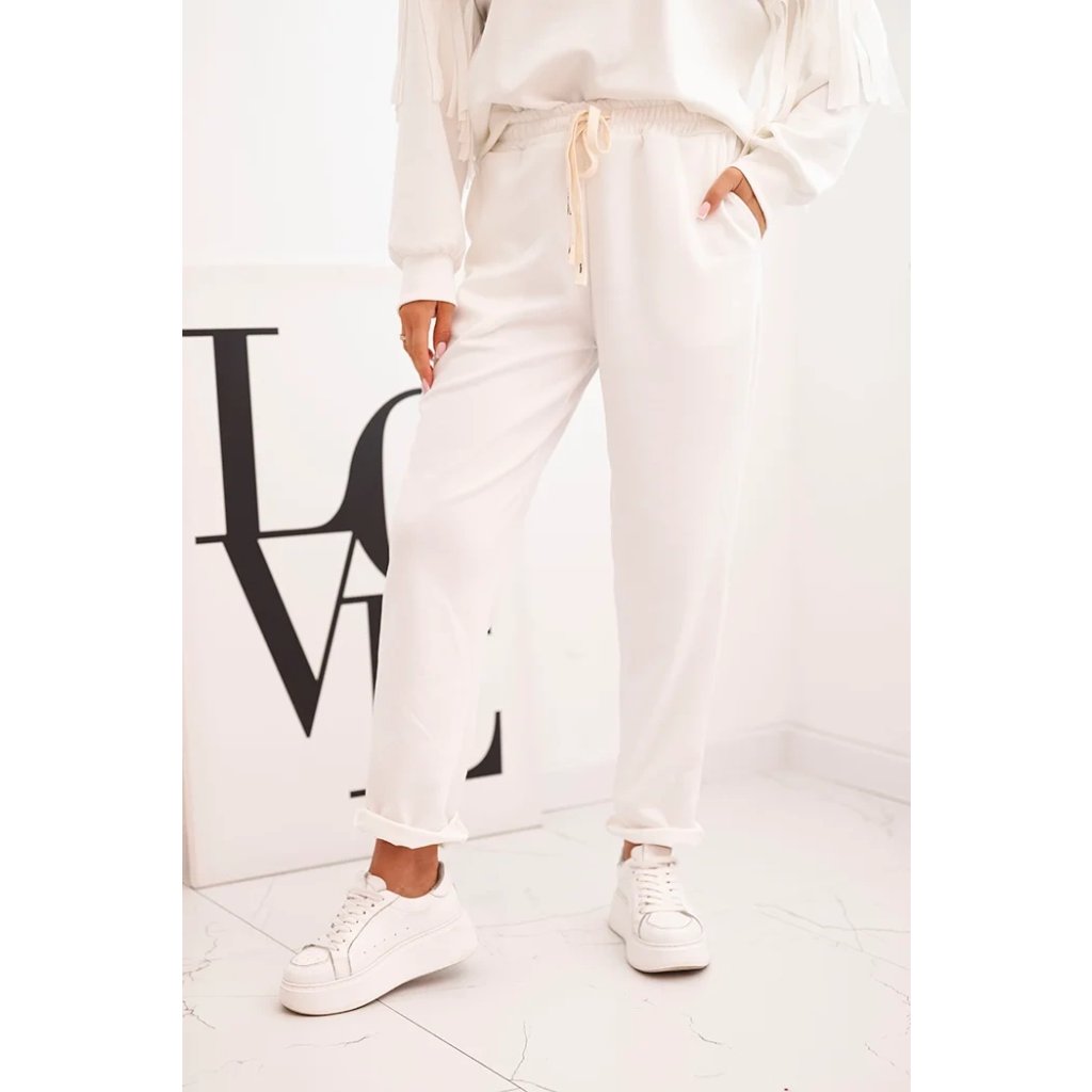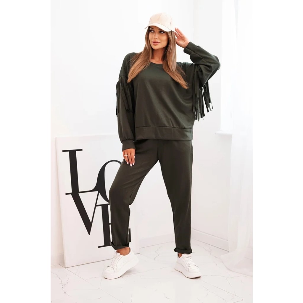 Elegantná dámska súprava v odtieni maslovom je spojením pohodlia a módneho dizajnu. Mikina vo voľnom strihu bola ozdobená efektnými strapcami na rukávoch, ktoré jej pridávajú výnimočný charakter. Vyrobená z príjemnej na dotyk, elastickej pleteniny, zabezpečuje voľnosť pohybu a komfort nosenia. Nohavice s elastickým pásom a reguláciou na šnúrku zaručujú ideálne prispôsobenie, a ich jednoduchý strih spôsobuje, že skvelo ladia s mikinou.