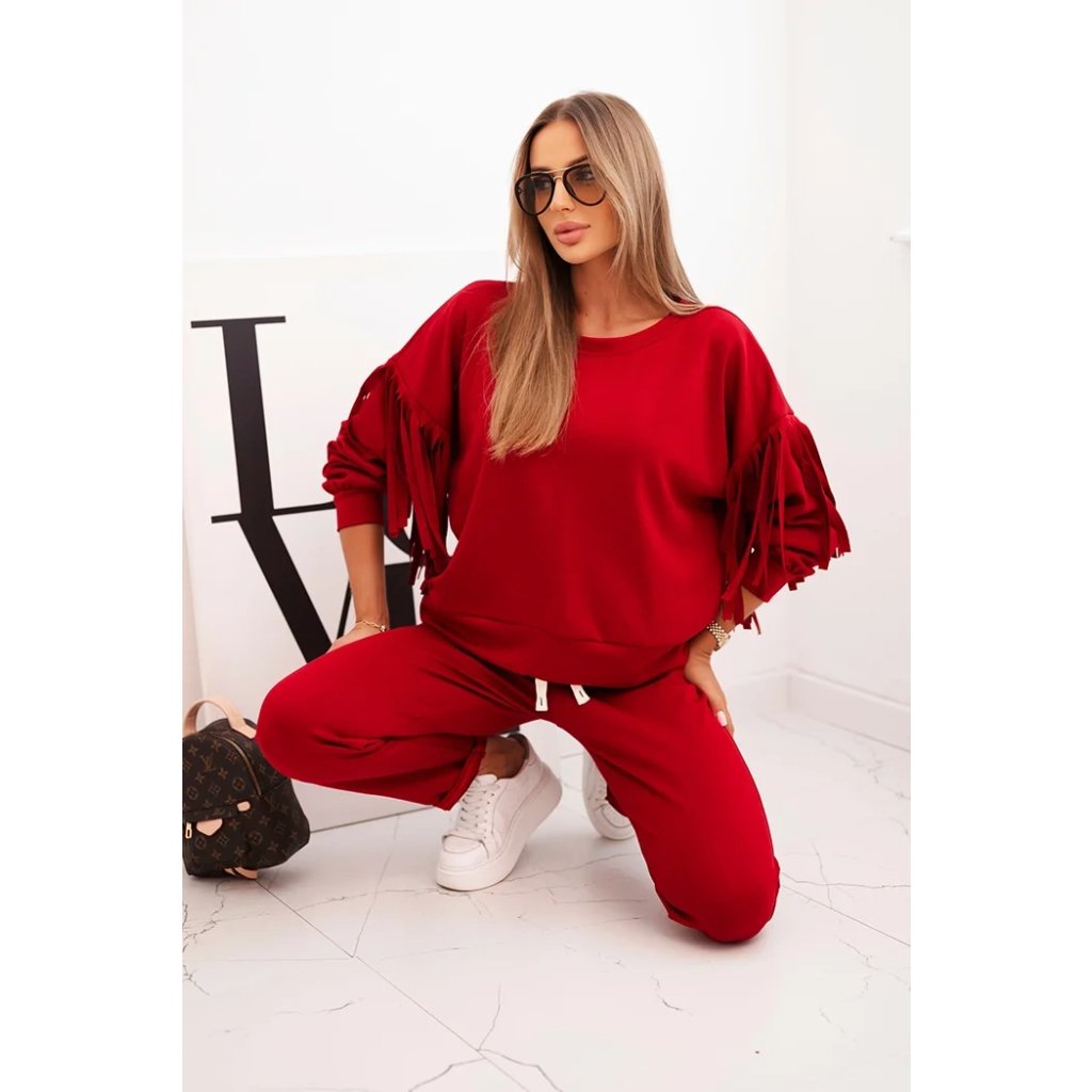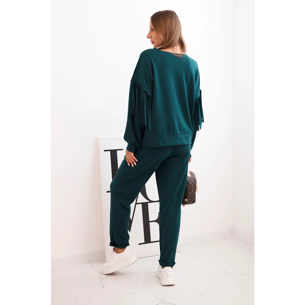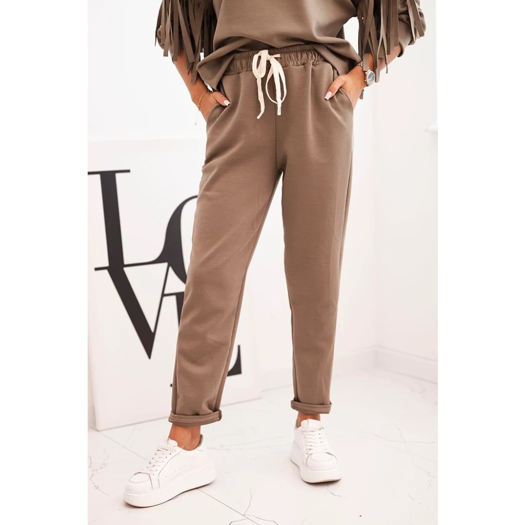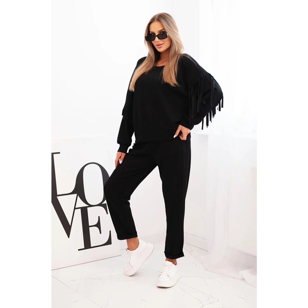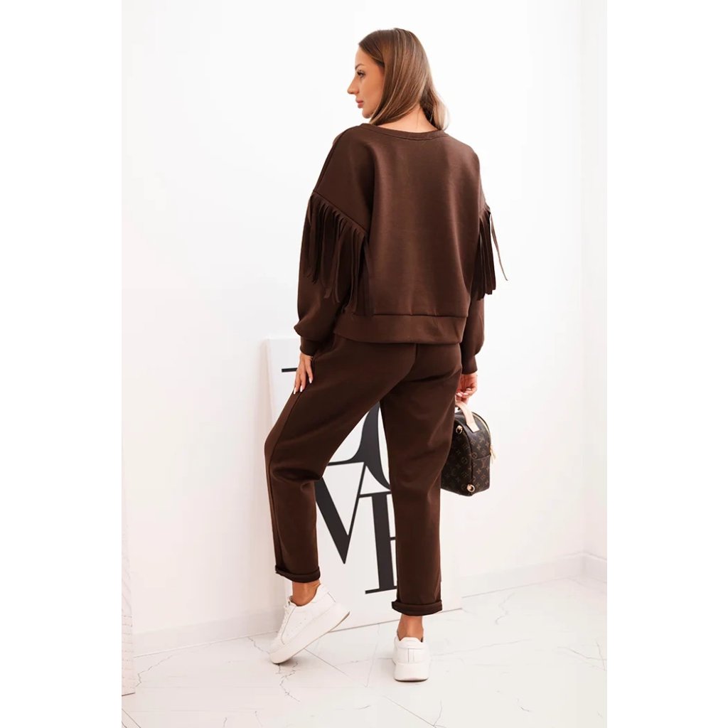 Elegantná dámska súprava v odtieni maslovom je spojením pohodlia a módneho dizajnu. Mikina vo voľnom strihu bola ozdobená efektnými strapcami na rukávoch, ktoré jej pridávajú výnimočný charakter. Vyrobená z príjemnej na dotyk, elastickej pleteniny, zabezpečuje voľnosť pohybu a komfort nosenia. Nohavice s elastickým pásom a reguláciou na šnúrku zaručujú ideálne prispôsobenie, a ich jednoduchý strih spôsobuje, že skvelo ladia s mikinou.