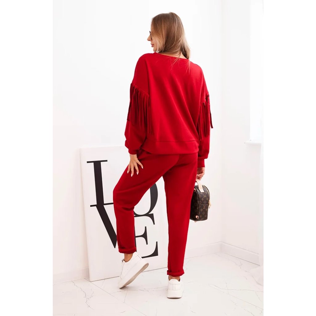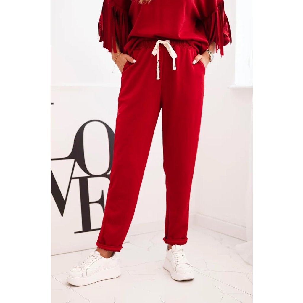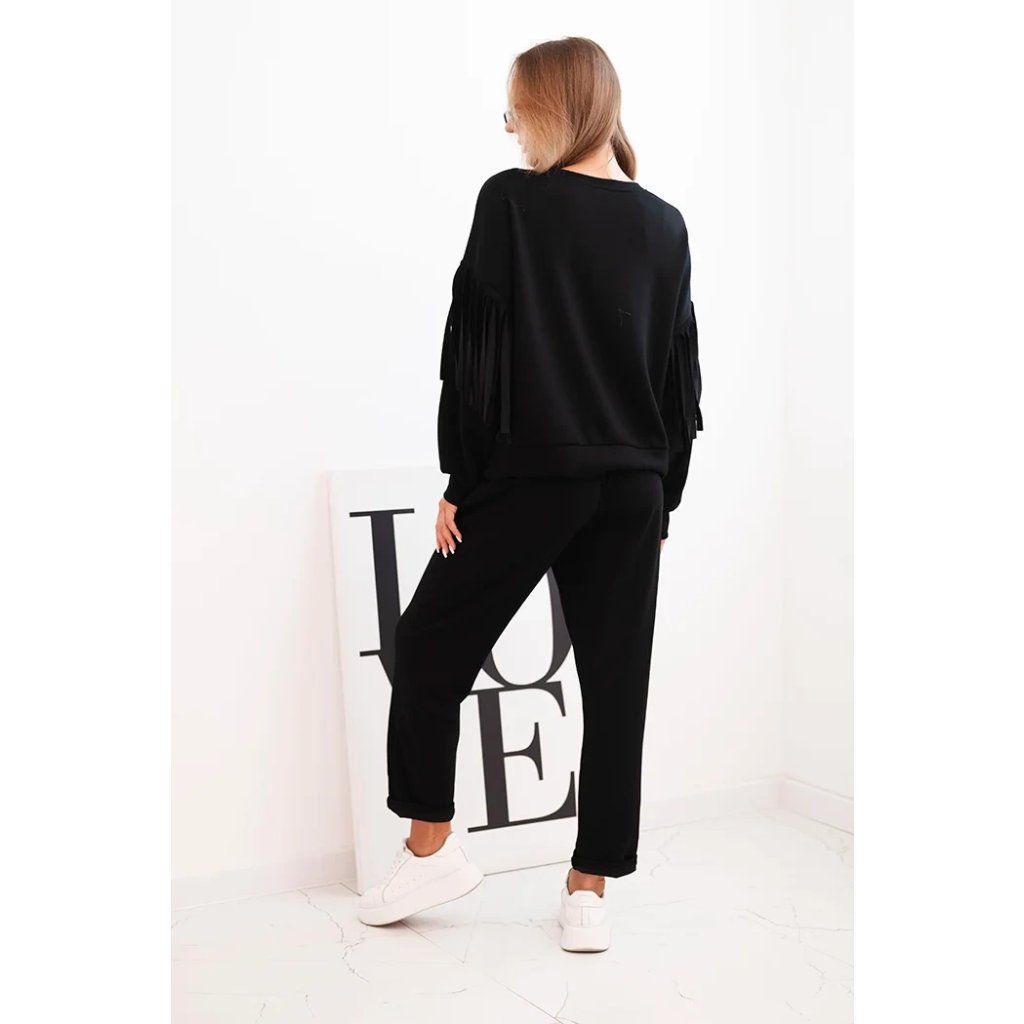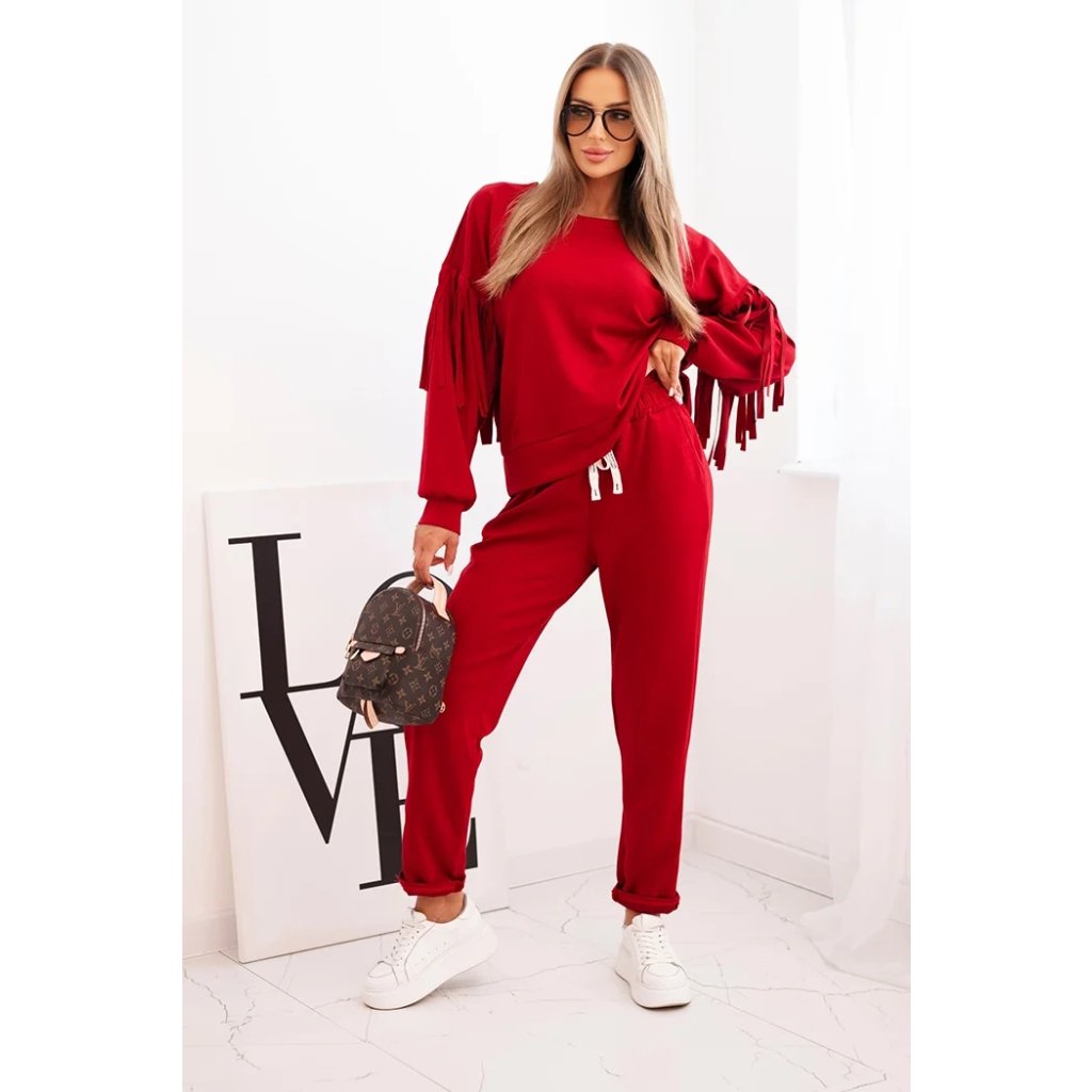 Elegantná dámska súprava v odtieni maslovom je spojením pohodlia a módneho dizajnu. Mikina vo voľnom strihu bola ozdobená efektnými strapcami na rukávoch, ktoré jej pridávajú výnimočný charakter. Vyrobená z príjemnej na dotyk, elastickej pleteniny, zabezpečuje voľnosť pohybu a komfort nosenia. Nohavice s elastickým pásom a reguláciou na šnúrku zaručujú ideálne prispôsobenie, a ich jednoduchý strih spôsobuje, že skvelo ladia s mikinou.