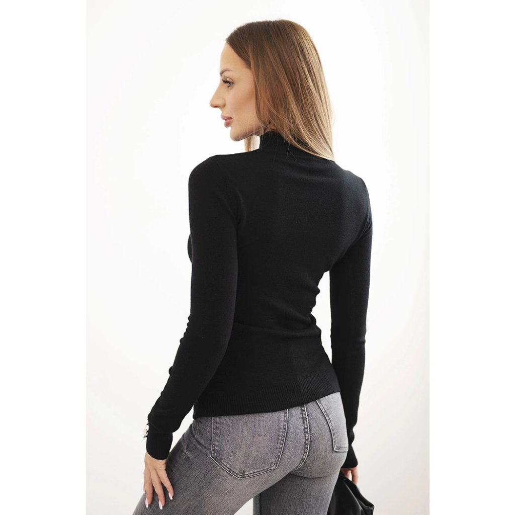 Elegantný dámsky sveter z viskózy je klasický kúsok šatníka, ktorý sa skvele hodí ako na každodenné, tak aj na formálnejšie outfity. Model má stojačik pri výstrihu a ozdobné zlaté gombíky na rukávoch, ktoré mu dodávajú eleganciu a jedinečný charakter.