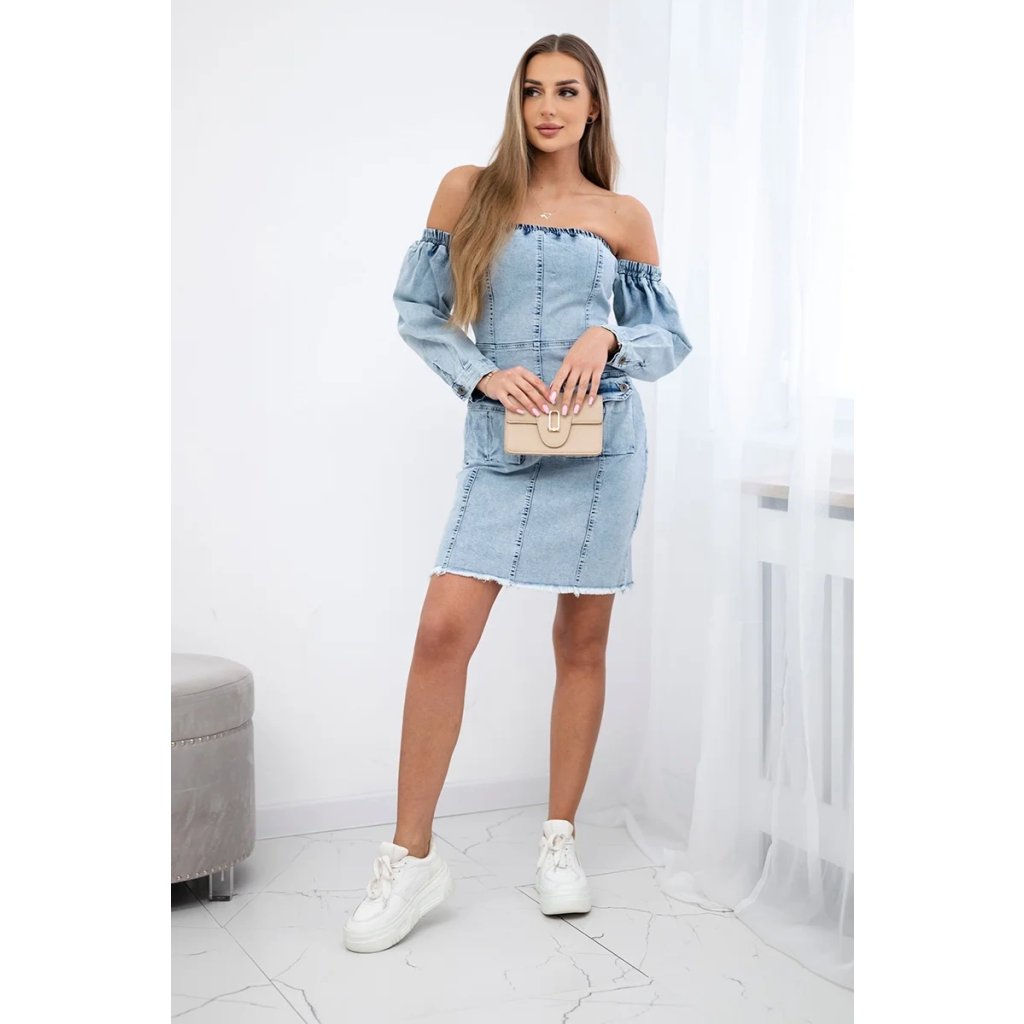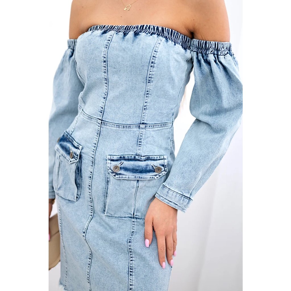 Predstavujeme vám rifľové šaty s odhalenými ramenami. Šaty majú našité vrecká vpredu. Vzadu zapínanie na zips. Skvelá ponuka pre všetky dámy. Šaty sú vyrobené z vysokokvalitného materiálu. Vďaka elastanu, ktorý materiál obsahuje, sú šaty pružné. Šaty sa predávajú v baleniach po 2 kusy. Veľkosti v balení S/M a L/XL.