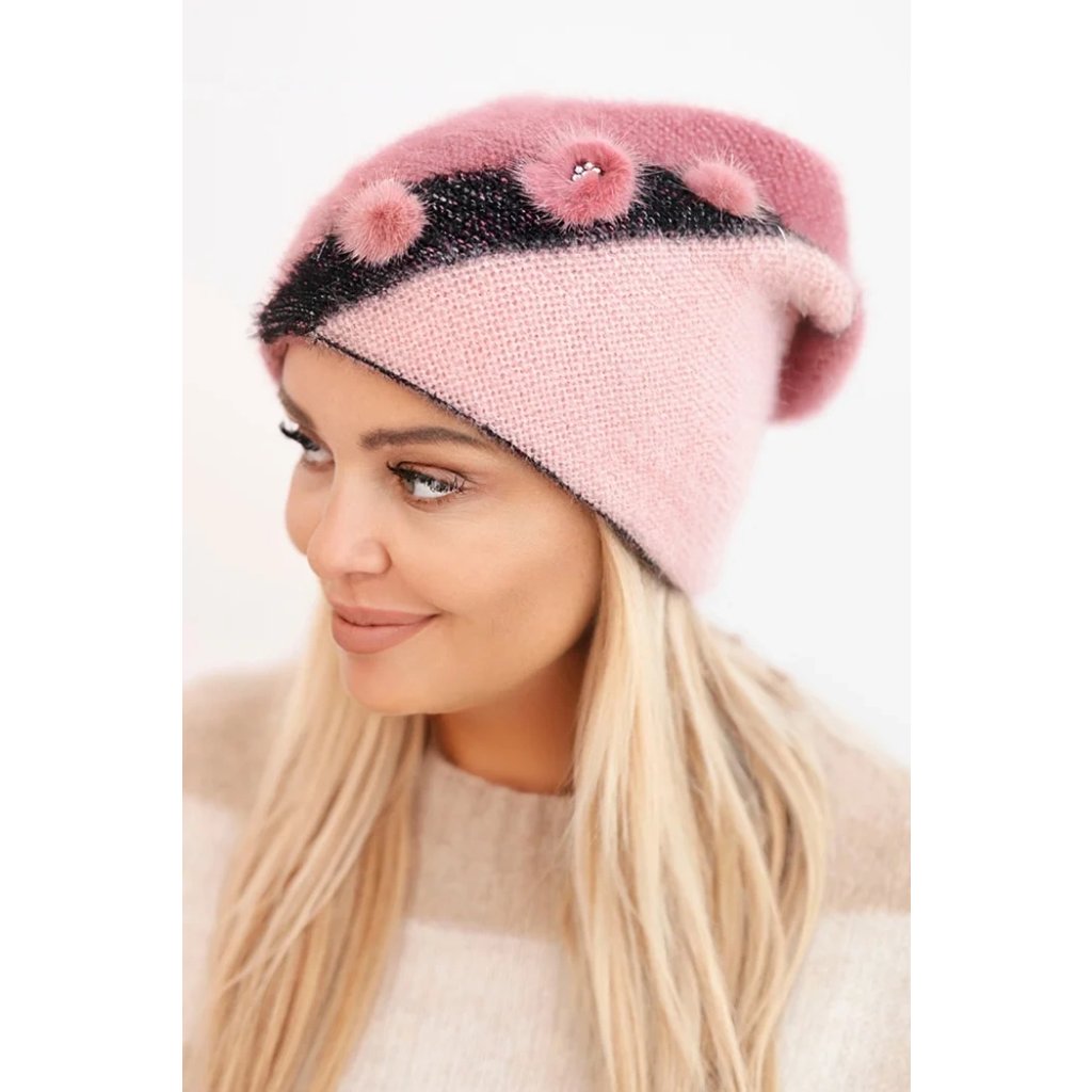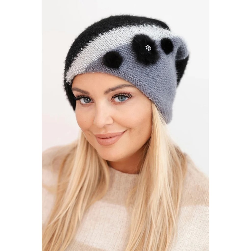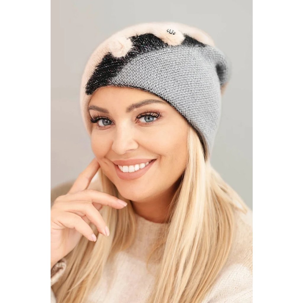 Elegantná dámska čiapka s krásnymi detailmi – ideálna na chladné dni. Vyznačuje sa jemným, brokátovým pásom a tromi ozdobami z kožušiny s lesklými kryštálmi.
