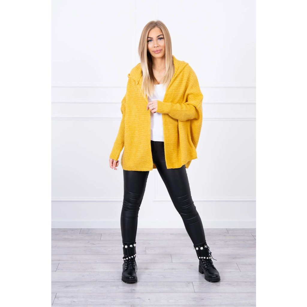 Horčicový sveter s kapucňou a netopierími rukávmi