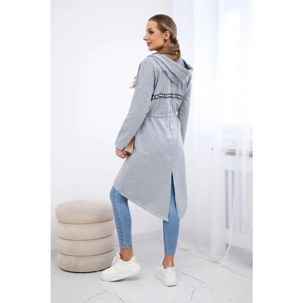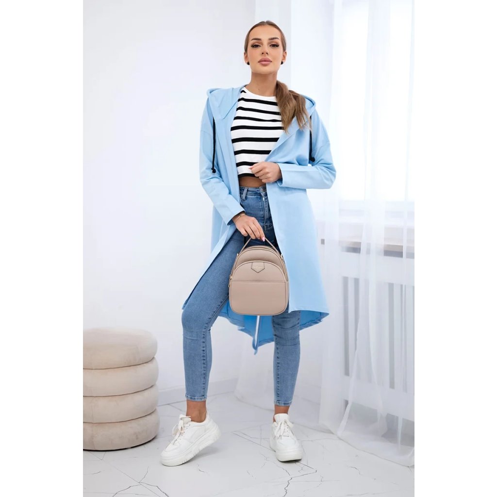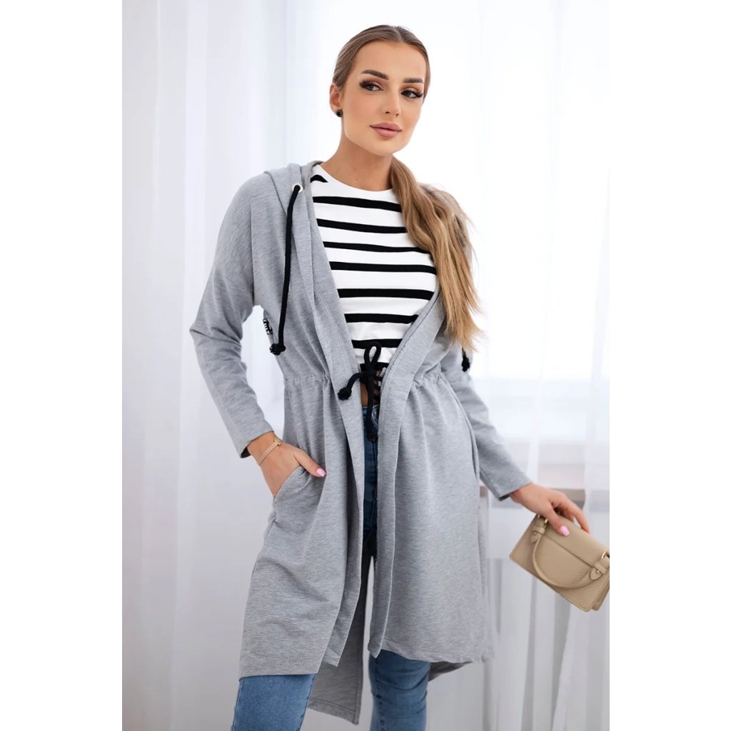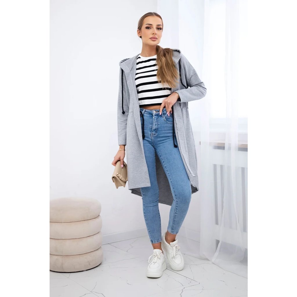 Predstavujeme vám dlhý prehoz s kapucňou. Prehoz má dlhší zadný diel a viazanie v páse. Navyše je na chrbte našitá ozdobná páska. Prehoz má vrecká. Prehoz je vyrobený z vysoko kvalitného materiálu. Veľkosť je univerzálna a bude vhodná pre dámy vo veľkostiach S, M a L.