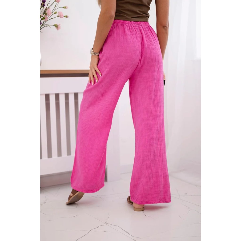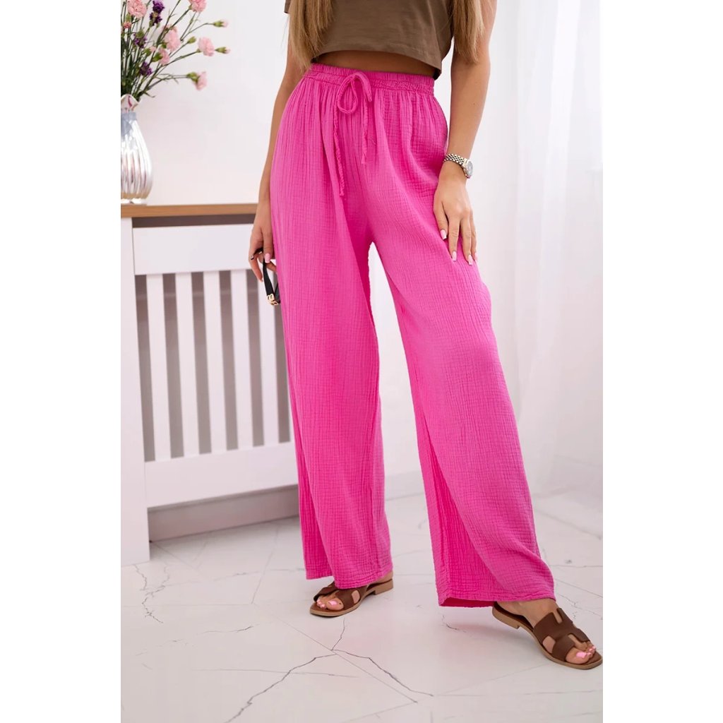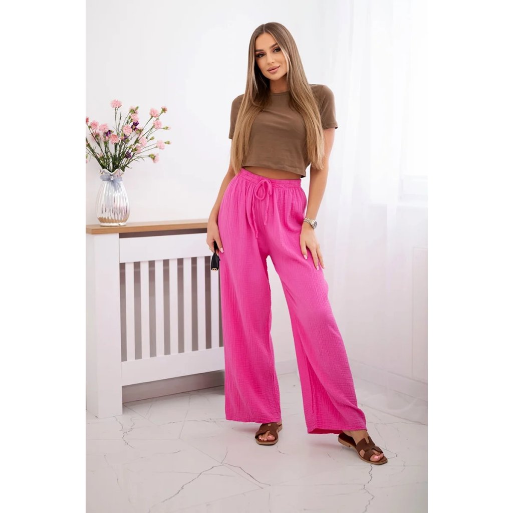 Objavte výnimočné nohavice vyrobené z jemného, vzdušného mušelínu, ktoré poskytujú nevídaný komfort nosenia aj v najteplejších dňoch. Ich široká nohavica dodáva celkovo módny, moderný charakter, opticky predĺžuje siluetu a dodáva štýlu ľahkosť. Ideálne na každý deň, do práce či na výnimočné príležitosti - tieto nohavice sa skvele hodia ku rôznym topom, od minimalistických tričiek, cez elegantné blúzky, až po svetre. Stavte na klasický, ale zároveň sofistikovaný dizajn, ktorý vám umožní užívať si komfort aj neobyčajný štýl. Veľkosť je univerzálna a pasuje pre ženy nosiace veľkosť S, M alebo L.