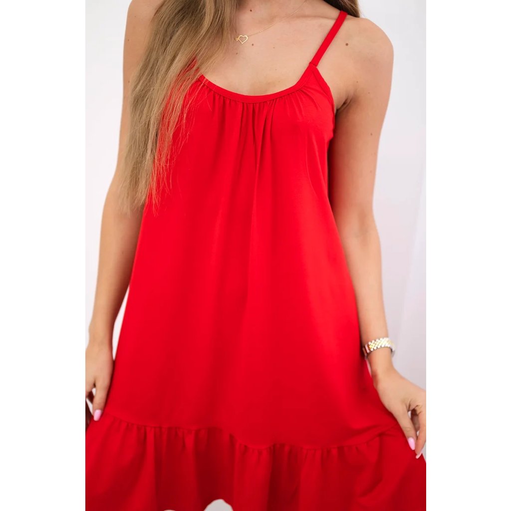 Predstavujeme vám módne šaty. Šaty na tenkých ramienkach, ktoré možno skrátiť zaviazaním. Šaty majú dole volánik. Šaty sú vyrobené z vysokokvalitného materiálu. Veľkosť je univerzálna a bude vhodná pre dámy nosiace veľkosť S, M alebo L.