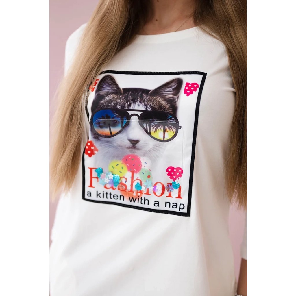 Šaty s 3D grafickou mačky ecru